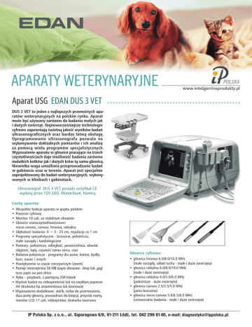 DUS 3 VET to jeden z najlepszych przenoœnych aparatów weterynaryjnych na polskim rynku. Aparat mo¿e byæ u¿ywany zarówno do badania ma³ych jak i du¿ych zwierz¹t. Najnowoczeœniejsze technologie cyfrowe zapewniaj¹ œwietn¹ jakoœæ wyników badañ ultrasonograficznych oraz bardzo ³atw¹ obs³ugê. Oprogramowanie ultrasonografu pozwala na wykonywanie dok³adnych pomiarów i ich analizê za pomoc¹ wielu programów specjalistycznych. Wyposa¿enie aparatu w g³owice pracuj¹ce na trzech czêstotliwoœciach daje mo¿liwoœæ badania zarówno malutkich kotków jak i du¿ych krów t¹ sama g³owic¹. Niewielka waga umo¿liwia przeprowadzanie badañ w gabinecie oraz w terenie. Aparat jest specjalnie zaprojektowany do badañ weterynaryjnych, wykonywanych w klinikach i gabinetach. Ultrasonograf DUS 3 VET posiada certyfikat CE wydany przez TÜV SÜD, Monachium, Niemcy. Cechy aparatu: • • • • Wszystkie funkcje aparatu w jêzyku polskim Procesor cyfrowy Monitor 10 cali, ze stabilnym obrazem G³owice wieloczêstotliwoœciowe: micro-convex, convex, liniowa, rektalna • G³êbokoœæ badania: 0 ~ 3 - 25 cm, regulacja co 1 cm • Programy specjalistyczne - brzuszne, po³o¿nicze, ma³e narz¹dy i kardiologiczne • Pomiary: po³o¿nicze, odleg³oœæ, powierzchnia, obwód, objêtoœæ, k¹ty, czêstoœæ rytmu serca, czas • Badania po³o¿nicze - programy dla psów, kotów, byd³a, koni, owiec i innych • Powiêkszenie w czasie rzeczywistym (zoom) • Pamiêæ wewnêtrzna 56 MB (zapis obrazów: .bmp lub .jpg) oraz zapis na pen-drive • Pêtla – playback, z pamiêci¹ 204 klatek • Wydruk badañ na videoprinterze lub na zwyk³ym papierze A4 (drukarka hp atramentowa lub laserowa) • Wyposa¿enie dodatkowe: stolik, torba do przenoszenia, dwa porty g³owicy, prowadnice do biopsji, przycisk no¿ny, monitor LCD 17 cali, videoprinter, drukarka laserowa G³owice cyfrowe: • g³owica liniowa 6.0/8.0/10.0 MHz (ma³e narz¹dy, uk³ad ruchu - ma³e i du¿e zwierzêta) • g³owica rektalna 6.0/8.0/10.0 MHz (ma³e i du¿e zwierzêta) • g³owica rektalna 4.0/5.0/6.0 MHz (po³o¿nicze - du¿e zwierzêta) • g³owica convex 2.5/3.5/5.0 MHz (jama brzuszna) • g³owica micro-convex 5.0/6.5/8.0 MHz (uniwersalne badania - ma³e i du¿e zwierzêta) Cechy aparatu: To œwietny elektrokardiograf, przeznaczonym do u¿ytku weterynaryjnego. Procesor cyfrowy oraz szereg cyfrowych filtrów gwarantuje szybkoœæ i dok³adnoœæ pomiarów. Tryb automatyczny rozwi¹zuje to co przy wykonywaniu badania w weterynarii jest najwiêkszym problemem - unieuruchomienie zwierzêcia do zapisu. Aparat, po zebraniu informacji do w³asnej pamiêci, wydrukowuje po chwili uporz¹dkowany ekagram (w sensie - wolny od zak³óceñ roboczych i artefaktów) z obliczonymi parametrami poszczególnych za³amków i czêstoœci¹ uderzeñ serca. To wszystko zapewnia komfort badaj¹cemu lekarzowi (nawet jeœli jest sam) i minimalny stres dla zwierzêcia, bo bezruch nie jest warunkiem koniecznym udanego badania. Ergonomicznie zaprojektowana obudowa, wbudowany akumulator i wbudowana drukarka, daj¹ mo¿liwoœæ wykonywania badania w dowolnym miejscu. Elektrokardiograf VE-300 posiada certyfikat CE wydany przez TÜV SÜD, Monachium, Niemcy. • Zwarta i ergonomiczna obudowa • Ekran ciek³okrystaliczny • Solidna klawiatura membranowa • Komplet filtrów cyfrowych: zak³óceñ miêœniowych, izolinii i zak³óceñ sieciowych • Tryb pracy: automatyczny lub rêczny • Wykrywanie i wyœwietlenie b³êdu pod³¹czenia elektrod • Wbudowana drukarka termiczna • Tryb kopiowania, pozwalaj¹cy na wydruk ostatniego ekagramu (auto) • Wbudowany akumulator litowy, do badañ w terenie • Wbudowana pamiêæ wewnêtrzna, zapis do 100 badañ • Wymiana danych: port USB, LAN i RS-232 • Wydruk EKG na drukarce zewnêtrznej • Kabel EKG weterynaryjny, 5 odprowadzeñ z krokodylkami • Program do komputera „Smart ECG Viewer” (opcja) • Waga: 2,5 kg (bez akumulatora), wymiary: 29 x 21 x 7 cm Pulsoksymetr przeznaczony jest do pewnego i skutecznego monitoringu pacjentów. Aparat, dziêki zastosowaniu nowoczesnych technologii, gwarantuje szybkoœæ i precyzyjnoœæ pomiarów nasycenia tlenem hemoglobiny têtniczej (SpO2) oraz czêstoœci pulsu. Posiada alarm niskiego i wysokiego poziomu badanych parametrów. Wbudowany g³oœnik emituje ton pracy serca co jest szczególnie wa¿ne przy zabiegach wykonywanych samodzielnie, bez asysty. Ergonomiczne i eleganckie wykonanie oraz niewielkie rozmiary zapewniaj¹ wygodê u¿ytkowania i mobilnoœæ. Pulsoksymetr H100B VET stanowi doskona³e wyposa¿enie klinik i gabinetów weterynaryjnych. Aparat posiada certyfikat CE wydany przez TÜV SÜD, Monachium, Niemcy. Cechy aparatu: • • • • • Menu w jêzyku polskim Du¿y ekran LCD, 128x64 pikseli Wyœwietlanie wykresów saturacji i czêstoœci pulsu z ostatnich 10 minut DŸwiêkowa sygnalizacja pracy serca Wbudowane alarmy dŸwiêkowe i wizualne: saturacji i czêstoœci pulsu, od³¹czenia czujnika, wyczerpania baterii • D³uga praca baterii - do 50 godzin przy u¿yciu 4 baterii AA lub akumulatorków Ni-MH • Kontrola podœwietlania ekranu oraz „Power off” automatyczne wy³¹czanie siê wyœwietlacza pozwalaj¹ce na oszczêdzenie baterii • Kompatybilnoœæ z czujnikami Nellcor, BCI oraz DB9 • Wbudowana pamiêæ wewnêtrzna, przechowywanie do 300 godzin badañ • Mo¿liwoœæ pod³¹czenie urz¹dzenia do komputera • Dwa klipsy w zestawie – wymiennie dla ma³ych i du¿ych zwierz¹t • Waga: 210 g (bez baterii), wymiary: 16 x 7 x 4 cm