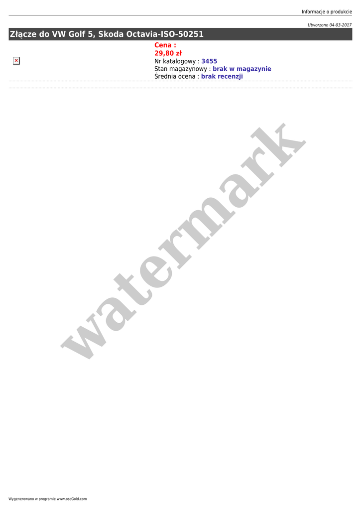Informacje o produkcie Utworzono 04-03-2017 Złącze do VW Golf 5, Skoda Octavia-ISO-50251 Cena : 29,80 zł w at er m ar k Nr katalogowy : 3455 Stan magazynowy : brak w magazynie Średnia ocena : brak recenzji Wygenerowano w programie www.oscGold.com