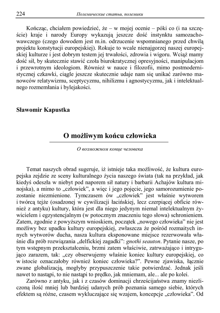Полемические статьи, полемики 224 Kończąc, chciałem powiedzieć, że – w mojej ocenie – póki co (i na szczęście) kraje i narody Europy wykazują jeszcze dość instynktu samozachowawczego (czego dowodem jest m.in. odrzucenie wspomnianego przed chwilą projektu konstytucji europejskiej). Rokuje to wcale nienajgorzej naszej europejskiej kulturze i jest dobrym testem jej trwałości, zdrowia i wigoru. Wciąż mamy dość sił, by skutecznie stawić czoła biurokratycznej opresyjności, manipulacjom i przewrotnym ideologiom. Również w nauce i filozofii, mimo postmodernistycznej czkawki, ciągle jeszcze skutecznie udaje nam się unikać zarówno manowców relatywizmu, sceptycyzmu, nihilizmu i agnostycyzmu, jak i intelektualnego rozmemłania i bylejakości. Sławomir Kapustka O możliwym końcu człowieka О возможном конце человека Temat naszych obrad sugeruje, iż istnieje taka możliwość, że kultura europejska zejdzie ze sceny kulturalnego życia naszego świata (tak na przykład, jak kiedyś odeszła w niebyt pod naporem sił natury i barbarii Achajów kultura minojska), a mimo to „człowiek”, a więc i jego pojęcie, jego samorozumienie pozostanie niezmienione. Tymczasem ów „człowiek” jest właśnie wytworem i twórcą tejże (osadzonej w cywilizacji łacińskiej, lecz czerpiącej obficie również z antyku) kultury, która jest dla niego jedynym niemal intelektualnym żywicielem i egzystencjalnym (w potocznym znaczeniu tego słowa) schronieniem. Zatem, zgodnie z powyższym wnioskiem, początek „nowego człowieka” nie jest możliwy bez upadku kultury europejskiej, zwłaszcza że pośród rozmaitych innych wytworów ducha, nasza kultura eksponowane miejsce rezerwowała właśnie dla prób rozwiązania „delfickiej zagadki”: gnothi seauton. Pytanie nasze, po tym wstępnym przekształceniu, brzmi zatem właściwie, zatrważająco i intrygująco zarazem, tak: „czy obserwujemy właśnie koniec kultury europejskiej, co w istocie oznaczałoby również koniec człowieka?”. Pewne zjawiska, łącznie zwane globalizacją, mogłyby przypuszczenie takie potwierdzać. Jednak jeśli nawet to nastąpi, to nie nastąpi to prędko, jak mniemam, ale... ale po kolei. Zarówno z antyku, jak i z czasów dominacji chrześcijaństwa znamy niezliczoną ilość mniej lub bardziej udanych prób poznania samego siebie, których efektem są różne, czasem wykluczające się wzajem, koncepcje „człowieka”. Od Artykuły polemiczne, polemiki 225 tych osadzonych w myśleniu magicznym, wyrosłych na gruncie mitów, przez religijne projekty dzieci bożych i ewolucyjną teorię wybitnie zdolnego ssaka napędzanego przez nieuświadomione popędy, aż po ambitne (bliskie piszącemu te słowa) próby uczynienia z zagubionej we wszechświecie istoty autonomicznego, wolnego i w pełni odpowiedzialnego, racjonalnego podmiotu – „człowieka” właśnie. Naturalnie, można się w nieskończoność spierać, przytaczając całą masę argumentów za i przeciw poszczególnym koncepcjom, dowodząc wyższości jednej koncepcji nad inną. Przyznać jednak musimy, że poza sporem pozostaje fakt, iż żadna z wymienionych (i niewymienionych) koncepcji nie jest tak powszechnie olśniewająca i intelektualnie zniewalająca, aby nie można było mieć wątpliwości co do jej pełnej adekwatności. W istocie jednak stajemy dziś, tak jak i dawniej, nadzy przed naszym antropologicznym krzywym zwierciadłem, wciąż nieporadni i pełni wątpliwości, choć uposażeni przecież w niezmierzone bogactwo naukowych odkryć i teorii. Wydaje się nam niekiedy, iż sporo już wiemy o sobie, jednak byłoby to możliwe tylko wtedy, gdybyśmy wprzód założyli, iż naukowe poznanie jest pewne, w pełni wyczerpuje ono nasze potrzeby poznawcze, i że naukowa perspektywa wypełnia całość rzeczywistości. To jednak jest, czy bywa raczej przedmiotem najcięższych, brzemiennych w swoiste niezaspokojenie wątpliwości i wielowiekowych sporów. W związku z tym warto byłoby postawić sobie takie pytanie: czy grecki bóg poprzez swoje śmiertelne medium postawił przed nami niewykonalne zadanie? Albo inaczej jeszcze: „czy potrafimy zrozumieć i zaakceptować samych siebie niewplecionych w celową i moralną historię świata; pojąć siebie jako przypadkowych, chwilowych i nieistotnych właściwie przekaźników DNA?”. Wydaje się to niepodobieństwem po tym wszystkim czego już dokonał (i czego jeszcze zapewne dokona) ten zwinny ssak, zwłaszcza po tym jak nauczył się stawiać pytania (również te, na które nie znajduje wciąż satysfakcjonującej go odpowiedzi), pytania, które stymulują przecież proces rozwoju kultury i nauki. Choć odpowiedzi twierdzącej na drugie z powyżej postawionych pytań nie możemy a limine odrzucić, to – za Wittgensteinem – uznać jednak musimy fakt bezsporny, to mianowicie, iż: „(...) gdyby nawet rozwiązano wszelkie możliwe zagadnienia naukowe, to nasze problemy życiowe nie zostałyby jeszcze nawet tknięte”1. Inną sprawą jest już jednak sama możliwość jednoznacznego rozstrzygnięcia tego, czy ów palący „życiowy problem człowieka” jest skutkiem projekcji w rzeczywistość naszego myślenia życzeniowego, czy też jest on przejawem transcendentnej rzeczywistości i transcendentalnej natury „człowieka”? Ewentualna odpowiedź na tę wątpliwość wymagałaby jednak zajęcia jednoznacznego stanowiska również w stosunku do powyższego pytania i pozostaje w związku z tym, tak jak i owo pytanie, bez jednoznacznej odpowiedzi. Nawet 1 L. Wittgenstein, Tractatus logico-philosophicus, przeł. B. Wolniewicz, Warszawa 2004, s. 82. Полемические статьи, полемики 226 bowiem przyjęcie pierwszej możliwości, czyli projekcji życzeń do rzeczywistości (wynikającej, powiedzmy, ze strachu przed śmiercią), nie wyjaśni nam przecież skąd wzięła się w ogóle możliwość dokon