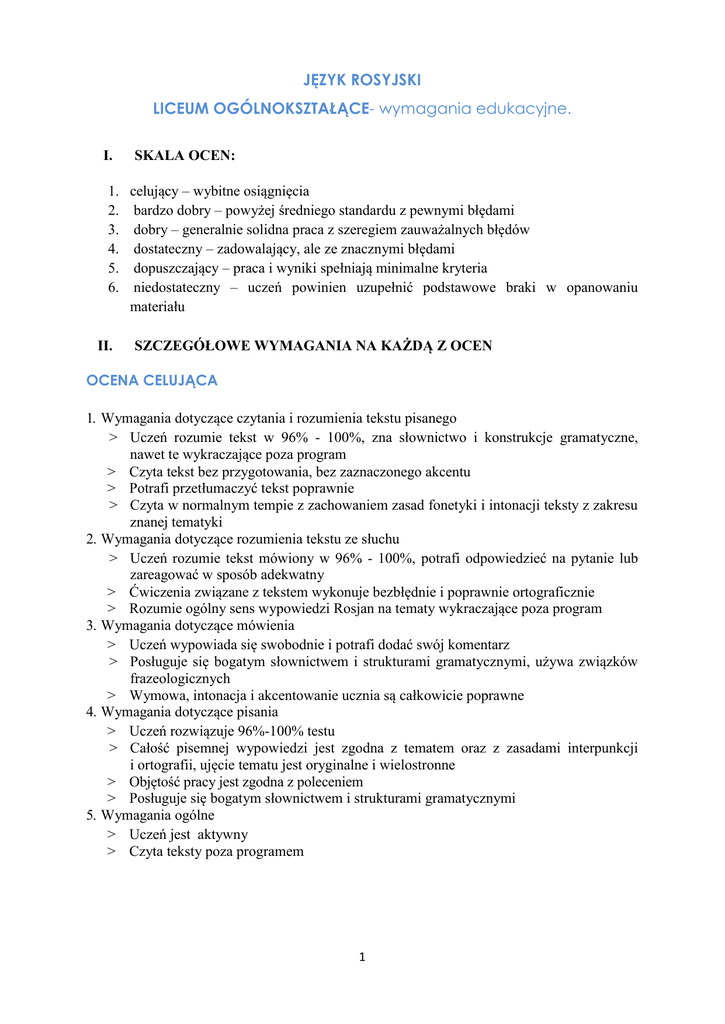 JĘZYK ROSYJSKI LICEUM OGÓLNOKSZTAŁĄCE- wymagania edukacyjne. I. 1. 2. 3. 4. 5. 6. II. SKALA OCEN: celujący – wybitne osiągnięcia bardzo dobry – powyżej średniego standardu z pewnymi błędami dobry – generalnie solidna praca z szeregiem zauważalnych błędów dostateczny – zadowalający, ale ze znacznymi błędami dopuszczający – praca i wyniki spełniają minimalne kryteria niedostateczny – uczeń powinien uzupełnić podstawowe braki w opanowaniu materiału SZCZEGÓŁOWE WYMAGANIA NA KAŻDĄ Z OCEN OCENA CELUJĄCA 1. Wymagania dotyczące czytania i rozumienia tekstu pisanego > Uczeń rozumie tekst w 96% - 100%, zna słownictwo i konstrukcje gramatyczne, nawet te wykraczające poza program > Czyta tekst bez przygotowania, bez zaznaczonego akcentu > Potrafi przetłumaczyć tekst poprawnie > Czyta w normalnym tempie z zachowaniem zasad fonetyki i intonacji teksty z zakresu znanej tematyki 2. Wymagania dotyczące rozumienia tekstu ze słuchu > Uczeń rozumie tekst mówiony w 96% - 100%, potrafi odpowiedzieć na pytanie lub zareagować w sposób adekwatny > Ćwiczenia związane z tekstem wykonuje bezbłędnie i poprawnie ortograficznie > Rozumie ogólny sens wypowiedzi Rosjan na tematy wykraczające poza program 3. Wymagania dotyczące mówienia > Uczeń wypowiada się swobodnie i potrafi dodać swój komentarz > Posługuje się bogatym słownictwem i strukturami gramatycznymi, używa związków frazeologicznych > Wymowa, intonacja i akcentowanie ucznia są całkowicie poprawne 4. Wymagania dotyczące pisania > Uczeń rozwiązuje 96%-100% testu > Całość pisemnej wypowiedzi jest zgodna z tematem oraz z zasadami interpunkcji i ortografii, ujęcie tematu jest oryginalne i wielostronne > Objętość pracy jest zgodna z poleceniem > Posługuje się bogatym słownictwem i strukturami gramatycznymi 5. Wymagania ogólne > Uczeń jest aktywny > Czyta teksty poza programem 1 OCENA BARDZO DOBRA Wymagania dotyczące czytania i rozumienia tekstu pisanego > Uczeń rozumie tekst w całości, zna słownictwo i konstrukcje gramatyczne w ramach programu > Czyta teksty podręcznikowe płynnie i poprawnie > Potrafi przetłumaczyć tekst poprawną polszczyzną > Poprawnie wyszukuje informacje w tekstach podręcznikowych i powszechnie znanych dokumentach 2. Wymagania dotyczące rozumienia tekstu ze słuchu > Uczeń rozumie tekst mówiony całkowicie, potrafi odpowiedzieć na pytanie lub zareagować w sposób adekwatny > Ćwiczenia związane z tekstem wykonuje bezbłędnie i poprawnie ortograficznie > Uczeń rozumie wszystkie komunikaty i wypowiedzi nauczyciela i kolegów 3. Wymagania dotyczące mówienia > Uczeń wypowiada się płynnie > Posługuje się bogatym słownictwem i strukturami gramatycznymi w ramach programu > Wymowa, intonacja i akcentowanie ucznia są poprawne > Uczeń popełnia drobne błędy gramatyczno-leksykalne, nie zakłócające odbioru wypowiedzi 4. Wymagania dotyczące pisania > Uczeń rozwiązuje 95%-91% testu > Całość pisemnej wypowiedzi jest zgodna z tematem oraz z zasadami interpunkcji i ortografii > Objętość pracy jest zgodna z poleceniem > Posługuje się bogatym słownictwem i strukturami gramatycznymi 1. OCENA DOBRA 1. Wymagania dotyczące czytania i rozumienia tekstu pisanego > Uczeń rozumie tekst, chociaż może nie znać poszczególnych słów, rozpoznaje konstrukcje gramatyczne > Potrafi przetłumaczyć tekst, chociaż niektóre zdania sprawiają mu trudność > Ćwiczenia związane z tekstem wykonuje z drobnymi błędami > Czyta dość płynnie, stosuje zasady akcentowania i intonacji 2. Wymagania dotyczące rozumienia tekstu ze słuchu > Uczeń rozumie tekst mówiony, potrafi odpowiedzieć na pytanie lub zareagować z niewielkimi błędami > Ćwiczenia związane z tekstem wykonuje z niewielkimi błędami gramatycznymi i ortograficznymi > Uczeń rozumie komunikaty i wypowiedzi nauczyciela i kolegów 3. Wymagania dotyczące mówienia > Uczeń wypowiada się ogólnie poprawnie, wypowiedź jest ściśle związana z materiałem podręcznikowym > Posługuje się słownictwem i strukturami gramatycznymi w ramach programu > Uczeń popełnia błędy gramatyczno-leksykalne, nie zakłócające odbioru wypowiedzi 2 > Modyfikuje dialog wg wzoru 4. Wymagania dotyczące pisania > Uczeń rozwiązuje 90%-75% testu > Całość pisemnej wypowiedzi jest zgodna z tematem, ujęcie tematu jest schematyczne > Uczeń używa słownictwa i struktur gramatycznych adekwatnych do zagadnienia > Uczeń popełnia błędy gramatyczne i ortograficzne, które nie zakłócają rozumienia tekstu OCENA DOSTATECZNA 1. Wymagania dotyczące czytania i rozumienia tekstu pisanego > Uczeń rozumie ogólny sens tekstu i jest w stanie odpowiedzieć na pytania związane z tekstem, ale nie potrafi wykonać zadań bardziej skomplikowanych > Nie potrafi przetłumaczyć poprawnie całych zdań, chociaż rozumie poszczególne słowa > Ćwiczenia związane z tekstem wykonuje z błędami > Czyta w zwolnionym tempie fragmenty opracowanego tekstu 2. Wymagania dotyczące rozumienia tekstu ze słuchu > Uczeń rozumie ogólny sens wypowiedzi, nie potrafi odpowiedzieć na pytanie lub zareagować właściwie > Rozumie większość poleceń i reaguje na nie > Uczeń potrafi wykonać tylko niektóre zadania związane z tekstem 3. Wymagania dotyczące mówienia > Wypowiedź jest komunikatywna, ale niepełna; konieczne są dodatkowe pytania nauczyciela > Posługuje się prostym słownictwem i strukturami gramatycznymi na poziomie podstawowym > Uczeń popełnia błędy gramatyczno-leksykalne, zakłócające często odbiór wypowiedzi 4. Wymagania dotyczące pisania > Uczeń rozwiązuje 74%-51% testu > Całość pisemnej wypowiedzi jest częściowo zgodna z tematem, ujęcie tematu jest schematyczne i nie wyczerpuje zagadnienia > Objętość pracy jest niezgodna z poleceniem > Uczeń popełnia błędy gramatyczne i ortograficzne, które zakłócają rozumienie tekstu > Uczeń używa słownictwa i struktur grama