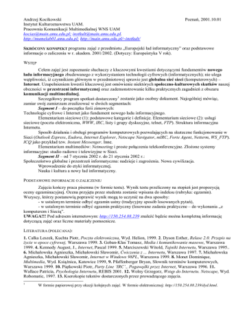 Andrzej Kocikowski Instytut Kulturoznawstwa UAM. Pracownia Komunikacji Multimedialnej WNS UAM [email protected]; [email protected]. http://mumelab01.amu.edu.pl; http://main.amu.edu.pl/~instkult/ Poznań, 2001.10.01 SKRÓCONY KONSPEKT programu zajęć z przedmiotu „Europejski ład informatyczny” oraz podstawowe informacje o zaliczeniu w r. akadem. 2001/2002. (Dotyczy: Europeistyka V rok). WSTĘP Celem zajęć jest zapoznanie słuchaczy z kluczowymi kwestiami dotyczącymi fundamentów nowego ładu informacyjnego zbudowanego z wykorzystaniem technologii cyfrowych (informatycznych); nie ulega wątpliwości, iż czynnikiem głównym w przedmiotowej sprawie jest globalna sieć sieci (komputerowych) – Internet. Uzupełnieniem kwestii kluczowej jest omówienie niektórych społeczno-kulturowych skutków naszej obecności w przestrzeni informatycznej oraz zademonstrowanie kilku praktycznych zagadnień z obszaru komunikacji multimedialnej. Szczegółowy program spotkań dostarczony1 zostanie jako osobny dokument. Najogólniej mówiąc, zamiar swój zamierzam zrealizować w dwóch segmentach: Segment I – do początku ferii zimowych: Technologie cyfrowe i Internet jako fundament nowego ładu informacyjnego. Elementarium sieciowe (1): podstawowe kategorie i definicje. Elementarium sieciowe (2): usługi sieciowe (poczta elektroniczna, WWW, IRC, listy i grupy dyskusyjne, telnet, FTP). Struktura informacyjna Internetu. Sposób działania i obsługi programów komputerowych pozwalających na skuteczne funkcjonowanie w Sieci (Outlook Express, Eudora, Internet Explorer, Netscape Navigator, mIRC, Forte Agent, Netterm, WS_FTP). ICQ jako przykład tzw. Instant Messenger. Inne. Elementarium multimediów: Netmeeting i proste połączenia telekonferencyjne. Złożone systemy informacyjne: studio radiowe i telewizyjne w Sieci. Segment II – od 7 stycznia 2002 r. do 21 stycznia 2002 r.: Społeczeństwo globalne i przestrzeń informatyczna: nadzieje i zagrożenia. Nowa cywilizacja. Wprowadzenie do etyki informatycznej. Nauka i kultura a nowy ład informatyczny. PODSTAWOWE INFORMACJE O ZALICZENIU Zajęcia kończy praca pisemna (w formie testu). Wynik testu przeliczony na stopień jest propozycją oceny egzaminacyjnej. Ocena przyjęta przez studenta zostanie wpisana do indeksu (rubryka: egzamin). Wszyscy, którzy postanowią poprawić wynik mogą to uczynić na dwa sposoby: - w ustalonym terminie odbyć egzamin ustny (tradycyjny sposób losowanych pytań), - w ustalonym terminie odbyć egzamin praktyczny (losowane zadania praktyczne – do wykonania „z komputerem i Siecią”. UWAGA!!! Pod adresem internetowym: http://150.254.88.239 znaleźć będzie można kompletną informację dotyczącą zajęć oraz liczne materiały pomocnicze. LITERATURA (POLECANA): 1. Całka Leszek, Kuchta Piotr, Poczta elektroniczna, Wyd. Helion, 1999. 2. Dyson Esther, Relase 2.0. Przepis na życie w epoce cyfrowej, Warszawa 1999. 3. Goban-Klas Tomasz, Media i komunikowanie masowe, Warszawa 1999. 4. Kennedy August, J., Internet, Pascal 1999. 5. Marciszewski Witold, Tajniki Internetu, Warszawa 1995.. 6. Michałowska Agnieszka, Michałowski Sławomir, Ćwiczenia z ... Internetu, Warszawa 1997. 7. Michałowska Agnieszka, Michałowski Sławomir, Internet w Windows 98PL, Warszawa 1999. 8. Monet Dominique, Multimedia, Wyd. Książnica, Katowice 1999, 9. Pfaffenberger Bryan, Słownik terminów komputerowych, Warszawa 1999. 10. Piątkowski Piotr, Party Line ‘IRC’., Pogawędki przez Internet, Warszawa 1996. 11. Wallace Patricia, Psychologia Internetu, REBIS 2001. 12. Wolny Grzegorz, Wstęp do Internetu. Netscape, Wyd. Robomatic, 1997. 13. Kserokopie tekstów dostarczonych przez prowadzącego zajęcia. 1 W formie papierowej przy okazji kolejnych zajęć. W formie elektronicznej: http://150.254.88.239/dyd.html.