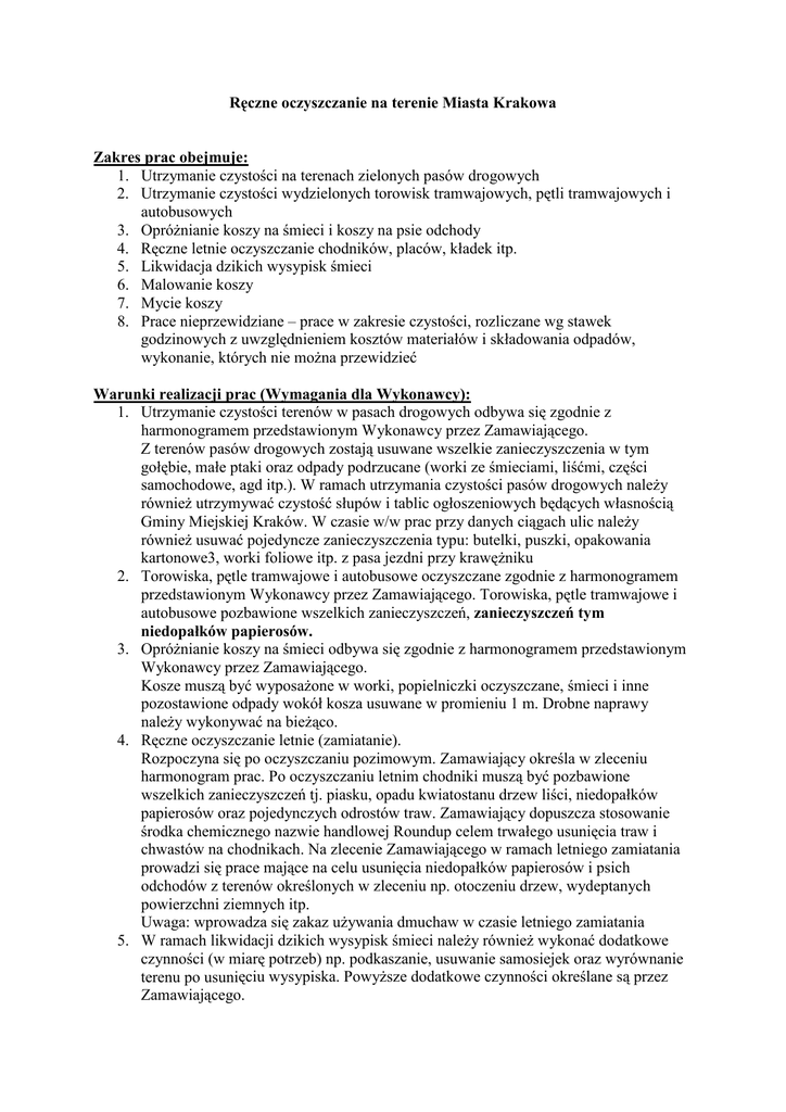 Ręczne oczyszczanie na terenie Miasta Krakowa Zakres prac obejmuje: 1. Utrzymanie czystości na terenach zielonych pasów drogowych 2. Utrzymanie czystości wydzielonych torowisk tramwajowych, pętli tramwajowych i autobusowych 3. OpróŜnianie koszy na śmieci i koszy na psie odchody 4. Ręczne letnie oczyszczanie chodników, placów, kładek itp. 5. Likwidacja dzikich wysypisk śmieci 6. Malowanie koszy 7. Mycie koszy 8. Prace nieprzewidziane – prace w zakresie czystości, rozliczane wg stawek godzinowych z uwzględnieniem kosztów materiałów i składowania odpadów, wykonanie, których nie moŜna przewidzieć Warunki realizacji prac (Wymagania dla Wykonawcy): 1. Utrzymanie czystości terenów w pasach drogowych odbywa się zgodnie z harmonogramem przedstawionym Wykonawcy przez Zamawiającego. Z terenów pasów drogowych zostają usuwane wszelkie zanieczyszczenia w tym gołębie, małe ptaki oraz odpady podrzucane (worki ze śmieciami, liśćmi, części samochodowe, agd itp.). W ramach utrzymania czystości pasów drogowych naleŜy równieŜ utrzymywać czystość słupów i tablic ogłoszeniowych będących własnością Gminy Miejskiej Kraków. W czasie w/w prac przy danych ciągach ulic naleŜy równieŜ usuwać pojedyncze zanieczyszczenia typu: butelki, puszki, opakowania kartonowe3, worki foliowe itp. z pasa jezdni przy krawęŜniku 2. Torowiska, pętle tramwajowe i autobusowe oczyszczane zgodnie z harmonogramem przedstawionym Wykonawcy przez Zamawiającego. Torowiska, pętle tramwajowe i autobusowe pozbawione wszelkich zanieczyszczeń, zanieczyszczeń tym niedopałków papierosów. 3. OpróŜnianie koszy na śmieci odbywa się zgodnie z harmonogramem przedstawionym Wykonawcy przez Zamawiającego. Kosze muszą być wyposaŜone w worki, popielniczki oczyszczane, śmieci i inne pozostawione odpady wokół kosza usuwane w promieniu 1 m. Drobne naprawy naleŜy wykonywać na bieŜąco. 4. Ręczne oczyszczanie letnie (zamiatanie). Rozpoczyna się po oczyszczaniu pozimowym. Zamawiający określa w zleceniu harmonogram prac. Po oczyszczaniu letnim chodniki muszą być pozbawione wszelkich zanieczyszczeń tj. piasku, opadu kwiatostanu drzew liści, niedopałków papierosów oraz pojedynczych odrostów traw. Zamawiający dopuszcza stosowanie środka chemicznego nazwie handlowej Roundup celem trwałego usunięcia traw i chwastów na chodnikach. Na zlecenie Zamawiającego w ramach letniego zamiatania prowadzi się prace mające na celu usunięcia niedopałków papierosów i psich odchodów z terenów określonych w zleceniu np. otoczeniu drzew, wydeptanych powierzchni ziemnych itp. Uwaga: wprowadza się zakaz uŜywania dmuchaw w czasie letniego zamiatania 5. W ramach likwidacji dzikich wysypisk śmieci naleŜy równieŜ wykonać dodatkowe czynności (w miarę potrzeb) np. podkaszanie, usuwanie samosiejek oraz wyrównanie terenu po usunięciu wysypiska. PowyŜsze dodatkowe czynności określane są przez Zamawiającego. 6. Malowanie koszy na zlecenie Zamawiającego. 7. Mycie koszy (ciśnieniowe) na zlecenie Zamawiającego 8. Prace nieprzewidziane dotyczą m.in.: zabezpieczenia uroczystości państwowych, kościelnych, wizyt państwowych, likwidacja skutków powodzi, gwałtownych ulew, zapewnianie estetyki ulic, chodników i innych terenów zanieczyszczonych w skutek innych zdarzeń oraz obsługa Akcji Sprzątanie Świata i innych akcji w zakresie czystości prowadzonych przez mieszkańców, rady dzielnicy, szkół itp. 9. Przed podpisaniem umowy wybrani w przetargu wykonawcy zobowiązani są dostarczyć do Działu Utrzymania Czystości decyzję zezwalającą na odbiór i transport odpadów zgodnie z przepisami ustawy z dnia 27.04.2001 roku o odpadach (Dz. U. 01.62 poz. 628 z późniejszymi zmianami) oraz ustawy o utrzymaniu czystości i porządku w gminach z dnia z dnia 13.09.1996 (z późniejszymi zmianami) Warunki dla Wykonawcy 1. Wykonawca jest odpowiedzialny za jakość wykonanych prac oraz bezpieczeństwo wszelkich czynności na terenie prac. 2. Wykonawca ma obowiązek znać i stosować w czasie prowadzenia prac wszelkie przepisy dotyczące ochrony środowiska naturalnego. 3. Podczas realizacji prac Wykonawca będzie przeszczekać przepisów dotyczących bezpieczeństwa i higieny pracy. W szczególności wykonawca ma obowiązek zadbać, aby personel nie wykonywał prac w warunkach niebezpiecznych, szkodliwych dla zdrowia oraz nie spełniających odpowiednich wymagań sanitarnych. Wykonawca zapewni i będzie utrzymywał wszelkie urządzenia zabezpieczające, socjalne oraz sprzęt i odpowiednią odzieŜ dla ochrony Ŝycia i zdrowia osób zatrudnionych przy wykonywaniu prac dla zapewnienia bezpieczeństwa publicznego. Uznaje się, Ŝe wszelkie koszty związane z wypełnieniem wymagań określonych powyŜej nie podlegają odrębnej zapłacie i są uwzględnione w cenie kontraktowej. 4. Wykonawca będzie stosować się do ustawowych ograniczeń nacisków osi na drogach publicznych. 5. Wykonawca będzie odpowiadał za naprawę wszelkich zniszczeń spowodowanych z jego winy. 6. Wykonawca zobowiązany jest znać wszelkie zarządzenia wydane przez władze centralne i miejscowe oraz inne przepisy, regulaminy i wytyczne, które są w jakikolwiek sposób związane z wykonywanymi pracami i będzie w pełni odpowiedzialny za przestrzeganie tych postanowień podczas prowadzenia prac. 7. Wykonawca jest zobowiązany do uŜywania jedynie takiego sprzętu, który nie spowoduje niekorzystnego wpływu na jakość wykonywanych robót. Liczba i wydajność sprzętu powinny gwarantować przeprowadzenie prac, zgodnie z wytycznymi określonymi w SIWZ w ilości nie mniejszej niŜ: 3 samochody dostawcze do 0,9 tony 2 samochody dostawcze do 5 ton 1 samochód dostawczy powyŜej 5 ton 3 ciągniki kołowe 3,5 do 10 ton 2 przyczepy skrzyniowe 3,5 tony 1 przyczepa skrzyniowa 5 do 10 ton 1 koparko – ładowarka 1 ciągnik kołowy z pługiem i rozrzutnikiem Sprzęt będący własnością Wykonawcy lub wynajęty do wy