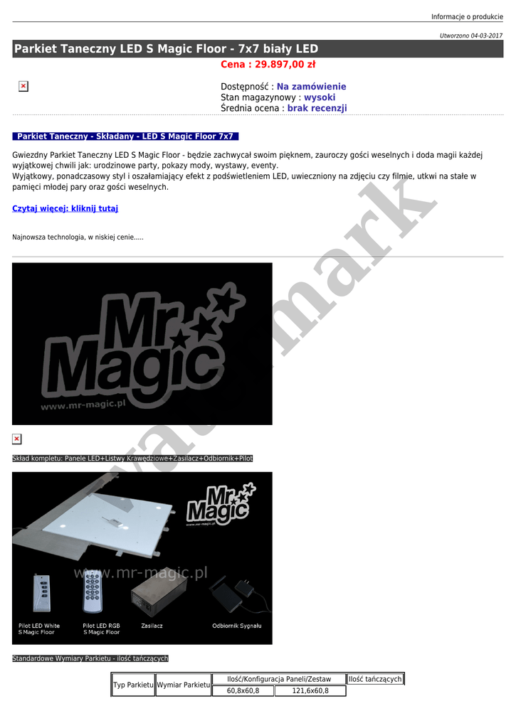 Informacje o produkcie Utworzono 04-03-2017 Parkiet Taneczny LED S Magic Floor - 7x7 biały LED Cena : 29.897,00 zł Dostępność : Na zamówienie Stan magazynowy : wysoki Średnia ocena : brak recenzji Parkiet Taneczny - Składany - LED S Magic Floor 7x7 Czytaj więcej: kliknij tutaj er m ar k Gwiezdny Parkiet Taneczny LED S Magic Floor - będzie zachwycał swoim pięknem, zauroczy gości weselnych i doda magii każdej wyjątkowej chwili jak: urodzinowe party, pokazy mody, wystawy, eventy. Wyjątkowy, ponadczasowy styl i oszałamiający efekt z podświetleniem LED, uwieczniony na zdjęciu czy filmie, utkwi na stałe w pamięci młodej pary oraz gości weselnych. at Najnowsza technologia, w niskiej cenie..... w Skład kompletu: Panele LED+Listwy Krawędziowe+Zasilacz+Odbiornik+Pilot Standardowe Wymiary Parkietu - ilość tańczących Typ Parkietu Wymiar Parkietu Ilość/Konfiguracja Paneli/Zestaw 60,8x60,8 121,6x60,8 Ilość tańczących 4x4 2.44M*2.44M 4 6 5x5 3.05M*3.05M 5 10 6x5 3.66M*3.05M 6 12 6x6 3.66M*3.66M 6 15 4.27M*3.66M 6 18 4.27M*4.27M 7 21 8x7 4.87M*4.27M 8 24 8x8 4.87M*4.87M 8 28 9x7 5.48M*4.27M 9 27 9x8 5.48M*4.87M 8 32 9x9 5.48M*5.48M 9 36 10x8 6.09M*4.87M 8 36 10x9 6.09M*5.48M 8 41 10x10 6.09M*6.09M 10 45 11x8 6.70M*4.87M 8 40 11x9 6.70M*5.48M 9 45 11x10 6.70M*6.09M 10 50 11x11 6.70M*6.70M 11 55 12x9 45-55 60-70 75-90 95-110 er m ar k 7x6 7x7 35-45 8 50 7.31M*6.09M 10 55 12x11 7.31M*6.70M 10 61 12x12 7.31M*7.31M 12 66 13x10 7.92M*6.09M 10 60 13x11 7.92M*6.70M 11 66 13x12 7.92M*7.31M 12 72 13x13 7.92M*7.92M 13 78 14x12 8.51M*7.31M 12 78 14x13 8.51M*7.92M 12 85 14x14 8.51M*8.51M 14 91 15x13 9.14M*7.92M 13 91 15x14 9.14M*8.51M 14 98 15x15 9.14M*9.14M 15 105 16x16 9.74M*9.74M 16 120 18x18 10.9M*10.9M 18 153 20x20 12M*12M 20 190 at 7.31M*5.48M 12x10 115-135 140-160 165-190 195-200 225-250 w Specyfikacja techniczna: Produkt LED S Magic Floor - White Typ / Wymiary 7x7 / 4.27M*4.27M Konstrukcja Panel frontowy: Akryl 6mm Płyta główna/spód: PVC/ABS Aluminium Dostępne kolory parkietu biały/czarny Wymiary paneli / ilość 60,8x60,8x2,8cm - ilość: 7 szt. 121,6x60,8x2,8cm - ilość: 21 szt. Żródło światła LED SMD 5050 Kolor podświetlenia biały ilość punktów LED 16 szt. - Panel 60,8x60,8cm 32 szt. - Panel 121,6x60,8cm Funkcje podświetlenia Wybór trybu podświtlenia/Migotanie naprzemienne/ Prędkość regulowana ( + / -) Sterowanie Pilot bezprzewodowy Temperatura pracy 0-35C° Napięcie wyjściowe 36V Informacje o produkcie Pobór prądu (60,8x60,8/121,6x60,8) 4/8W na panel Moc maksymalna 400W Ilość maksymalna LED 1700 szt./na 1 transformator Napięcie wejściowe 90-240V Klasa IP 53 Żywotność 50000h Nośność (60,8x60,8/121,6x60,8) 300/600kg Waga netto (60,8x60,8/121,6x60,8) 6/12 kg Certyfikaty CE er m ar k Nieodzowny element wyposażenia domów weselnych Efektowny parkiet na wystawy, pokazy mody, targi, eventy Idealny dla wystroju wnętrz Parkiet taneczny z efektem gwiezdnej podłogi Możliwość ułożenia na już istniejącej posadzce Instalacja stała jak i mobilna, okazjonalna Składany - szybka instalacja i deinstalacja Ułożenie parkietu: szybkie i wygodne Montaż i demontaż w kilka minut - bez użycia narzędzi W różnych rozmiarach, w zależności od projektu i potrzeb Dostępne wymiary panli: 60,8x60,8cm oraz 121,6x60,8cm Ultra Cienka konstrukcja - 2,8cm Płyta główna: akryl Kolor parkietu: biały lub czarny - do wyboru Kolorystycznie można łączyć Podświetlenie LED Kolor podświetlenia: Biały (dostępny również w wersji RGB) Sterownie: za pomocą Pilota Bezobsługowy, łatwy w utrzymaniu, nie wymaga konserwacji w at Wypełnij miejsce swojej posadzki, energooszczędną, Składaną Podłogą Podświetlaną, Parkietem Tanecznym LED S Magic Floor - Ultra Cienkim, Lekkim i łatwym w montażu..... Dedykowany: Domy Weselne, nocne kluby, dyskoteki, puby, bary, restauracje, hotele, boksy wystawiennicze, pokazy mody, eventy... ● ● ● ● ● ● ● ● ● ● ● ● ● ● ● ● ● ● ● ● ●