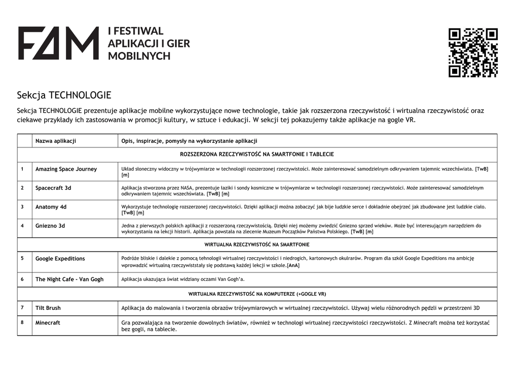Sekcja TECHNOLOGIE Sekcja TECHNOLOGIE prezentuje aplikacje mobilne wykorzystujące nowe technologie, takie jak rozszerzona rzeczywistość i wirtualna rzeczywistość oraz ciekawe przykłady ich zastosowania w promocji kultury, w sztuce i edukacji. W sekcji tej pokazujemy także aplikacje na gogle VR. Nazwa aplikacji Opis, inspiracje, pomysły na wykorzystanie aplikacji ROZSZERZONA RZECZYWISTOŚĆ NA SMARTFONIE I TABLECIE 1 Amazing Space Journey Układ słoneczny widoczny w trójwymiarze w technologii rozszerzonej rzeczywistości. Może zainteresować samodzielnym odkrywaniem tajemnic wszechświata. [TwB] [m] 2 Spacecraft 3d Aplikacja stworzona przez NASA, prezentuje łaziki i sondy kosmiczne w trójwymiarze w technologii rozszerzonej rzeczywistości. Może zainteresować samodzielnym odkrywaniem tajemnic wszechświata. [TwB] [m] 3 Anatomy 4d Wykorzystuje technologię rozszerzonej rzeczywistości. Dzięki aplikacji można zobaczyć jak bije ludzkie serce i dokładnie obejrzeć jak zbudowane jest ludzkie ciało. [TwB] [m] 4 Gniezno 3d Jedna z pierwszych polskich aplikacji z rozszerzoną rzeczywistością. Dzięki niej możemy zwiedzić Gniezno sprzed wieków. Może być interesującym narzędziem do wykorzystania na lekcji historii. Aplikacja powstała na zlecenie Muzeum Początków Państwa Polskiego. [TwB] [m] WIRTUALNA RZECZYWISTOŚĆ NA SMARTFONIE 5 Google Expeditions Podróże bliskie i dalekie z pomocą tehnologii wirtualnej rzeczywistości i niedrogich, kartonowych okulrarów. Program dla szkół Google Expeditions ma ambicję wprowadzić wirtualną rzeczywiststały się podstawą każdej lekcji w szkole.[AnA] 6 The Night Cafe - Van Gogh Aplikacja ukazująca świat widziany oczami Van Gogh’a. WIRTUALNA RZECZYWISTOŚĆ NA KOMPUTERZE (+GOGLE VR) 7 Tilt Brush Aplikacja do malowania i tworzenia obrazów trójwymiarowych w wirtualnej rzeczywistości. Używaj wielu różnorodnych pędzli w przestrzeni 3D 8 Minecraft Gra pozwalająca na tworzenie dowolnych światów, również w technologi wirtualnej rzeczywistości rzeczywistości. Z Minecraft można też korzystać bez gogli, na tablecie. 9 Destinations Aplikacja pozwalająca na oglądanie modeli trójwymiarowych stworzonych ze skanów 3D z całego świata. 10 Human Body Scan Oglądanie organizmu ludzkiego w przekroju i różnych warstwach. 11 Solar System Oglądanie układu słonecznego w technologii wirtualnej rzeczywistości. Wybór aplikacji mobilnych sekcji TECHNOLOGIE został przygotowany na potrzeby FAM - 1. Festiwalu Aplikacji i Gier Mobilnych dla kultury i edukacji (www.fam.cultureshock.pl). Organizacja: Fundacja Culture Shock. Kuratorka: Sylwia Żółkiewska, współpraca w wyborze aplikacji do sekcji TECHNOLOGIE: Grzegorz Bukowski (www.bukowscy.pl). Materiał jest dostępny na licencji CC BY-NC 2.0 PL (Uznanie autorstwa-Użycie niekomercyjne 2.0 Polska). Aplikacje AR z sekcji są dostępne w ITunes, AR i VR w Google Play, VR w Windows Store. *AnA - dodatkowe informacje zwiazane z aplikacją i jej zastosowaniem znajdują się w pierwszym polskim przewodniku po świecie aplikacji mobilnych pt. APPetyt na APPlikacje, który można bezpłatnie pobrać tutaj: https://fundacja.orange.pl/publikacje.html *TwB - materiały edukacyjne i scenariusze zajęć z daną aplikacją można pobrać z bezpłatnego kursu iTunes U Tablety w Twojej Bibliotece, zrealizowanego przez Fundację Rozwoju Społeczeństwa Informacyjnego. Kurs dostępny jest tutaj: https://itunes.apple.com/pl/course/zrob-to-sam-tablety-w-bibliotece/id996358856 *m - oznacza konieczność pobrania z sieci markerów (znaczników) umożliwiających korzystanie z aplikacji. Markery są przeważnie bezpłatne, aby je znaleźć należy wpisać w wyszuiwarkę Google nazwę aplikacji i słowo ‘marker’.