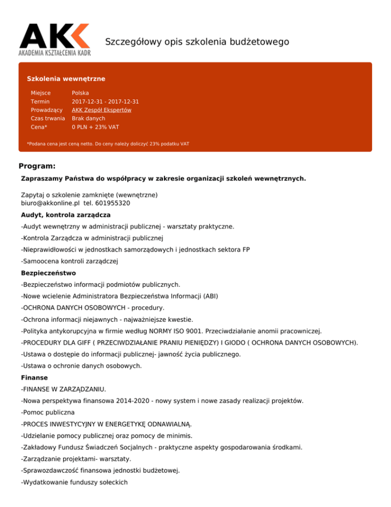 Szczegółowy opis szkolenia budżetowego Szkolenia wewnętrzne Miejsce Polska Termin 2017-12-31 - 2017-12-31 Prowadzący AKK Zespół Ekspertów Czas trwania Brak danych Cena* 0 PLN + 23% VAT *Podana cena jest ceną netto. Do ceny należy doliczyć 23% podatku VAT Program: Zapraszamy Państwa do współpracy w zakresie organizacji szkoleń wewnętrznych. Zapytaj o szkolenie zamknięte (wewnętrzne) [email protected] tel. 601955320 Audyt, kontrola zarządcza -Audyt wewnętrzny w administracji publicznej - warsztaty praktyczne. -Kontrola Zarządcza w administracji publicznej -Nieprawidłowości w jednostkach samorządowych i jednostkach sektora FP -Samoocena kontroli zarządczej Bezpieczeństwo -Bezpieczeństwo informacji podmiotów publicznych. -Nowe wcielenie Administratora Bezpieczeństwa Informacji (ABI) -OCHRONA DANYCH OSOBOWYCH - procedury. -Ochrona informacji niejawnych - najważniejsze kwestie. -Polityka antykorupcyjna w firmie według NORMY ISO 9001. Przeciwdziałanie anomii pracowniczej. -PROCEDURY DLA GIFF ( PRZECIWDZIAŁANIE PRANIU PIENIĘDZY) I GIODO ( OCHRONA DANYCH OSOBOWYCH). -Ustawa o dostępie do informacji publicznej- jawność życia publicznego. -Ustawa o ochronie danych osobowych. Finanse -FINANSE W ZARZĄDZANIU. -Nowa perspektywa finansowa 2014-2020 - nowy system i nowe zasady realizacji projektów. -Pomoc publiczna -PROCES INWESTYCYJNY W ENERGETYKĘ ODNAWIALNĄ. -Udzielanie pomocy publicznej oraz pomocy de minimis. -Zakładowy Fundusz Świadczeń Socjalnych - praktyczne aspekty gospodarowania środkami. -Zarządzanie projektami- warsztaty. -Sprawozdawczość finansowa jednostki budżetowej. -Wydatkowanie funduszy sołeckich -Windykacja w Urzędzie Kadry -AKADEMIA – KADRY, PŁACE, ZUS, BHP. -Czas pracy z uwzględnieniem czasu pracy kierowców samochodów osobowych . -Dokumentacja pracownicza – zasady prowadzenia. -JAK TWORZYĆ AKTY WEWNĘTRZNEGO PRAWA PRACY W SAMORZĄDZIE? -PRACA W SAMORZĄDZIE – PRACOWNICY, KIEROWNICTWO, RADNI. -Pracodawca wobec mobbingu, dyskryminacji i naruszeniu praw pracowniczych. -PRACOWNIK ADMINISTRACYJNO-BIUROWY -Prawo pracy w codziennym zarządzaniu. Minimalizacja zagrożeń.. -Prawo pracy w sferze budżetowej– aktualne problemy. -UMOWY CYWILNOPRAWNE, ZASTĘPSTWO I WSPÓŁPRACA PRZY NICH OD 01.01.2016 R. PO ZMIANACH DOTYCZĄCYCH USTALANIA PODSTAWY WYMIARU SKŁADEK I ZASIŁKÓW – AUTORSKIE WZORY DRUKÓW -UMOWY TERMINOWE 2016 R. – AUTORSKIE WZORY DRUKÓW -Urlopy wypoczynkowe, urlopy dla rodziców. -W interesie pracodawcy, mobbing, dyskryminacja, naruszanie praw pracowniczych.. -Zatrudnianie i rozliczanie personelu. -Zatrudnianie na podstawie umów cywilnoprawnych. -Powiatowa Rada Rynku Pracy w świetle nowelizacji przepisów ustawy o promocji zatrudnienia i instytucjach rynku pracy -Promocja zatrudnienia i instytucje rynku pracy – najnowsze zmiany w ustawie Komputerowe -MS Access od podstaw -MS Excel w analizie danych -MS Excel w finansach -Prawdziwe zastosowanie MS Outlook -VBA w MS Excel od podstaw Umiejętności interpersonalne -Profesjonalna obsługa Klienta . -Komunikacja zasobów ludzkich -Stosowanie języka polskiego w urzędzie -Radzenie sobie w trudnych sytuacjach interpersonalnych -Praca w zespole -Negocjacje dla początkujących -Akademia zarządzania: budowanie zespołu, zarządzanie sobą w czasie, budowanie kultury organizacyjnej -Wystąpienia publiczne w samorządzie dla zaawansowanych - warsztaty z kamerą -Mowa ciała w obsłudze klienta Urzędu -Relacje w mediami i public relations Urzędu. -Komunikacja z trudnym klientem Podatki, rachunkowość -Aktualna problematyka oraz zmiany w VAT w jednostkach sfery budżetowej -CIT od podstaw z uwzględnieniem zmian wchodzących od 01.01.2016 r. -KRAJOWE I ZAGRANICZNE PODRÓŻE SŁUŻBOWE -ODPOWIEDZIALNOŚĆ KIEROWNIKA JEDNOSTKI I GŁÓWNEGO KSIĘGOWEGO W JEDNOSTCE SEKTORA FINANSÓW PUBLICZNYCH . -OPŁATA SKARBOWA. -Podatek dochodowy (CIT) w branży wodociągowo-kanalizacyjnej i usług komunalnych -Podatek VAT w branży wodociągowo-kanalizacyjnej i usług komunalnych -PODATEK VAT W JEDNOSTKACH SAMORZĄDOWYCH- PRAKTYCZNY PRZEWODNIK PO ZMIANACH -Podatek VAT w projektach unijnych. -RACHUNKOWOSC JEDNOSTEK SEKTORA FINANSOW PUBLICZNYCH. -VAT w sektorze publicznym. Czynności pomiędzy jednostkami, najnowsze orzecznictwo. -ZASADY ZWROTU PODATKU VAT GMINOM i SAMORZĄDOM. -Zmiany w VAT w JST od 1 stycznia 2016. Wybrane problemy w VAT -ŚRODKI TRWAŁE W EWIDENCJI KSIĘGOWEJ JEDNOSTKI BUDŻETOWEJ. Ujęcie problemowe. Prawo -Decyzje o warunkach zabudowy i zagospodarowania terenu Decyzje wydawane w procesie inwestycyjnym. -Decyzje środowiskowe. Decyzje wydawane w procesie inwestycyjnym. -DOSTĘP DO INFORMACJI PUBLICZNEJ. -EGZEKUCJA OPŁAT ŚMIECIOWYCH. -INSTRUKCJA KANCELARYJNA. -Kodeks Postępowania Administracyjnego w praktyce. -KODEKS POSTĘPOWANIA ADMINISTRACYJNEGO.METRYKA SPRAWY. Odpowiedzialność majątkowa funkcjonariuszy publicznych za rażące naruszenie prawa. -Naruszenie stosunków wodnych na gruncie – postępowanie administracyjne na podstawie art. 29 ustawy prawo wodne. -Nowelizacja prawa autorskiego po zmianach w 2015 r. -Nowelizacja prawa budowlanego. -Postepowanie egzekucyjne -POSTĘPOWANIE ADMINISTRACYJNE WEDŁUG KODEKSU POSTĘPOWANIA ADMINISTRACYJNEGO. -Praktyczne problemy ochrony drzew i krzewów na podstawie ustawy o ochronie przyrody. -PRAWO AUTORSKIE W DZIAŁACH PROMOCJI MIAST I GMIN -PRAWO AUTORSKIE W OŚWIACIE -Prawo energetyczne, energetyka odnawialna- aktualne wyzwania i problemy. -Stosowanie KPA w sprawach związanych z ochroną środowiska. -Tworzenie Samorządowych Centrów Usług Wspólnych. Przekształcenie ZEASów. -Usuwanie drzew, krzewów - aspekty proceduralne, prawne, karne. -Zmiany w lokalizacji reklam i ochronie krajobrazu- tzw. ustawa krajobrazowa 2015 -Zmiany w prawie budowlanym- proces inwestycyjny- aspekty prawne. Zamówienia publiczne -Postępowanie o udzielenie zamówienia po nowelizacji ustawy Prawo Zamówień Publicznych. Najważniejs
