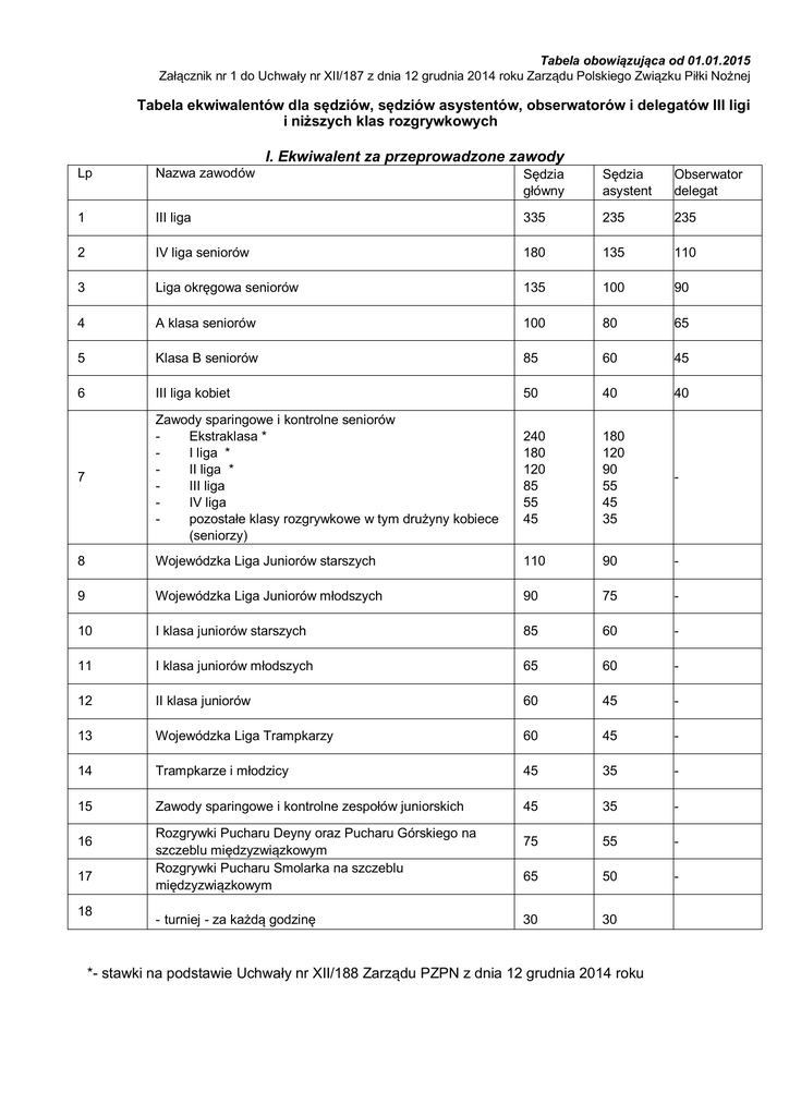Tabela obowiązująca od 01.01.2015 Załącznik nr 1 do Uchwały nr XII/187 z dnia 12 grudnia 2014 roku Zarządu Polskiego Związku Piłki Nożnej Tabela ekwiwalentów dla sędziów, sędziów asystentów, obserwatorów i delegatów III ligi i niższych klas rozgrywkowych I. Ekwiwalent za przeprowadzone zawody Lp Nazwa zawodów Sędzia główny Sędzia asystent Obserwator delegat 1 III liga 335 235 235 2 IV liga seniorów 180 135 110 3 Liga okręgowa seniorów 135 100 90 4 A klasa seniorów 100 80 65 5 Klasa B seniorów 85 60 45 6 III liga kobiet 50 40 40 7 Zawody sparingowe i kontrolne seniorów Ekstraklasa * I liga * II liga * III liga IV liga pozostałe klasy rozgrywkowe w tym drużyny kobiece (seniorzy) 240 180 120 85 55 45 180 120 90 55 45 35 - 8 Wojewódzka Liga Juniorów starszych 110 90 - 9 Wojewódzka Liga Juniorów młodszych 90 75 - 10 I klasa juniorów starszych 85 60 - 11 I klasa juniorów młodszych 65 60 - 12 II klasa juniorów 60 45 - 13 Wojewódzka Liga Trampkarzy 60 45 - 14 Trampkarze i młodzicy 45 35 - 15 Zawody sparingowe i kontrolne zespołów juniorskich 45 35 - 75 55 - 65 50 - 30 30 16 17 18 Rozgrywki Pucharu Deyny oraz Pucharu Górskiego na szczeblu międzyzwiązkowym Rozgrywki Pucharu Smolarka na szczeblu międzyzwiązkowym - turniej - za każdą godzinę *- stawki na podstawie Uchwały nr XII/188 Zarządu PZPN z dnia 12 grudnia 2014 roku a) b) c) d) e) poz. 16-17 - ekwiwalent za Rozgrywki Pucharów wypłacają ZPN-y. poz. 14 tabeli - sędziowie prowadzą zawody nieodpłatnie w miejscu zamieszkania zgodnie z Uchwałą Prezydium Zarządu PZPN nr 2/13 z 09.02.2001 roku (ilość zawodów do przeprowadzenia uzależniona jest od posiadanej klasy uprawnień jako sędzia główny). Zawody Pucharu Polski edycji związkowej rozliczamy wg stawek ekwiwalentu tej klasy jaką reprezentuje „Gospodarz spotkania". Zawody sparingowe i kontrolne rozliczamy wg stawek ekwiwalentu tej klasy jaką reprezentuje drużyna zgłaszająca zapotrzebowanie i opłacająca zespół sędziowski. W przypadku nie odbycia się zawodów (z różnych przyczyn) sędziowie, obserwatorzy i delegaci otrzymają zwrot kosztów przejazdu oraz 50% ekwiwalentu zgodnie z niniejszą tabelą. II. Zasady rozliczania ekwiwalentu i kosztów dojazdu 1. 2. 3. 4. 5. Zgodnie z otrzymaną interpretacją Dyrektora Izby Skarbowej w Bydgoszczy z dnia 21.06.2011 roku należy od kwoty ekwiwalentu odliczyć koszty uzyskania przychodu (w wysokości 20%) i od tak otrzymanej kwoty naliczyć należny podatek w wysokości 18% (zaokrąglony do pełnych złotych). Koszty przejazdu, dojazdu nalicza się wg odrębnych tabel odpowiednio dla III ligi oraz dla lig i klas pozostałych Od kosztów przejazdu, dojazdu nie nalicza się podatków. Sędzia, obserwator, delegat ma obowiązek pozostawić w klubie swoje dane niezbędne do prawidłowego rozliczenia się z Urzędem Skarbowym. Formularz PIT powinien zostać przez klub przesłany do sędziego (obserwatora) oraz do Urzędu Skarbowego właściwego ze względu na miejsce jego zamieszkania (nie zameldowania). Należność za przeprowadzone zawody nalicza się dodając kwoty z pkt I i pkt II p.2 po uwzględnieniu obowiązujących odliczeń podatkowych. III. Postanowienia końcowe: 1. 2. 3. 4. 5. Należności za przeprowadzone zawody będą wypłacane przez Zachodniopomorski Związek Piłki Nożnej w terminie do dnia 15-go każdego miesiąca za miesiąc poprzedni (dotyczy klubów, które rozliczają należności sędziom poprzez biuro ZZPN). Klub, który nie rozlicza należności sędziom poprzez biuro ZZPN zobowiązany jest uregulować je po zakończeniu zawodów. W przypadku ich nie uregulowania sędziowie zobowiązani są razem ze sprawozdaniem przesłać do biura ZZPN rachunki (z opisem przyczyn nie wypłacenia należności). Niniejsza tabela należności została zatwierdzona Uchwałą Zarządu PZPN nr XII/187 z dnia 12.12.2014 roku i uchwałą Zarządu PZPN nr VII/127 z 22.07.2014 roku zm. Uchwałą nr XII/188 Zarządu PZPN z 12.12.2014 roku oraz Uchwałą Prezydium Zarządu Zachodniopomorskiego ZPN z dnia 22.12.2014 roku. Niniejsza tabela obowiązuje od dnia 01.01.2015 roku. Jednocześnie anuluje się dotychczasowe tabele należności dla sędziów, delegatów oraz obserwatorów Zachodniopomorskiego ZPN.