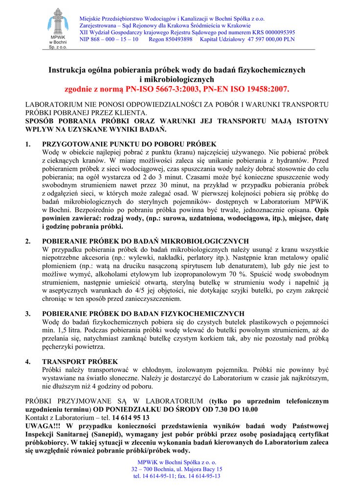 Miejskie Przedsiębiorstwo Wodociągów i Kanalizacji w Bochni Spółka z o.o. Zarejestrowana – Sąd Rejonowy dla Krakowa Śródmieścia w Krakowie XII Wydział Gospodarczy krajowego Rejestru Sądowego pod numerem KRS 0000095395 NIP 868 – 000 – 15 – 10 Regon 850493898 Kapitał Udziałowy 47 597 000,00 PLN Instrukcja ogólna pobierania próbek wody do badań fizykochemicznych i mikrobiologicznych zgodnie z normą PN-ISO 5667-3:2003, PN-EN ISO 19458:2007. LABORATORIUM NIE PONOSI ODPOWIEDZIALNOŚCI ZA POBÓR I WARUNKI TRANSPORTU PRÓBKI POBRANEJ PRZEZ KLIENTA. SPOSÓB POBRANIA PRÓBKI ORAZ WARUNKI JEJ TRANSPORTU MAJĄ ISTOTNY WPLYW NA UZYSKANE WYNIKI BADAŃ. 1. PRZYGOTOWANIE PUNKTU DO POBORU PRÓBEK Wodę w obiekcie najlepiej pobrać z punktu (kranu) najczęściej używanego. Nie pobierać próbek z cieknących kranów. W miarę możliwości zaleca się unikanie pobierania z hydrantów. Przed pobieraniem próbek z sieci wodociągowej, czas spuszczania wody należy dobrać stosownie do celu pobierania; na ogół wystarcza od 2 do 3 minut. Czasami może być konieczne spuszczenie wody swobodnym strumieniem nawet przez 30 minut, na przykład w przypadku pobierania próbek z odgałęzień sieci, w których może zalegać osad. W pierwszej kolejności pobiera się próbkę do badań mikrobiologicznych do sterylnych pojemników- dostępnych w Laboratorium MPWiK w Bochni. Bezpośrednio po pobraniu próbka powinna być trwale, jednoznacznie opisana. Opis powinien zawierać: rodzaj wody, (np.: surowa, uzdatniona, wodociągowa, itp.), miejsce, datę i godzinę pobrania próbki. 2. POBIERANIE PRÓBEK DO BADAŃ MIKROBIOLOGICZNYCH W przypadku pobierania próbek do badań mikrobiologicznych należy usunąć z kranu wszystkie niepotrzebne akcesoria (np.: wylewki, nakładki, perlatory itp.). Następnie kran metalowy opalić płomieniem (np.: watą na druciku nasączoną spirytusem lub denaturatem), lub gdy nie jest to możliwe wymyć, alkoholami etylowym lub izopropanolowym 70 %. Spuścić wodę swobodnym strumieniem, następnie umieścić otwartą, sterylną butelkę w strumieniu wody i napełnić ją w aseptycznych warunkach do 4/5 jej objętości, nie dotykając szyjki butelki, po czym zakręcić chroniąc w ten sposób przed zanieczyszczeniem. 3. POBIERANIE PRÓBEK DO BADAN FIZYKOCHEMICZNYCH Wodę do badań fizykochemicznych pobiera się do czystych butelek plastikowych o pojemności min. 1,5 litra. Podczas pobierania próbki wodę wlewać do butelki powolnym strumieniem, aż do przelania się, natychmiast zamknąć butelkę czystym korkiem tak, aby nie pozostały nad próbką pęcherzyki powietrza. 4. TRANSPORT PRÓBEK Próbki należy transportować w chłodnym, izolowanym pojemniku. Próbki nie powinny być wystawiane na światło słoneczne. Należy je dostarczyć do Laboratorium w czasie jak najkrótszym, nie dłuższym niż 4 godziny od poboru. PRÓBKI PRZYJMOWANE SĄ W LABORATORIUM (tylko po uprzednim telefonicznym uzgodnieniu terminu) OD PONIEDZIAŁKU DO ŚRODY OD 7.30 DO 10.00 Kontakt z Laboratorium – tel. 14 614 95 13 UWAGA!!! W przypadku konieczności przedstawienia wyników badań wody Państwowej Inspekcji Sanitarnej (Sanepid), wymagany jest pobór próbki przez osobę posiadającą certyfikat próbkobiorcy. W takiej sytuacji w zleceniu wykonania badań kierowanych do Laboratorium zaleca się uwzględnić również pobranie próbki/próbek wody. MPWiK w Bochni Spółka z o. o. 32 – 700 Bochnia, ul. Majora Bacy 15 tel. 14 614-95-11; fax. 14 614-95-13