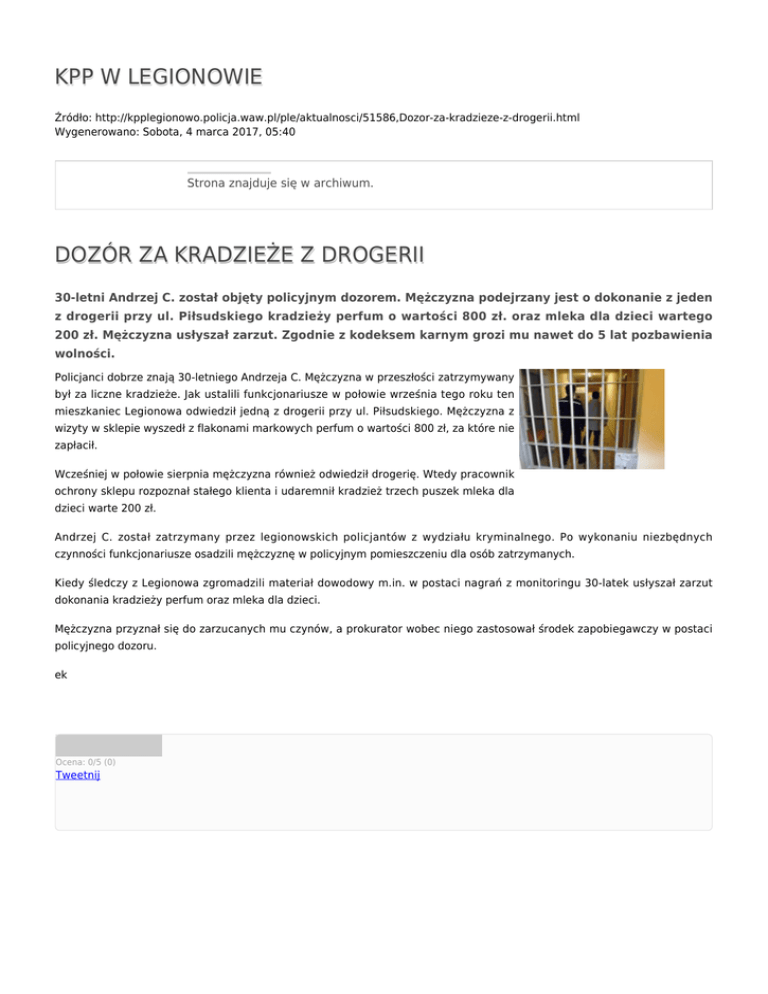 KPP W LEGIONOWIE Źródło: http://kpplegionowo.policja.waw.pl/ple/aktualnosci/51586,Dozor-za-kradzieze-z-drogerii.html Wygenerowano: Sobota, 4 marca 2017, 05:40 Strona znajduje się w archiwum. DOZÓR ZA KRADZIEŻE Z DROGERII 30-letni Andrzej C. został objęty policyjnym dozorem. Mężczyzna podejrzany jest o dokonanie z jeden z drogerii przy ul. Piłsudskiego kradzieży perfum o wartości 800 zł. oraz mleka dla dzieci wartego 200 zł. Mężczyzna usłyszał zarzut. Zgodnie z kodeksem karnym grozi mu nawet do 5 lat pozbawienia wolności. Policjanci dobrze znają 30-letniego Andrzeja C. Mężczyzna w przeszłości zatrzymywany był za liczne kradzieże. Jak ustalili funkcjonariusze w połowie września tego roku ten mieszkaniec Legionowa odwiedził jedną z drogerii przy ul. Piłsudskiego. Mężczyzna z wizyty w sklepie wyszedł z flakonami markowych perfum o wartości 800 zł, za które nie zapłacił. Wcześniej w połowie sierpnia mężczyzna również odwiedził drogerię. Wtedy pracownik ochrony sklepu rozpoznał stałego klienta i udaremnił kradzież trzech puszek mleka dla dzieci warte 200 zł. Andrzej C. został zatrzymany przez legionowskich policjantów z wydziału kryminalnego. Po wykonaniu niezbędnych czynności funkcjonariusze osadzili mężczyznę w policyjnym pomieszczeniu dla osób zatrzymanych. Kiedy śledczy z Legionowa zgromadzili materiał dowodowy m.in. w postaci nagrań z monitoringu 30-latek usłyszał zarzut dokonania kradzieży perfum oraz mleka dla dzieci. Mężczyzna przyznał się do zarzucanych mu czynów, a prokurator wobec niego zastosował środek zapobiegawczy w postaci policyjnego dozoru. ek Ocena: 0/5 (0) Tweetnij