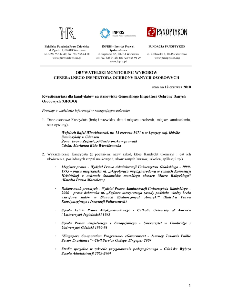 Helsińska Fundacja Praw Człowieka ul. Zgoda 11, 00-018 Warszawa tel.: /22/ 556 44 40; fax: /22/ 556 44 50 www.prawaczlowieka.pl INPRIS – Instytut Prawa i Społeczeństwa ul. Szpitalna 5/5, 00-031 Warszawa tel.: /22/ 828 91 28; fax: /22/ 828 91 29 www.inpris.pl FUNDACJA PANOPTYKON ul. Królewska 2, 00-065 Warszawa www.panoptykon.org OBYWATELSKI MONITORING WYBORÓW GENERALNEGO INSPEKTORA OCHRONY DANYCH OSOBOWYCH stan na 18 czerwca 2010 Kwestionariusz dla kandydatów na stanowisko Generalnego Inspektora Ochrony Danych Osobowych (GIODO) Prosimy o udzielenie informacji w następującym zakresie: 1. Dane osobowe Kandydata (imię i nazwisko, data i miejsce urodzenia, miejsce zamieszkania, stan cywilny). Wojciech Rafał Wiewiórowski, ur. 13 czerwca 1971 r. w Łęczycy woj. łódzkie Zamieszkały w Gdańsku Żona: Iwona Zużewicz-Wiewiórowska – prawnik Córka: Marianna Róża Wiewiórowska 2. Wykształcenie Kandydata (z podaniem: nazw szkół, które Kandydat ukończył i dat ich ukończenia, posiadanych stopni naukowych, ukończonych kursów, szkoleń, aplikacji itp.). • Magister prawa - Wydział Prawa Administracji Uniwersytetu Gdańskiego - 19901995 - praca magisterska nt. „Współpraca międzynarodowa w ramach Konwencji Helsińskiej o ochronie środowiska morskiego obszaru Morza Bałtyckiego” (Katedra Prawa Morskiego) • Doktor nauk prawnych - Wydział Prawa Administracji Uniwersytetu Gdańskiego – 2000 - praca doktorska nt. „Sądowa interpretacja zasady podziału władzy i rola ustrojowa sądów w Stanach Zjednoczonych Ameryki” (Katedra Prawa Konstytucyjnego i Instytucji Politycznych). • Szkoła Letnia Prawa Międzynarodowego - Catholic University of America i Uniwersytet Jagielloński 1995 • Szkoła Prawa Angielskiego i Europejskiego - Uniwersytet w Cambridge / Uniwersytet Gdański 1996-98 • “Singapore Co-operation Programme. eGovernment - Journey Towards Public Sector Excellance” - Civil Service College, Singapur 2009 • Studia specjalne w zakresie przygotowania pedagogicznego – Gdańska Wyższa Szkoła Administracji 2003-2004 1 3. Przebieg kariery zawodowej (w tym: miejsca zatrudnienia i okresy pozostawania na danym stanowisku; prowadzenie własnej działalności gospodarczej; zajmowane stanowiska we władzach spółek, przedsiębiorstw państwowych, fundacji, spółdzielni itp.) Wydział Prawa Administracji Uniwersytetu Gdańskiego – doktorant – 1995-2000 Wydawnictwo Prawnicze LEX – redaktor a następnie wydawca – 1996-2000 2p.pl Portale Profesjonalne – wydawca a następnie redaktor naczelny – 2000-2002 Polskie Wydawnictwa Profesjonalne – Wolters Kluwer Polska – szef redakcji internetowej – 2002-2003 Gdańska Wyższa Szkoła Administracji – wykładowca a następnie docent – 2002-2008 r. Wydział Prawa Administracji Uniwersytetu Gdańskiego – adiunkt, kierownik Pracowni Informatyki Prawniczej – od 2003 r. Współprzewodniczący Komisji Regulacyjnej ds. Polskiego Autokefalicznego Kościoła Prawosławnego – 2006-2008 Ministerstwo Spraw Wewnętrznych i Administracji - doradca w Gabinecie Politycznym Wiceprezesa Rady Ministrów – luty 2006 r. - marzec 2007 r. Kancelaria Prezesa Rady Ministrów – doradca w Gabinecie Politycznym Wiceprezesa Rady Ministrów – marzec 2007 r. - kwiecień 2007 r. Ministerstwo Spraw Wewnętrznych i Administracji – doradca w Gabinecie Politycznym Wiceprezesa Rady Ministrów – maj 2007 r. - wrzesień 2008 r. Ministerstwo Spraw Wewnętrznych i Administracji – dyrektor Departamentu Informatyzacji – od października 2008 r. 2 4. Informacje potwierdzające doświadczenie, osiągnięcia i status zawodowy lub naukowy Kandydata jako specjalisty (znawcy) w dziedzinie ochrony danych osobowych, ze szczególnym uwzględnieniem funkcji lub doświadczeń zawodowych, które w opinii Kandydata stanowią adekwatne doświadczenie z punktu widzenia zakresu ustawowych kompetencji i zadań GIODO (zgodnie z art. 8 ust. 3 ustawy z dnia 29 sierpnia 1997 r. o ochronie danych osobowych, na stanowisko GIODO może być powołana tylko osoba, która posiada wyższe wykształcenie prawnicze oraz odpowiednie doświadczenie zawodowe). Doświadczenie zawodowe w zakresie ochrony danych osobowych i bezpieczeństwa informacji - Ministerstwo Spraw Wewnętrznych i Administracji – dyrektor Departamentu Informatyzacji – od października 2008 r. Doświadczenie zawodowe w zarządzania instytucją publiczną - Ministerstwo Spraw Wewnętrznych i Administracji – dyrektor Departamentu Informatyzacji – od października 2008 r. Doświadczenie zawodowe w dydaktyki ochrony danych osobowych i przetwarzania informacji - Uniwersytet Gdański, Wydział Prawa Administracji (1996-2010) - Ochrona danych osobowych i ochrona prywatności - Technologia informacyjna i informatyka prawnicza - Technologia informacyjna i informatyka w administracji - Prawo nowych technologii informacyjnych - Prawo komputerowe - Elektroniczna administracja - Computer Law (Polish and International Legal Studies Programme) - seminarium magisterskie „Informatyzacja administracji i prawo komputerowe” - Uniwersytet Gdański, Wydział Nauk Społecznych, studia podyplomowe (2010) - Prawna ochrona danych osobowych - Uniwersytet Gdański, Wydział Matematyki, Fizyki i Informatyki(2008-2010) - Prawo komputerowe - w ramach bloku „Problemy społeczne i zawodowe informatyki” - ponad 70 wykładów naukowych i popularnonaukowych z zakresu informatyki prawniczej, bezpieczeństwa informacji oraz wykorzystywania nowych technologii do przetwarzania informacji, w tym danych osobowych - współautorstwo kursu e-learningowego z zakresu ochrony danych osobowych dla Telekomunikacji Polskiej SA przygotowanego przez wydawnictwo Young Digital Poland – 2004 r. Doświadczenie zawodowe w rozstrzygania sporów - Współprzewodniczący Komisji Regulacyjnej ds. Polskiego Autokefalicznego Kościoła Prawosławnego – 2006-2008 - Mediator w Sądzie Polubownym ds. Domen Internetowych przy