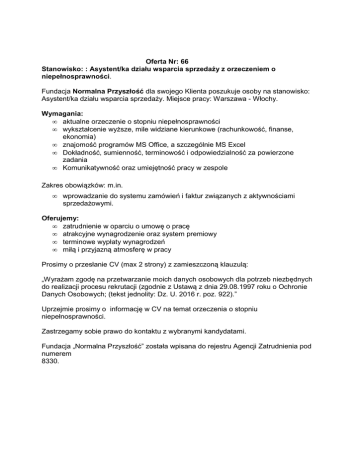 Oferta Nr: 66 Stanowisko: : Asystent/ka działu wsparcia sprzedaży z orzeczeniem o niepełnosprawności. Fundacja Normalna Przyszłość dla swojego Klienta poszukuje osoby na stanowisko: Asystent/ka działu wsparcia sprzedaży. Miejsce pracy: Warszawa - Włochy. Wymagania: • aktualne orzeczenie o stopniu niepełnosprawności • wykształcenie wyższe, mile widziane kierunkowe (rachunkowość, finanse, ekonomia) • znajomość programów MS Office, a szczególnie MS Excel • Dokładność, sumienność, terminowość i odpowiedzialność za powierzone zadania • Komunikatywność oraz umiejętność pracy w zespole Zakres obowiązków: m.in. • wprowadzanie do systemu zamówień i faktur związanych z aktywnościami sprzedażowymi. Oferujemy: • zatrudnienie w oparciu o umowę o pracę • atrakcyjne wynagrodzenie oraz system premiowy • terminowe wypłaty wynagrodzeń • miłą i przyjazną atmosferę w pracy Prosimy o przesłanie CV (max 2 strony) z zamieszczoną klauzulą: „Wyrażam zgodę na przetwarzanie moich danych osobowych dla potrzeb niezbędnych do realizacji procesu rekrutacji (zgodnie z Ustawą z dnia 29.08.1997 roku o Ochronie Danych Osobowych; (tekst jednolity: Dz. U. 2016 r. poz. 922).” Uprzejmie prosimy o informację w CV na temat orzeczenia o stopniu niepełnosprawności. Zastrzegamy sobie prawo do kontaktu z wybranymi kandydatami. Fundacja „Normalna Przyszłość” została wpisana do rejestru Agencji Zatrudnienia pod numerem 8330.