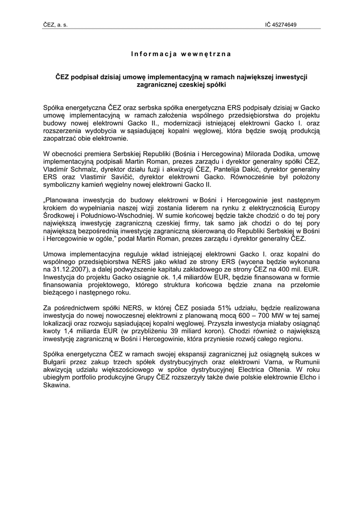 ČEZ, a. s. IČ 45274649 Informacja wewnętrzna ČEZ podpisał dzisiaj umowę implementacyjną w ramach największej inwestycji zagranicznej czeskiej spółki Spółka energetyczna ČEZ oraz serbska spółka energetyczna ERS podpisały dzisiaj w Gacko umowę implementacyjną w ramach założenia wspólnego przedsiębiorstwa do projektu budowy nowej elektrowni Gacko II., modernizacji istniejącej elektrowni Gacko I. oraz rozszerzenia wydobycia w sąsiadującej kopalni węglowej, która będzie swoją produkcją zaopatrzać obie elektrownie. W obecności premiera Serbskiej Republiki (Bośnia i Hercegowina) Milorada Dodika, umowę implementacyjną podpisali Martin Roman, prezes zarządu i dyrektor generalny spółki ČEZ, Vladimír Schmalz, dyrektor działu fuzji i akwizycji ČEZ, Pantelija Dakić, dyrektor generalny ERS oraz Vlastimir Savičić, dyrektor elektrowni Gacko. Równocześnie był położony symboliczny kamień węgielny nowej elektrowni Gacko II. „Planowana inwestycja do budowy elektrowni w Bośni i Hercegowinie jest następnym krokiem do wypełniania naszej wizji zostania liderem na rynku z elektrycznością Europy Środkowej i Południowo-Wschodniej. W sumie końcowej będzie także chodzić o do tej pory największą inwestycję zagraniczną czeskiej firmy, tak samo jak chodzi o do tej pory największą bezpośrednią inwestycję zagraniczną skierowaną do Republiki Serbskiej w Bośni i Hercegowinie w ogóle,” podał Martin Roman, prezes zarządu i dyrektor generalny ČEZ. Umowa implementacyjna reguluje wkład istniejącej elektrowni Gacko I. oraz kopalni do wspólnego przedsiębiorstwa NERS jako wkład ze strony ERS (wycena będzie wykonana na 31.12.2007), a dalej podwyższenie kapitału zakładowego ze strony ČEZ na 400 mil. EUR. Inwestycja do projektu Gacko osiągnie ok. 1,4 miliardów EUR, będzie finansowana w formie finansowania projektowego, którego struktura końcowa będzie znana na przełomie bieżącego i następnego roku. Za pośrednictwem spółki NERS, w której ČEZ posiada 51% udziału, będzie realizowana inwestycja do nowej nowoczesnej elektrowni z planowaną mocą 600 – 700 MW w tej samej lokalizacji oraz rozwoju sąsiadującej kopalni węglowej. Przyszła inwestycja miałaby osiągnąć kwoty 1,4 miliarda EUR (w przybliżeniu 39 miliard koron). Chodzi również o największą inwestycję zagraniczną w Bośni i Hercegowinie, która przyniesie rozwój całego regionu. Spółka energetyczna ČEZ w ramach swojej ekspansji zagranicznej już osiągnęłą sukces w Bułgarii przez zakup trzech spółek dystrybucyjnych oraz elektrowni Varna, w Rumunii akwizycją udziału większościowego w spółce dystrybucyjnej Electrica Oltenia. W roku ubiegłym portfolio produkcyjne Grupy ČEZ rozszerzyły także dwie polskie elektrownie Elcho i Skawina. ČEZ, a. s. IČ 45274649 Załącznik: PROJEKT GACKO Budowa nowego bloku Gacko II. – 600 - 700 MW Za podstawowe było wybrane rozwiązanie budowy nadkrytycznego bloku kondensacyjnego. W ramach opracowania Feasibility Study rozważa się obecnie również kilka innych scenariuszy budowy nowego źródła ze względu na jego wydajność, parametry podstawowe i wykorzystane technologie kotłów. Podczas analizy tychże scenariuszy trzeba uwzględnić ilość i jakość węgla w nowej kopalni, warunki zakładania budów, ale i fakt, że teren znajduje się w rejonie sejsmicznym. Nowa elektrownia będzie wybudowana przy wykorzystaniu najnowocześniejszych technologii oraz będzie zaprojektowana w taki sposób, żeby spełniła najbardziej surowe limity ekologiczne ustalone w ramach Unii Europejskiej. Będzie wykorzystane nowoczesne, szczytowe rozwiązanie technologiczne w postaci wysoce skutecznego (46,6 %) i niezawodnego bloku. Zakłada się wykorzystanie jednakowych technologii jak przy nowo planowanych blokach spółki ČEZ w Republice Czeskiej i przez to wykorzystanie synergii w dziedzinie rozwiązania projektowego, w dziedzinie dostaw lub w dziedzinie długotrwałej konserwacji. Sam projekt oraz związane z nim studia są już obecnie opracowywane przez wspólny zespół. Jego wynikiem będzie konkretne rozwiązanie budowlane dla nowego bloku oraz uzyskanie wszelkich zezwoleń na rozpoczęcie budowy elektrowni. Rozpoczęcie prac budowlanych zakłada się na rok 2009. Rekonstrukcja elektrowni Gacko I. – 300 MW ČEZ przy współpracy z fachowymi pracownikami elektrowni Gacko I oraz organizacji dostawczych przeprowadza analizę obecnego stanu technicznego elektrowni, w wyniku której dojdzie do opracowania opcji przyszłego rozwoju istniejącej elektrowni. Na podstawie wypracowania analizy cyklu cieplnego będą odpowiednio przekształcone zaproponowane opcje rozwoju. Na wyjściu będzie projekt rekonstrukcji dotychczasowej elektrowni, która zwiększy skuteczność i niezawodność tego źródła i umożliwi pracę elektrowni do końca jej planowanej żywotności, czyli w przybliżeniu do roku 2025. Przeprowadzona rekonstrukcja zapewni także spełnienie obowiązujących limitów ekologicznych. Rozpatrywana rekonstrukcja dotychczasowej elektrowni cieplnej po rozpoczęciu eksploatacji nowej elektrowni w roku 2014 będzie oznaczać spełnienie wszelkich limitów emisyjnych obowiązujących w Republice Serbskiej oraz dalej zwiększenie skuteczności dotychczasowej elektrowni minimalnie o 3 % ponad obecny poziom, żeby spełniała kryteria „BAT“ dla istniejących elektrowni na węgiel brunatny ustalone przez Komisję Europejską. Jeżeli analiza obecnego stanu technicznego istniejącej elektrowni pokaże, że nie jest możliwa tylko częściowa rekonstrukcja istniejącego źródła, która umożliwiłaby prowadzić to źródło do roku 2025, będzie rozważana opcja zakładająca kompleksowy retrofit elektrowni po uruchomieniu nowego źródła. Rozszerzenie kopalni węgla Gackie zagłębie węglowe jest częścią Gackiego pola w północno-wschodniej części Bośni i Hercegowiny. Istniejąca kopalnia odkrywkowa z