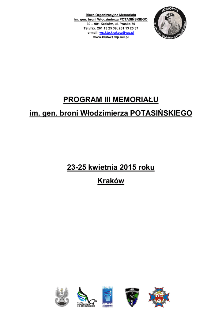 Biuro Organizacyjne Memoriału im. gen. broni Włodzimierza POTASIŃSKIEGO 30 – 901 Kraków, ul. Praska 70 Tel./fax. 261 13 25 39; 261 13 25 37 e-mail: [email protected] www.klubws.wp.mil.pl PROGRAM III MEMORIAŁU im. gen. broni Włodzimierza POTASIŃSKIEGO 23-25 kwietnia 2015 roku Kraków Program III Memoriału im. gen. broni Włodzimierza POTASIŃSKIEGO 23.04.2015 r. /czwartek/ do godz. 14.00 – przybycie uczestników do Hotelu PETRUS, ul. Pietrusińskiego 12 w Krakowie, zakwaterowanie; 16.00 – Sala restauracyjna Hotelu – oficjalne otwarcie Memoriału im. gen. broni Włodzimierza POTASIŃSKIEGO; 17.00 – odprawa techniczna z kapitanami drużyn; 17.30 – wyjazd autokarem na wycieczkę po Krakowie; 24.04.2015 /piątek/ 7.00 - 8.00 – śniadanie w hotelu; 08.30 – zbiórka na parkingu przed hotelem, przejazd na strzelnicę „Pasternik”; 9.00 – Strzelnica „Pasternik”: 1. Odprawa kierowników drużyn – losowanie stanowisk strzeleckich; 2. Zapoznanie ze strzelnicą; 3. Instruktaż dla zawodników. 10.00 – początek zawodów strzeleckich; 12.00 – zakończenie strzelania; 12.00 – 13.00 – obiad na terenie strzelnicy /grochówka/; 12.00 – zawody strzeleckie dla sponsorów; 13.00 – przegrupowanie do hotelu; 13.30 -15.30 – odpoczynek – przygotowanie do zawodów w pływaniu; 15.30 – przegrupowanie na ul. Rakowicką (basen); 16.00 – rozpoczęcie zawodów pływackich; 18.00 – zakończenie zawodów pływackich; 18.00-18.30 – przegrupowanie do Hotelu PETRUS; 18.30. – kolacja. 25.04.2015 /sobota/ 6.30 - 7.30 – śniadanie w miejscu zakwaterowania; 8.00 - 8.15 – przejście do Klubu Dowództwa Sił Specjalnych (Skałki Twardowskiego); 08.15 – 08.45 – rozgrzewka /konsultacje medyczne/; 08.45 – start biegu przełajowego; 11.00 - zakończenie biegu przełajowego; 12.00 – 12.30 – oficjalne zakończenie III Memoriału im. gen. broni Włodzimierza POTASIŃSKIEGO – wręczenie pucharów i dyplomów /hotel Petrus/ 12.30 – piknik.