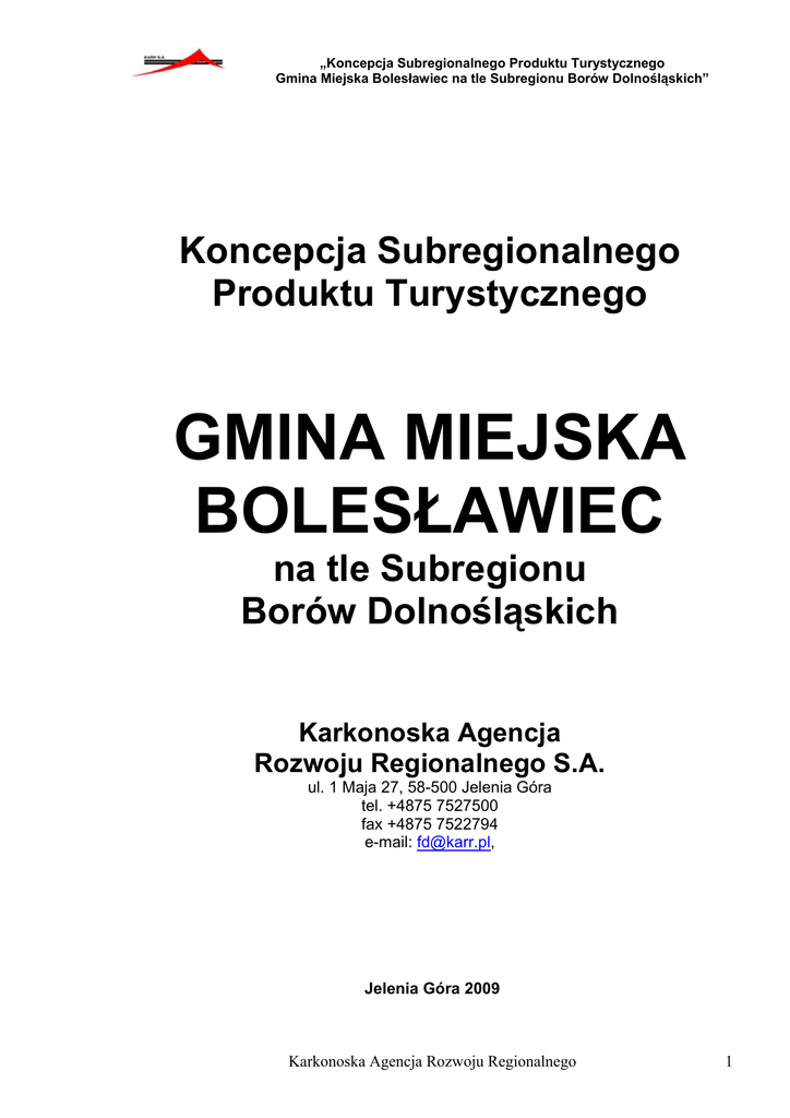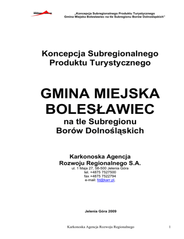 „Koncepcja Subregionalnego Produktu Turystycznego Gmina Miejska Bolesławiec na tle Subregionu Borów Dolnośląskich” Koncepcja Subregionalnego Produktu Turystycznego GMINA MIEJSKA BOLESŁAWIEC na tle Subregionu Borów Dolnośląskich Karkonoska Agencja Rozwoju Regionalnego S.A. ul. 1 Maja 27, 58-500 Jelenia Góra tel. +4875 7527500 fax +4875 7522794 e-mail: [email protected], Jelenia Góra 2009 Karkonoska Agencja Rozwoju Regionalnego 1 „Koncepcja Subregionalnego Produktu Turystycznego Gmina Miejska Bolesławiec na tle Subregionu Borów Dolnośląskich” „Postępuj według takiej tylko zasady, którą mógłbyś chcieć uczynić prawem powszechnym” Immanuel Kant 2 Karkonoska Agencja Rozwoju Regionalnego „Koncepcja Subregionalnego Produktu Turystycznego Gmina Miejska Bolesławiec na tle Subregionu Borów Dolnośląskich” Koncepcja Subregionalnego Produktu Turystycznego Borów Dolnośląskich została opracowana przez zespół w składzie: Karkonoska Agencja Rozwoju Regionalnego S. A. : dr Andrzej Raszkowski tel. kom.: 608 875 894 e-mail: [email protected] mgr Mariusz Zbadyński tel. kom.: 502 608 890 e-mail: [email protected] mgr Olga Danko e-mail: [email protected] mgr Artur Walicki e–mail: [email protected] Autorzy opracowania pragną podziękować wszystkim osobom i instytucjom, których wiedza i doświadczenie pozwoliły na powstanie niniejszej Koncepcji. Karkonoska Agencja Rozwoju Regionalnego 3 „Koncepcja Subregionalnego Produktu Turystycznego Gmina Miejska Bolesławiec na tle Subregionu Borów Dolnośląskich” Wstęp W dobie nasilonej konkurencji, także między Jednostkami Samorządu Terytorialnego, wiedza o posiadanych zasobach, umiejętność właściwego kreowania produktów turystycznych staje się kluczowym czynnikiem w aspekcie długofalowej strategii konkurencyjnej każdego regionu. Regiony, które w odpowiednim czasie wykreują własne unikalne produkty turystyczne mają szansę na szybszy rozwój i podniesienie jakości życia mieszkańców, które powinno być jednym z ważniejszych efektów finalnych wdrażanej Koncepcji. W każdej jednostce terytorialnej tkwi ukryty potencjał turystyczny, marketingowy, wizerunkowy. Koncepcja Subregionalnego Produktu Turystycznego Borów Dolnośląskich ma na celu optymalne wykorzystanie silnych stron i pojawiających się szans w otoczeniu w zakresie pozyskiwania turystów, inwestorów i rezydentów. Jest ona odpowiedzią na zapotrzebowanie w obszarze kreowania silnych produktów turystycznych i wzmacniania wizerunku danego obszaru. Różnicowanie swojej oferty na tle konkurencji jest jednym ze skutecznych sposobów promowania produktów turystycznych danej Jednostki Samorządu Terytorialnego. Organizowane imprezy, zabytki, produkty lokalne, szlaki turystyczne, zasoby naturalne właściwie wypromowane, pozwalają anonimowym dotychczas obszarom przekształcić się w atrakcyjne i chętnie odwiedzane przez turystów regiony. Harmonijny rozwój w zakresie turystyki powinien być wspomagany przez subregionalne sieciowe produkty turystyczne. Proponowana Koncepcja może być podstawą do przygotowania wniosków o dofinansowanie przedsięwzięć związanych z turystyką, która w nowym okresie programowania 2007-2013 traktowana jest jako jeden z priorytetów, a co za tym idzie przeznaczona jest znaczna pula środków pozabudżetowych na ten cel (m.in. Regionalny Program Operacyjny dla Województwa Dolnośląskiego na lata 2007 – 2013). Mamy nadzieję, że w niedalekiej przyszłości wykorzystanie Koncepcji Subregionalnego Produktu Turystycznego Borów Dolnośląskich przyczyni się do wzmocnienia pozycji konkurencyjnej Subregionu i rozwoju turystyki na jego terytorium. Autorzy 4 Karkonoska Agencja Rozwoju Regionalnego „Koncepcja Subregionalnego Produktu Turystycznego Gmina Miejska Bolesławiec na tle Subregionu Borów Dolnośląskich” Spis treści Wstęp _____________________________________________________________________4 Spis treści __________________________________________________________________5 1. Zasięg przestrzenny opracowania, położenie geograficzne obszaru „Bory Dolnośląskie” ______________________________________________________________8 2. Analiza potencjału turystycznego obszaru „Bory Dolnośląskie” na tle regionu _____10 2.1. Walory przyrodnicze dla rozwoju turystyki w wyodrębnionym obszarze __________10 2.1.1. 2.1.2. 2.1.3. 2.1.4. 2.1.5. 2.1.6. 2.1.7. 2.2. Budowa geologiczna i ukształtowanie powierzchni __________________________________ 10 Klimat _____________________________________________________________________ 10 Sieć hydrograficzna ___________________________________________________________ 10 Zróżnicowanie flory ___________________________________________________________ 14 Zróżnicowanie fauny __________________________________________________________ 15 Prawne formy ochrony przyrody _________________________________________________ 16 Stan środowiska naturalnego ____________________________________________________ 19 Walory kulturowe rozwoju turystyki _______________________________________27 2.2.1. Rys historyczno-kulturowy _____________________________________________________ 27 2.2.2. Obiekty architektury i budownictwa. ______________________________________________ 28 2.2.3. Muzea, zbiory i wystawy czasowe ________________________________________________ 45 2.2.4. Instytucje kulturalne___________________________________________________________ 46 2.2.5. Tradycje i imprezy lokalne-kulturalne (roczne kalendarium) ___________________________ 51 2.2.6. Pozamaterialne walory kulturowe (wybitne postacie, legendy, tradycje, obyczaje, przepisy kulinarne) __________________________________________________________________________ 57 2.3. Walory specjalistyczne i ich wykorzystanie dla turystyki aktywnej _______________68 2.3.1. Walory dla wędrówek pieszych __________________________________________________ 68 2.3.2. Walory wędkarskie ___________________________________