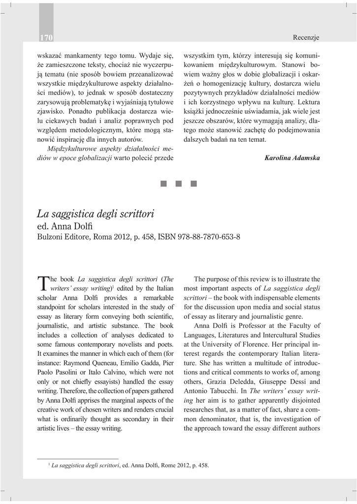 Recenzje 170 wskazaü mankamenty tego tomu. Wydaje siĊ, Īe zamieszczone teksty, chociaĪ nie wyczerpują tematu (nie sposób bowiem przeanalizowaü wszystkie miĊdzykulturowe aspekty dziaáalnoĞci mediów), to jednak w sposób dostateczny zarysowują problematykĊ i wyjaĞniają tytuáowe zjawisko. Ponadto publikacja dostarcza wielu ciekawych badaĔ i analiz poprawnych pod wzglĊdem metodologicznym, które mogą stanowiü inspiracjĊ dla innych autorów. MiĊdzykulturowe aspekty dziaáalnoĞci mediów w epoce globalizacji warto poleciü przede t wszystkim tym, którzy interesują siĊ komunikowaniem miĊdzykulturowym. Stanowi bowiem waĪny gáos w dobie globalizacji i oskarĪeĔ o homogenizacjĊ kultury, dostarcza wielu pozytywnych przykáadów dziaáalnoĞci mediów i ich korzystnego wpáywu na kulturĊ. Lektura ksiąĪki jednoczeĞnie uĞwiadamia, jak wiele jest jeszcze obszarów, które wymagają analizy, dlatego moĪe stanowiü zachĊtĊ do podejmowania dalszych badaĔ na ten temat. Karolina Adamska t t La saggistica degli scrittori ed. Anna DolÞ Bulzoni Editore, Roma 2012, p. 458, ISBN 978-88-7870-653-8 T he book La saggistica degli scrittori (The writers’ essay writing)1 edited by the Italian scholar Anna DolÞ provides a remarkable standpoint for scholars interested in the study of essay as literary form conveying both scientiÞc, journalistic, and artistic substance. The book includes a collection of analyses dedicated to some famous contemporary novelists and poets. It examines the manner in which each of them (for instance: Raymond Queneau, Emilio Gadda, Pier Paolo Pasolini or Italo Calvino, which were not only or not chießy essayists) handled the essay writing. Therefore, the collection of papers gathered by Anna DolÞ apprises the marginal aspects of the creative work of chosen writers and renders crucial what is ordinarily thought as secondary in their artistic lives – the essay writing. 1 The purpose of this review is to illustrate the most important aspects of La saggistica degli scrittori – the book with indispensable elements for the discussion upon media and social status of essay as literary and journalistic genre. Anna DolÞ is Professor at the Faculty of Languages, Literatures and Intercultural Studies at the University of Florence. Her principal interest regards the contemporary Italian literature. She has written a multitude of introductions and critical comments to works of, among others, Grazia Deledda, Giuseppe Dessí and Antonio Tabucchi. In The writers’ essay writing her aim is to gather apparently disjointed researches that, as a matter of fact, share a common denominator, that is, the investigation of the approach toward the essay different authors La saggistica degli scrittori, ed. Anna DolÞ, Rome 2012, p. 458. Recenzje expressed in their writing. In the Introduction she emphasizes that the theme being too wide cannot be exposed properly within a single publication. Indeed, a totalizing research upon the essay writing should include papers dedicated to Dante and Petrarch essays as well, in other words – to every writer or poet who wrote some essays. Considered the objective impossibility to accomplish such a task, The writers’ essay writing has no pretensions to completeness and covers the 20th century writers alone. In her enterprise Anna DolÞ has gathered many Italian researchers. It would not be easy to present such a group as a cohesive academic environment with respect to, for instance, the methodological approach or cultural background. Every scholar has presented a reßection upon the essay writing of the author constituting the main Þeld of his/her scientiÞc interests. The writers’ essay writing is divided into Þve parts. The Þrst one, entitled Models and declinations (Modelli e declinazioni), is the most general one and the most interesting from the theoretical point of view. It regards, for instance, the metaliterature aspects of the essay writing. As it is almost impossible to give a deÞnition of essay upon which all the scholars would agree – this is one of few certainties that the most respected experts of the subject share – it is better, as Enza Biagini, the author of the Þrst chapter, suggests, to use the Claire de Obaldia’s2 formula ‘the essayistic spirit’, which epitomizes genre’s fragmentary and collective nature, its liberty to treat a variety of themes and its implicit reference to the subjectivity of the essay-writer experience. The formula should be comprehended as a kind of methodological basis upon which the building represented by all the other studies edited by DolÞ will be con- 2 171 structed. Indeed, only a metaliterature ‘deÞnition’ of essay is sufÞciently wide to embrace the variety of different types of literature approach that the essay as genre contains. The second chapter of the Þrst part is worth being taken into particular consideration. It presents an attention-grabbing thesis regarding the current place of the essay within the literature studies. This chapter, indeed, allows the scholars the opening of general discussion about the reasons of essay’s alleged deterioration. The author of the chapter is Marielle Macé. The French scholar alludes to Patrick Mauriès’ diagnosis, according to which in the mid Eighties of the 20th Century, after the intellectuals like Jean-Paul Sartre, Roland Barthes and Michel Foucault had deceased, the readers created by their essayistic writings were left orphans. What Macé is suggesting between the lines is that the essay as a genre reached its zenith during the second half of the past century. Afterwards we witnessed a period of decadence, given that such a valuable type of writing has not found new interprets, and nowadays we are still lacking in good essayistic. In addition to that, in an even more veiled manner, Macé seems to suggest that essay as genre cultivates a speciÞc type of reader. On the margin of her reßection, we can im