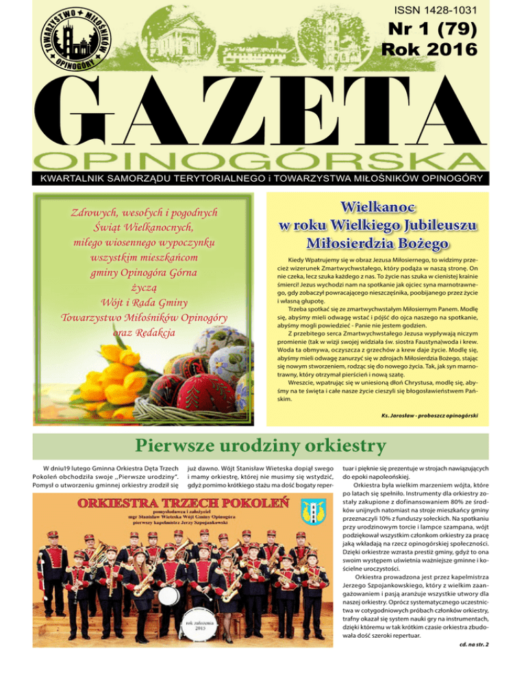 ISSN 1428-1031 Nr 1 (79) Rok 2016 KWARTALNIK SAMORZĄDU TERYTORIALNEGO i TOWARZYSTWA MIŁOŚNIKÓW OPINOGÓRY Zdrowych, wesołych i pogodnych Świąt Wielkanocnych, miłego wiosennego wypoczynku wszystkim mieszkańcom gminy Opinogóra Górna życzą Wójt i Rada Gminy Towarzystwo Miłośników Opinogóry oraz Redakcja Wielkanoc w roku Wielkiego Jubileuszu Miłosierdzia Bożego Kiedy Wpatrujemy się w obraz Jezusa Miłosiernego, to widzimy przecież wizerunek Zmartwychwstałego, który podąża w naszą stronę. On nie czeka, lecz szuka każdego z nas. To życie nas szuka w cienistej krainie śmierci! Jezus wychodzi nam na spotkanie jak ojciec syna marnotrawnego, gdy zobaczył powracającego nieszczęśnika, poobijanego przez życie i własną głupotę. Trzeba spotkać się ze zmartwychwstałym Miłosiernym Panem. Modlę się, abyśmy mieli odwagę wstać i pójść do ojca naszego na spotkanie, abyśmy mogli powiedzieć - Panie nie jestem godzien. Z przebitego serca Zmartwychwstałego Jezusa wypływają niczym promienie (tak w wizji swojej widziała św. siostra Faustyna)woda i krew. Woda ta obmywa, oczyszcza z grzechów a krew daje życie. Modlę się, abyśmy mieli odwagę zanurzyć się w zdrojach Miłosierdzia Bożego, stając się nowym stworzeniem, rodząc się do nowego życia. Tak, jak syn marnotrawny, który otrzymał pierścień i nową szatę. Wreszcie, wpatrując się w uniesioną dłoń Chrystusa, modlę się, abyśmy na te święta i całe nasze życie cieszyli się błogosławieństwem Pańskim. Ks. Jarosław - proboszcz opinogórski Pierwsze urodziny orkiestry W dniu19 lutego Gminna Orkiestra Dęta Trzech Pokoleń obchodziła swoje ,,Pierwsze urodziny”. Pomysł o utworzeniu gminnej orkiestry zrodził się już dawno. Wójt Stanisław Wieteska dopiął swego i mamy orkiestrę, której nie musimy się wstydzić, gdyż pomimo krótkiego stażu ma dość bogaty reper- tuar i pięknie się prezentuje w strojach nawiązujących do epoki napoleońskiej. Orkiestra była wielkim marzeniem wójta, które po latach się spełniło. Instrumenty dla orkiestry zostały zakupione z dofinansowaniem 80% ze środków unijnych natomiast na stroje mieszkańcy gminy przeznaczyli 10% z funduszy sołeckich. Na spotkaniu przy urodzinowym torcie i lampce szampana, wójt podziękował wszystkim członkom orkiestry za pracę jaką wkładają na rzecz opinogórskiej społeczności. Dzięki orkiestrze wzrasta prestiż gminy, gdyż to ona swoim występem uświetnia ważniejsze gminne i kościelne uroczystości. Orkiestra prowadzona jest przez kapelmistrza Jerzego Szpojankowskiego, który z wielkim zaangażowaniem i pasją aranżuje wszystkie utwory dla naszej orkiestry. Oprócz systematycznego uczestnictwa w cotygodniowych próbach członków orkiestry, trafny okazał się system nauki gry na instrumentach, dzięki któremu w tak krótkim czasie orkiestra zbudowała dość szeroki repertuar. cd. na str. 2 2 Pierwsze urodziny orkiestry (cd. ze str. 1) Skład orkiestry: Kapelmistrz - Jerzy Szpojankowski Zygmunt Samkowski z Czernic - saksofon tenorowy Mirosław Laskowski z Klonowa - tuba bas Dariusz Kowalski z Czernic - trąbka Jacek Zbrzezny z Opinogóry Dolnej - tenor I B Jarosław Pyra z Łęk - czynele Arkadiusz Kujawa z Opinogóry Górnej - tenor II B Joanna Mossakowska z Niemierzyc - saksofon altowy Marek Mossakowski z Niemierzyc - trąbka Marek Rutkowski z Wróblewa - saksofon altowy Jan Nowotka z Bogucina - saksofon barytonowy Krystian Guszkowski z Kobylina – klarnet B Bartosz Nowotka z Bogucina - saksofon sopranowy Marta Baranowska z Kołaczkowa - saksofon altowy Rafał Nowotka z Bogucina - werbel Cezary Szymankiewicz z Opinogóry Górnej - bęben duży Mateusz Trukawka z Opinogóry Górnej - horn altowy Adam Zbrzezny z Opinogóry Dolnej - horn altowy Bartosz Trukawka z Opinogóry Górnej - horn altowy PROGRAM „RODZINA 500+” Od kiedy można składać wnioski? Gdzie można składać wnioski? Wnioski można składać od 1 kwietnia 2016 r. Jeżeli wniosek zostanie złożony w okresie od 1 kwietnia do 1 lipca 2016 r. włącznie, świadczenie zostanie wypłacone z wyrównaniem od kwietnia br. Po 1 lipca br. świadczenia będą wypłacane od miesiąca w którym złożono wniosek. Wnioski można składać osobiście, w siedzibie Gminnego Ośrodka Pomocy Społecznej w Opinogórze Górnej, w kwietniu br. od poniedziałku do piątku w godz. 7:45 – 15.45 Wnioski można również złożyć w wersji elektronicznej za pośrednictwem platformy PUE ZUS, @Empatia, ePUAP oraz wybranych systemów bankowych. Gdzie można pobrać wniosek? Komu przysługuje świadczenie tzw. 500+ na „pierwsze dziecko”? Wnioski wraz z załącznikami można pobrać: 1) ze strony internetowej (załączniki do informacji), od 7 marca 2016 r. adres srony: http://ugportal.opinogoragorna.pl w zakładce ,,aktualności” 2) w siedzibie GOPS – Opinogóra Górna, ul. Krasińskiego 4, 06-406 Opinogóra Górna od 7 marca 2016 r. 3) ze strony MRPiPS wersji elektronicznej dostępnej od 1 kwietnia 2016 r. za pośrednictwem platformy PUE ZUS, @Empatia, ePUAP oraz wybranych systemów bankowych. Adres strony: www.empatia.mrpips.gov.pl Świadczenie 500+ na pierwsze dziecko przysługuje rodzinom, w którym dochód nie przekracza kwoty 800 zł na osobę w rodzinie, lub 1200 zł na osobę, jeżeli w rodzinie wychowuje się dziecko niepełnosprawne. W obecnym okresie świadczeniowym pod uwagę brane są dochody osiągnięte za rok 2014 (pomniejszone o podatek, składki na ubezpieczenie zdrowotne i społeczne), oraz dochody nieopodatkowane np. dochód z gospodarstwa rolnego (obecnie dochód z 1 ha przel. wynosi 208,83 zł) zasiłki chorobowe z KRUS, stypendia, alimenty, diety, dochody z wynajmu i inne wymienione w ustawie. Kto wchodzi w skład rodziny? ZESPÓŁ REDAKCYJNY: Zbigniew Ptasiewicz (red. nacz.) Małgorzata Bieraga - Ptasiewicz Beata Golasińska Bożena Królik Wojciech Kowalski Bożena Siemionko Adres Redakcji: 06-406 Opinogóra 