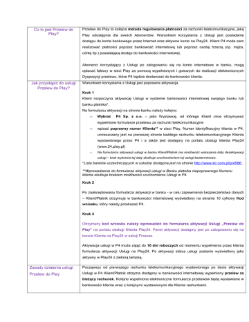 Co to jest Przelew do Play? Przelew do Play to kolejna metoda regulowania płatności za rachunki telekomunikacyjne, jaką Play udostępnia dla swoich Abonentów. Warunkiem korzystania z Usługi jest posiadanie dostępu do konta bankowego przez Internet oraz aktywne konto na Play24. Klient P4 może sam realizować płatności poprzez bankowość internetową lub poprzez osobę trzecią (np. męża, córkę itp.) posiadającą dostęp do bankowości internetowej. Abonenci korzystający z Usługi po zalogowaniu się na konto internetowe w banku, mogą opłacać faktury w sieci Play za pomocą wypełnionych i gotowych do realizacji elektronicznych Dyspozycji przelewu, które P4 będzie dostarczać do bankowości klienta. Jak przystąpić do usługi Przelew do Play? Warunkiem korzystania z Usługi jest poprawna aktywacja. Krok 1 Klient rozpoczyna aktywację Usługi w systemie bankowości internetowej swojego banku lub banku płatnika*. Na formularzu aktywacji na stronie banku należy kolejno: • Wybrać P4 Sp. z o.o. – jako Wystawcę, od którego Klient chce otrzymywać wypełnione formularze przelewu za rachunki telekomunikacyjne • wpisać poprawny numer Klienta** w sieci Play. Numer identyfikacyjny klienta w P4, umieszczany jest na pierwszej stronie każdego rachunku telekomunikacyjnego Klienta wystawianego przez P4 i a także jest dostępny na portalu obsługi klienta Play24 (www.24.play.pl) • Na formularzu aktywacji usługi w banku Klient/Płatnik ma możliwość wskazania daty dezaktywacji usługi – brak wybrania tej daty skutkuje uruchomieniem tej usługi bezterminowo. *Lista banków uczestniczących w usłudze dostępna jest na stronie http://www.kir.com.pl/p/4586. **Wprowadzenie do formularza aktywacji usługi w Banku płatnika niepoprawnego Numeru klienta skutkuje brakiem możliwości uruchomienia Usługi w P4. Krok 2 Po zaakceptowaniu formularza aktywacji w banku - w celu zapewnienia bezpieczeństwa danych – Klient/Płatnik otrzymuje w bankowości internetowej wyświetlony na ekranie 10 cyfrowy Kod wniosku, który należy przekazać P4. Krok 3 Otrzymany kod wniosku należy wprowadzić do formularza aktywacji Usługi „Przelew do Play” na portalu obsługi Klienta Play24. Panel aktywacji dostępny jest po zalogowaniu się na koncie Klienta na Play24 w sekcji Finanse. Aktywacja usługi w P4 może zająć do 10 dni roboczych od momentu wypełnienia przez klienta formularza aktywacji Usługi na Play24. Po aktywacji status usługi zostanie wyświetlony jako aktywny w Play24 z zieloną lampką. Zasady działania usługi Począwszy od pierwszego rachunku telekomunikacyjnego wystawionego po dacie aktywacji Przelew do Play Usługi w P4 Klient/Płatnik otrzyma dostępny w bankowości internetowej wypełniony przelew za bieżący rachunek. Kolejne wypełnione elektroniczne formularze przelewów będą wystawiane w bankowości klienta wraz z kolejnymi wystawionymi dla Klienta rachunkami. Przelewy wystawiane w bankowości internetowej Klienta/Płatnika w ramach Usługi nie będą realizowane automatycznie. Warunkiem realizacji przelewu jest tradycyjnie otwarcie i akceptacja przelewu w sposób odpowiedni dla danej bankowości internetowej. Przelew do Play uruchamiany jest odrębnie dla każdego konta abonenckiego Klienta w P4. Jeśli Klient posiada w Play kilka kont abonenckich – dla każdego konta należy osobno aktywować Usługę. W ramach działania Usługi dla każdego wystawionego dla Klienta rachunku telekomunikacyjnego powstanie Dyspozycja płatności na kwotę równą wartości do zapłaty bieżącego rachunku telekomunikacyjnego. Klient korzystający z Usługi „Przelew do Play” będzie otrzymywał rachunki za usługi telekomunikacyjne na dotychczasowych zasadach – jedyna zmiana dotyczy Druku polecenia przelewu, który nie będzie, od momentu aktywacji usługi, dołączany do rachunku. Proces aktywacji i dezaktywacji Usługi inicjowany jest przez Klienta/Płatnika w bankowości internetowej. Zasady zmiany numeru W celu zmiany numeru rachunku bankowego, na którym prowadzona jest Usługa Klient powinien rachunku bankowego dla odpowiednio: usługi. • Dezaktywować w bankowości internetowej usługę na dotychczasowym rachunku bankowym • Aktywować usługę w bankowości internetowej właściwej dla nowego rachunku bankowego • Nowy kod wniosku - dla nowego rachunku bankowego- przekazać do P4 przez play24 w celu aktywacji Usługi Przelew do Play na nowym rachunku. Usługa wygasa w dniu wskazanym, jako data końca obowiązywania usługi – wskazanym przez Klienta/Płatnika na formularzu aktywacji usługi w banku Płatnika. Zasady dezaktywacji usługi. Dla usługi bezterminowej Klient/Płatnik może w każdej chwili zakończyć działanie Przelewu do Play bezpośrednio w bankowości internetowej - usługa zostanie wyłączona w P4 w ciągu 10 dni roboczych. Klient może również zlecić w P4 dezaktywację usługi. Usługa jest dezaktywowana w P4 dla konta abonenckiego, dla którego została włączona. Jeżeli Klient ma więcej niż jedno konto abonenckie w Play – odpowiednio dla każdego konta abonenckiego należy dezaktywować usługę oddzielnie. Wygaśniecie lub usuniecie usługi nie pozbawia Klienta możliwości złożenia do P4 kolejnego wniosku o aktywację usługi. Przelew do Play a Jeśli klient korzysta z Polecenia Zapłaty lub usługa ta jest w trakcie aktywacji, przed Polecenie zapłaty w Play. uruchomieniem Przelewu do Play, powinien przesłać do P4 wypełniony formularz Odwołania zgody na obciążanie rachunku. Po dezaktywacji usługi Polecenia zapłaty Klient może przystąpić do aktywacji Przelewu do Play na stronie bankowości internetowej. Jeżeli natomiast Klient jest w trakcie aktywacji lub korzysta z usługi Przelew do Play, a chciałby aktywować usługę Polecenia zapłaty wówczas powinien dezaktywować usługę Przelew do Play w bankowości internetowej a następnie przesłać do P4 wypełniony formularz Zgody na obciążanie rachunk