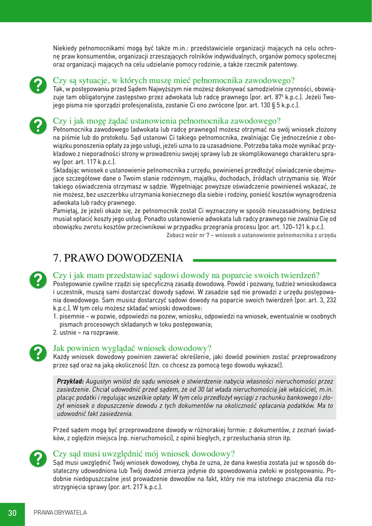 Niekiedy pełnomocnikami mogą być także m.in.: przedstawiciele organizacji mających na celu ochronę praw konsumentów, organizacji zrzeszających rolników indywidualnych, organów pomocy społecznej oraz organizacji mających na celu udzielanie pomocy rodzinie, a także rzecznik patentowy. Czy są sytuacje, w których muszę mieć pełnomocnika zawodowego? Tak, w postępowaniu przed Sądem Najwyższym nie możesz dokonywać samodzielnie czynności, obowiązuje tam obligatoryjne zastępstwo przez adwokata lub radcę prawnego (por. art. 87¹ k.p.c.). Jeżeli Twojego pisma nie sporządzi profesjonalista, zostanie Ci ono zwrócone (por. art. 130 § 5 k.p.c.). Czy i jak mogę żądać ustanowienia pełnomocnika zawodowego? Pełnomocnika zawodowego (adwokata lub radcę prawnego) możesz otrzymać na swój wniosek złożony na piśmie lub do protokołu. Sąd ustanowi Ci takiego pełnomocnika, zwalniając Cię jednocześnie z obowiązku ponoszenia opłaty za jego usługi, jeżeli uzna to za uzasadnione. Potrzeba taka może wynikać przykładowo z nieporadności strony w prowadzeniu swojej sprawy lub ze skomplikowanego charakteru sprawy (por. art. 117 k.p.c.). Składając wniosek o ustanowienie pełnomocnika z urzędu, powinieneś przedłożyć oświadczenie obejmujące szczegółowe dane o Twoim stanie rodzinnym, majątku, dochodach, źródłach utrzymania się. Wzór takiego oświadczenia otrzymasz w sądzie. Wypełniając powyższe oświadczenie powinieneś wskazać, że nie możesz, bez uszczerbku utrzymania koniecznego dla siebie i rodziny, ponieść kosztów wynagrodzenia adwokata lub radcy prawnego. Pamiętaj, że jeżeli okaże się, że pełnomocnik został Ci wyznaczony w sposób nieuzasadniony, będziesz musiał opłacić koszty jego usług. Ponadto ustanowienie adwokata lub radcy prawnego nie zwalnia Cię od obowiązku zwrotu kosztów przeciwnikowi w przypadku przegrania procesu (por. art. 120–121 k.p.c.). Zobacz wzór nr 7 – wniosek o ustanowienie pełnomocnika z urzędu 7. PRAWO DOWODZENIA Czy i jak mam przedstawiać sądowi dowody na poparcie swoich twierdzeń? Postępowanie cywilne rządzi się specyficzną zasadą dowodową. Powód i pozwany, tudzież wnioskodawca i uczestnik, muszą sami dostarczać dowody sądowi. W zasadzie sąd nie prowadzi z urzędu postępowania dowodowego. Sam musisz dostarczyć sądowi dowody na poparcie swoich twierdzeń (por. art. 3, 232 k.p.c.). W tym celu możesz składać wnioski dowodowe: 1. p isemnie – w pozwie, odpowiedzi na pozew, wniosku, odpowiedzi na wniosek, ewentualnie w osobnych pismach procesowych składanych w toku postępowania; 2. u stnie – na rozprawie. Jak powinien wyglądać wniosek dowodowy? Każdy wniosek dowodowy powinien zawierać określenie, jaki dowód powinien zostać przeprowadzony przez sąd oraz na jaką okoliczność (tzn. co chcesz za pomocą tego dowodu wykazać). Przykład: Augustyn wniósł do sądu wniosek o stwierdzenie nabycia własności nieruchomości przez zasiedzenie. Chciał udowodnić przed sądem, że od 30 lat włada nieruchomością jak właściciel, m.in. płacąc podatki i regulując wszelkie opłaty. W tym celu przedłożył wyciągi z rachunku bankowego i złożył wniosek o dopuszczenie dowodu z tych dokumentów na okoliczność opłacania podatków. Ma to udowodnić fakt zasiedzenia. Przed sądem mogą być przeprowadzone dowody w różnorakiej formie: z dokumentów, z zeznań świadków, z oględzin miejsca (np. nieruchomości), z opinii biegłych, z przesłuchania stron itp. Czy sąd musi uwzględnić mój wniosek dowodowy? Sąd musi uwzględnić Twój wniosek dowodowy, chyba że uzna, że dana kwestia została już w sposób dostateczny udowodniona lub Twój dowód zmierza jedynie do spowodowania zwłoki w postępowaniu. Podobnie niedopuszczalne jest prowadzenie dowodów na fakt, który nie ma istotnego znaczenia dla rozstrzygnięcia sprawy (por. art. 217 k.p.c.). 30 PRAWA OBYWATELA Do kiedy mogę składać wnioski dowodowe? Wnioski dowodowe można składać do końca postępowania w pierwszej instancji. Kiedy sprawa jest w drugiej instancji, zgłaszanie nowych dowodów jest co do zasady wykluczone. Możesz powołać się na nie jedynie, gdy zgłosisz je w środku odwoławczym i pod warunkiem, że wykażesz, iż wcześniejsze ich powołanie było niemożliwe lub że potrzeba ich powołania wynikła już w toku postępowania apelacyjnego (por. art. 368 § 1 pkt 4, 381 k.p.c.). Będąc powodem pamiętaj, że w sprawach gospodarczych (czyli między przedsiębiorcami) masz obowiązek powołać wszystkie dowody już w pozwie, pod rygorem utraty prawa powoływania się na nie w czasie postępowania, chyba że wykażesz, że powołanie określonych dowodów w pozwie nie było możliwe lub taka potrzeba wynikła później. W takim przypadku nowe dowody możesz powołać w terminie 2 tygodni od dnia, w którym powołanie dowodu stało się możliwe lub wynikła potrzeba jego powołania (por. art. 47912 k.p.c.). 8. PRAWO DO INFORMACJI Czy w trakcie postępowania mogę zajrzeć do akt celem sprawdzenia pewnych faktów, sporządzenia odpisów itd.? Jako strona postępowania, masz pełne prawo do zapoznawania się w sekretariacie sądu z aktami swojej sprawy. To samo dotyczy sporządzania wyciągów i odpisów z akt, przy czym za sporządzone kserokopie z akt sprawy będziesz musiał zapłacić tzw. opłatę kancelaryjną. Za zwykłą kserokopię strony z akt będziesz musiał zapłacić 1 zł, zaś za odpis poświadczony 6 zł za stronę. Przykład: Bogumiła była córką Maksymiliana. Gdy Maksymilian zmarł, wszczęte zostało postępowanie o stwierdzenie nabycia spadku. Bogumiła może, jako należąca do kręgu spadkobierców po Maksymilianie, a tym samym uczestniczka postępowania, uzyskać z urzędu dostęp do akt sprawy. Czy sąd będzie mnie informował o różnych czynnościach w postępowaniu? Tak, sąd ma np. obowiązek powiadomienia Cię o terminie najbliższej rozprawy, na piśmie l