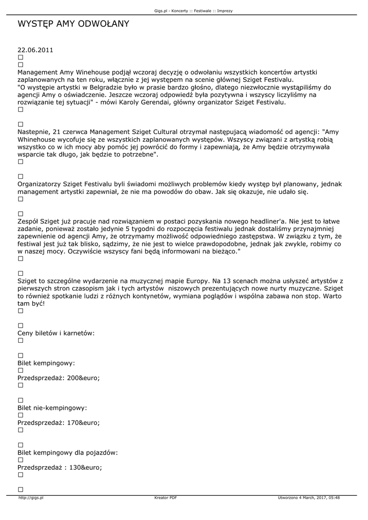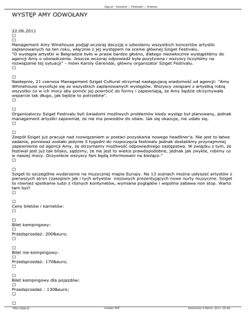 Gigs.pl - Koncerty :: Festiwale :: Imprezy WYSTĘP AMY ODWOŁANY 22.06.2011 Management Amy Winehouse podjął wczoraj decyzję o odwołaniu wszystkich koncertów artystki zaplanowanych na ten roku, włącznie z jej występem na scenie głównej Sziget Festivalu. "O występie artystki w Belgradzie było w prasie bardzo głośno, dlatego niezwłocznie wystąpiliśmy do agencji Amy o oświadczenie. Jeszcze wczoraj odpowiedź była pozytywna i wszyscy liczyliśmy na rozwiązanie tej sytuacji" - mówi Karoly Gerendai, główny organizator Sziget Festivalu. Nastepnie, 21 czerwca Management Sziget Cultural otrzymał następujacą wiadomość od agencji: "Amy Whinehouse wycofuje się ze wszystkich zaplanowanych występów. Wszyscy związani z artystką robią wszystko co w ich mocy aby pomóc jej powrócić do formy i zapewniają, że Amy będzie otrzymywała wsparcie tak długo, jak będzie to potrzebne". Organizatorzy Sziget Festivalu byli świadomi możliwych problemów kiedy występ był planowany, jednak management artystki zapewniał, że nie ma powodów do obaw. Jak się okazuje, nie udało się. Zespół Sziget już pracuje nad rozwiązaniem w postaci pozyskania nowego headliner'a. Nie jest to łatwe zadanie, ponieważ zostało jedynie 5 tygodni do rozpoczęcia festiwalu jednak dostaliśmy przynajmniej zapewnienie od agencji Amy, że otrzymamy możliwość odpowiedniego zastępstwa. W związku z tym, że festiwal jest już tak blisko, sądzimy, że nie jest to wielce prawdopodobne, jednak jak zwykle, robimy co w naszej mocy. Oczywiście wszyscy fani będą informowani na bieżąco." Sziget to szczególne wydarzenie na muzycznej mapie Europy. Na 13 scenach można usłyszeć artystów z pierwszych stron czasopism jak i tych artystów niszowych prezentujących nowe nurty muzyczne. Sziget to również spotkanie ludzi z różnych kontynetów, wymiana poglądów i wspólna zabawa non stop. Warto tam być! Ceny biletów i karnetów: Bilet kempingowy: Przedsprzedaż: 200€ Bilet nie-kempingowy: Przedsprzedaż: 170€ Bilet kempingowy dla pojazdów: Przedsprzedaż : 130€ http://gigs.pl Kreator PDF Utworzono 4 March, 2017, 05:48 Gigs.pl - Koncerty :: Festiwale :: Imprezy Bilet jednodniowy: Przedsprzedaż i na miejscu: 45€ Bilety dostępne na terenie Polski tylko w sieci Eventim! Swój udział w festiwalu w tym roku potwierdzili: Batucada Sound Machine, Ben l'Oncle Soul, British Sea Power, Dizzee Rascal, Flogging Molly, Gogol Bordello, Good Charlotte , Hadouken!, Interpol, Kasabian, La Roux , Manic Street Preachers, Mariachi El Bronx, Overflow, Pulp, Rise Against, Skunk Anansie, The Chemical Brothers, The Maccabees, The National White Lies, Elvis Jackson , For a Minor Reflection, Francis International Airport, Go back to the Zoo, Gravity Co., Ismo Alanko & Teho, KILLO KILLO Banda, Mitch&Mitch, Puding Pani Elvisovej Skyline, Söhne Mannheims, The Mono Jacks, Triggerfinger Verdena, Wallace Vanborn, AfroCubism, Cheikh Lo, Choc Quib Town, Cowboy Junkies, Csík Zenekar, Debout Sur Le Zinc Goran Bregovic Wedding And Funeral Band 2011, Gotan Project, LaBrassBanda Lajkó Félix , Les Hurlements d’Léo, Magnifico, Muzsikás, Oi Va Voi, Ojos de Brujo, Rotfront, Shtetl Superstars, Ska Cubano Sly & Robbie feat. Jr. Reid, Socalled, Baskerville, Bomb the Bass, Buraka Som Sistema, Crystal Castles, De Jeugd van Tegenwoordig, DeWolff, Digital Mystikz, Dorian Concept, Electralane, Gaslamp Killer, Hudson Mohawke, Hurts, Kees van Hondt, Kode9, Marina and the Diamonds, Peter Bjorn and John, Selah Sue, Suicidal Tendencies, Terry Poison, Turbostaat, Watchaclan, Xiu Xiu, 2manydjs, Above & Beyond, Bloody Beetroots , Death Crew 77,Carlo Lio, Cristian Varela, Dubfire, Goose Kid Cudi Richie Hawtin, Technasia, Trentemøller., Zombie Nation, Alexkid , Dario Zenker, Dewalta, Feelipa, Mlle Caro, Nico Purman, Ollywood , RackNRuin, Reality Engine , Scratcha DVA, Torqux & Twist, Torqux & Twist, 3 Feet Smaller, Deftones, Helloween, Judas Priest, Lostprophets, Motörhead, Sonata Arctica, Tankcsapda, The Sorrow, Within Temptation, Roma Tent, Amsterdam Klezmer Band, BerlinskiBeat, Besh o droM, Dhoad Gypsies of Rajasthan, DJ Robert Soko, DJ Tagada, Esma Redzepova, Giani Lincan, Goulash Exotica DJ, GypsySoundSystem, Kal, Kanizsa Csillagai, Kumpanya Istanbul, Parno Graszt, Poros feat. Magyarpalatkai Banda, Shutka Roma Rap, Söndörgõ feat. Baltazar Montanaro, Técsõi Banda, Tekameli, Transkapela, Traktorkestar, Vano Bamberger & Band, Vojasa, Afro DZAQM, Gravefruit Sound, Kingston Cruisers, Ocho Macho, Cöxpon Ambient Tent, Amygdala, Aphics, Burkus König Zenekar, CZT, Dhammapada Dub Collective, Flyjam , Fókatelep, H.A.R., I-One, Kis Erzsi Zenekar, Lacchus, Latam, Living Totem, Milendee, Myzrab Zenekar, Nameless City, N.O.I., Óperentzia, Psyla, Peacedefender, Pupilla, Rare, Savage, Sickpicnic, Soulrise, The Global Optimistic, Tobie és Aksel, Volkova Sisters DODATKOWE INFORMACJE: Wyżywienie na festiwalu: 75 stoisk z jedzeniem – Od pizzy do sałatek lub od gyrosa do gulaszu Mamy teren dla międzynarodowej kuchni, gdzie 12 różnych krajów pokazuje swoje specjalności. Zakres cen: Pizza – 550 HUF + / ~1,8 GBP + / ~2 EUR + Kebab – 900 HUF + / ~3 GBP + / ~ 3,4 EUR + Danie na talerzu -900-1500 HUF + / ~3 – 5 GBP + / ~3,4-5,7 EUR + http://gigs.pl Kreator PDF Utworzono 4 March, 2017, 05:48 Gigs.pl - Koncerty :: Festiwale :: Imprezy Informacje o piciu na Festiwalu; ceny: 72 bary 7 winiarni 5 pijalni pálinka (Węgierska specjalność, brandy) 7 kafejek 2 herbaciarnie Zakres cen: Piwo (0.5 litra) – 400 HUF +/ ~1,35 GBP +/ ~ 1,5 EUR + Wino (100ml) – 250 HUF + / ~0,85 GBP +/ ~1 EUR + Szoty (40ml) – 700 HUF + / ~2,4 GBP +/ ~2,65 EUR + Wrocław, 06 czerwca 2011 DATA: 8-15.08.2011 MIEJSCE: BUDAPESZT, WYSPA OBUDAI, WEGRY WEJŚCIE: NON-STOP BILETY: Bilet kempingowy (Przedsprzedaż od 1-go maja i na miejscu: 200€), Bilet nie-kempingowy: (Przedsprzedaż od 1-go maja i na miejscu: 170€), Bilet kempingowy dla pojazdów: (Przedspr