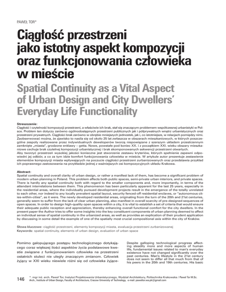 Paweł Tor* Ciągłość przestrzeni jako istotny aspekt kompozycji oraz funkcjonowania człowieka w mieście Spatial Continuity as a Vital Aspect of Urban Design and City Dwellers’ Everyday Life Functionality Streszczenie: Ciągłość i czytelność kompozycji przestrzeni, a właściwie ich brak, stał się znaczącym problemem współczesnej urbanistyki w Polsce. Problem ten dotyczy zarówno ogólnodostępnych przestrzeni publicznych jak i półprywatnych wnętrz urbanistycznych oraz przestrzeni prywatnych. Ciągłości brak zarówno w obrębie mniejszych jednostek, jak i, co istotniejsze, w relacjach pomiędzy nimi. Zaobserwować można, że zjawisko to nasila się od około 25 lat zwłaszcza w obszarach mieszkaniowych, w których poszczególne zespoły realizowane przez indywidualnych deweloperów tworzą niepowiązane z szerszym układem przestrzennym zamknięte „miasta”, grodzone enklawy – getta. Nowe, powstałe pod koniec XX. i z początkiem XXI. wieku obszary mieszkaniowe cechuje brak czytelnej kompozycji urbanistycznej i brak skomponowanych sekwencji przestrzeni otwartych. Aby tworzyć przestrzeń wysokiej jakości konieczne jest stworzenie zestawu kryteriów, których spełnienie zapewni odpowiedni jej odbiór, a co za tym idzie komfort funkcjonowania człowieka w mieście. W artykule autor prezentuje zestawienie elementów kompozycji miasta wpływających na poczucie ciągłości przestrzeni zurbanizowanych oraz przedstawia przykład ich poprawnego zastosowania na przykładzie jednej z ważniejszych osi kompozycyjnych układu Krakowa. Abstract: Spatial continuity and overall clarity of urban design, or rather a manifest lack of them, has become a significant problem of modern urban planning in Poland. This problem affects both public spaces, semi-private urban interiors, and private spaces. There is hardly any spatial continuity both with regard to the smaller components and, more importantly, in terms of the attendant interrelations between them. This phenomenon has been particularly apparent for the last 25 years, especially in the residential areas, where the individually pursued development projects result in the emergence of the totally unrelated to each other, nor indeed to any locally prevalent spatial layout, security fenced-off residential enclaves, or “autonomous cities-within-cities”, as it were. The newly developed residential areas, originating from the turn of the 20th and 21st centuries, generally seem to suffer from the lack of clear urban planning, also manifest in overall scarcity of pre-designed sequences of open spaces. In order to design high-quality open spaces within a city, it is vital to establish a set of criteria that would ensure their adequate public reception and appreciation, thereby enhancing overall functional comfort for the city dwellers. In the present paper the Author tries to offer some insights into the key constituent components of urban planning deemed to affect an individual sense of spatial continuity in the urbanized areas, as well as provides an explication of their prudent application by discussing in some detail the example of one of the spatially most crucial compositional axis within the city of Kraków. Słowa kluczowe: ciągłość przestrzeni, elementy kompozycji miasta, ewaluacja przestrzeni zurbanizowanej Keywords: spatial continuity, elements of urban design, evaluation of urban space Pomimo galopującego postępu technologicznego dotykającego coraz większej ilości aspektów życia podstawowe kwestie związane z funkcjonowaniem człowieka na przestrzeni ostatnich stuleci nie uległy znaczącym zmianom. Człowiek żyjący w XXI wieku niewiele różni się od człowieka żyjące- 146 Despite galloping technological progress affecting steadily more and more aspects of human life, fundamental issues related to man’s everyday existence have not changed significantly over the past centuries. Man’s lifestyle in the 21st century does not seem to differ all that much from that of his peers in the 20th and 19th centuries. His basic *. mgr inż. arch. Paweł Tor, Instytut Projektowania Urbanistycznego, Wydział Architektury, Politechnika Krakowska / Paweł Tor M.Sc. Arch., Institute of Urban Design, Faculty of Architecture, Cracow University of Technology, e-mail: [email protected] go w XX, czy XIX stuleciu. Jego podstawowe cechy fizyczne i psychiczne pozostają wciąż takie same, a co za tym idzie percepcja otaczającej go przestrzeni (oraz powiązany z nią wpływ elementów kompozycji miasta na jej odbiór) również pozostaje bez zmian1. Mimo niezmienności podstawowych cech psychofizycznych człowieka na przestrzeni lat obserwować można niezależną od nich zmianę stylu życia, będącą katalizatorem lub odpowiedzią na wprowadzenie nowych rozwiązań urbanistycznych. W swojej pierwotnej formie miasta posiadały znacznie mniejszą skalę niż obecnie i wraz z otaczającymi osadami/wsiami (zapewniającymi ośrodkom miejskim pożywienie) stanowiły relatywnie samowystarczalne „organizmy”. Były one miejscem życia głównie mieszczaństwa (zajmującego się rzemiosłem i handlem) oraz plebsu. Zazwyczaj wchodziły w skład swoistego systemu handlowego (zarówno w skali kraju jak i Europy) stanowiąc miejsca wymiany towarów i usług. Początkowo funkcja miasta była bardzo ograniczona, gdyż odpowiadała relatywnie skromnym potrzebom mieszkańców, a jego kompozycja podporządkowana była właśnie aspektom funkcjonalnym. Następujący po okresie średniowiecza bogaty rozwój kultury i nauki wpłynął również na ewolucję obszarów zurbanizowanych. Miasta w swojej średniowiecznej formie przestały być wystarczające, głównie z powodów wzrostu liczby ludności je zamieszkującej, w związku z czym zaczęły wykraczać poza dotychczasowe granice. Dało to możliwości do realizowania renesansowych i barokowych idei również w urbanistyce. Elementy kompozycyjne zaczęły być stosowane bardziej ś