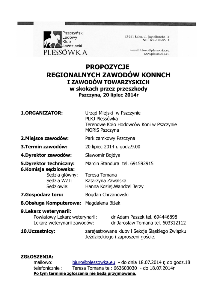 PROPOZYCJE REGIONALNYCH ZAWODÓW KONNCH I ZAWODÓW TOWARZYSKICH w skokach przez przeszkody Pszczyna, 20 lipiec 2014r 1.ORGANIZATOR: Urząd Miejski w Pszczynie PLKJ Plessówka Terenowe Koło Hodowców Koni w Pszczynie MORiS Pszczyna 2.Miejsce zawodów: Park zamkowy Pszczyna 3.Termin zawodów: 20 lipiec 2014 r. godz.9.00 4.Dyrektor zawodów: Sławomir Bojdys 5.Dyrektor techniczny: 6.Komisja sędziowska: Sędzia główny: Sędzia WZJ: Sędziowie: Marcin Standura tel. 691592915 7.Gospodarz toru: Bogdan Chrzanowski Teresa Tomana Katarzyna Zawalska Hanna Koziej,Wandzel Jerzy 8.Obsługa Komputerowa: Magdalena Biżek 9.Lekarz weterynarii: Powiatowy Lekarz weterynarii: Lekarz weterynarii zawodów: 10.Uczestnicy: ZGŁOSZENIA: mailowo: telefonicznie : dr Adam Paszek tel. 694446898 dr Jarosław Tomana tel. 603312112 zarejestrowane kluby i Sekcje Śląskiego Związku Jeździeckiego i zaproszeni goście. [email protected] - do dnia 18.07.2014 r, do godz.18 Teresa Tomana tel: 663603030 - do 18.07.2014r Po tym terminie zgłoszenia nie będą przyjmowane. PROGRAM ZAWODÓW: Niedziela 20 lipiec 2014r. godz.9.00 ZAWODY TOWARZYSKIE : T1. Konkurs Kl. LL - zwykły art.238.2.1 amatorów dla członków Terenowego Koła Hodowców Koni w Pszczynie (hodowca należący do TKHK w Pszczynie, opłacone składki) T2.Konkurs Kl. LL -trafienie w normę czasu ,wys. do 80 cm ZAWODY REGIONALNE: -Konkurs nr1.Kl. LL zwykły,art.238.2.1 -Konkurs nr1 Kl. L zwykły,art.238.2.1 -Konkurs nr 2 Kl. P o wzrastającym stopniu trudności z jokerem -Konkurs nr 3 Kl. N dokładności z rozgrywką art.238.1.2 o puchar Burmistrza Pszczyny WARUNKI TECHNICZNE: Plac konkursowy o wymiarach 50mx80m podłoże trawiaste Rozprężalnia o wymiarach 60mx20m SPRAWY ORGANIZACYJNE: 1. Dokumenty zawodników i koni zgodnie z przepisami PZJ Amatorzy: sportowa książeczka zdrowia lub zaświadczenie od lekarza na czas zawodów, zgoda rodziców dla niepełnoletnich 2. Sprawdzanie dokumentacji w dniu zawodów tj.20 lipca 2014 r. od godz.8.00 3. Opłata organizacyjna w kwocie 75 zł za konia, płatna przelewem na konto 81 1160 2202 0000 0001 6219 8866 (potwierdzenie przelewu do wglądu) 3. Miejsce parkowania: Park, bezpośrednio przy miejscu zawodów. Wjazd od ulicy Żorskiej 4. Organizator zastrzega sobie prawo do zmiany programu z zachowaniem klas konkursów. 5. Dokonywanie zmian na listach startowych po ich wywieszeniu za zgodą sędziego głównego 10 zł od każdego przepisanego lub dopisanego konia lub zawodnika 7. Na rozprężalni może się znajdować 6 koni 8.Organizator zastrzega sobie prawo ograniczenia ilości startów do 2 dla konia, w przypadku zgłoszenia zbyt dużej liczby startujących. 9.Organizator nie ponosi żadnej odpowiedzialności w razie wypadków i zachorowań trenera,luzaków,koni ,jak również w przypadku kradzieży i innych zdarzeń losowych. Zawodnicy i właściciele odpowiadają osobiście za zniszczenia w stosunku do osób trzecich ,spowodowanych przez nich samych,ich pracowników i ich konie DOKUMENTACJA I PRZEPISY WETERYNARYJNE: Konie muszą posiadać paszporty hodowlane z aktualnymi szczepieniami. Szczepienia ochronne przeciwko grypie .Obowiązuje następujący schemat szczepień: a/ szczepienie podstawowe: - pierwsze szczepienie -w dniu rozpoczęcia szczepień - drugie szczepienie -nie wcześniej niż w dniu 21-go dnia i nie później niż 92 dnia od pierwszego szczepienia. b/szczepienie przypominające: - co 6 miesięcy od ostatniego szczepienia/jest dopuszczalny21 dniowy okres karencji/ - żadne szczepienie przypominające nie może się odbyć później niż na 7 dni przed przybyciem na zawody. NAGRODY: - Flot's 25 % koni startujących w każdym konkursie -W konkursie T1 : nagrody rzeczowe za I,II,III miejsce - W konkursie T2 flots 25% - w konkursie Regionalnym Nr 1 klasy LL: nagrody rzeczowe za I,II,III miejsce - w konkursie Regionalnym Nr 2 klasy L: nagrody rzeczowe za I,II,III miejsce - w konkursie Regionalnym Nr 3 klasy P: I miejsce : puchar +500 zł II miejsce : puchar +300 zł III miejsce: puchar +150 zł - w konkursie Regionalnym nr 4 klasy N I miejsce II miejsce III miejsce puchar + 1000 zł puchar + 750 zł puchar + 500 zł Propozycje zatwierdzone przez Śląski Związek Jeździecki w Rybniku w dniu 20.06.2014r KODEKS POSTĘPOWANIA Z KONIEM: 1.We wszystkich dziedzinach sportu jeździeckiego koń jest najważniejszy. 2.Dobro konia powinno stać ponad interesami: hodowców, jeźdźców,trenerów,właścicieli,handlarzy,organizatorów ,sponsorów,osób oficjalnych. 3.Wszelkie postępowanie i leczenie powinno zapewnić zdrowie i dobre samopoczucie koniom. 4.Wysoki standard żywienia,zdrowia,higieny i bezpieczeństwa powinien być wprowadzony i utrzymany przez cały czas. 5.Musi być zapewniony odpowiedni poziom wentylacji,żywienia,pojenia i utrzymania zdrowego środowiska w czasie transportu. 6.Należy położyć duży nacisk na podnoszenie edukacji w dziedzinie treningu i postępowania z końmi oraz promować badania w zakresie zdrowotności tych zwierząt. 7.W trosce o dobro koni,jako najważniejsze uważa się przygotowanie i umiejętności jeźdźca. 8.Wszelkie metody treningu i jazdy muszą brać pod uwagę konie, jako stworzenia żywe i nie mogą nieść ze sobą technik uważanych przez PZJ za niedozwolone. 9.Narodowe i międzynarodowe przepisy i zalecenia w jeździectwie dotyczące tej problematyki powinny być stosowane nie podczas zawodów ,ale i podczas treningów. Przepisy Jeździeckie i zalecenia muszą być stale uaktualniane dla zapewnienia "dobra koni". Wszyscy zaangażowani w sport jeździecki są zobowiązani do przestrzegania powyższych zasad KODEKSU POSTĘPOWANIA Z KOŃMI.
