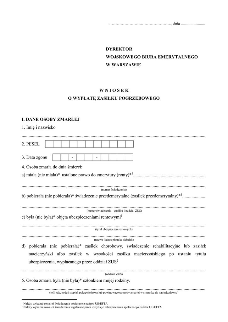 …………………….……………………, dnia ......................... DYREKTOR WOJSKOWEGO BIURA EMERYTALNEGO W WARSZAWIE WNIOSEK O WYPŁATĘ ZASIŁKU POGRZEBOWEGO I. DANE OSOBY ZMARŁEJ 1. Imię i nazwisko ................................................................................................................................................................ 2. PESEL 3. Data zgonu - - 4. Osoba zmarła do dnia śmierci: a) miała (nie miała)* ustalone prawo do emerytury (renty)*1............................................................... ................................................................................................................................................................ (numer świadczenia) b) pobierała (nie pobierała)* świadczenie przedemerytalne (zasiłek przedemerytalny)*1.................... ................................................................................................................................................................ (numer świadczenia – zasiłku i oddział ZUS) c) była (nie była)* objęta ubezpieczeniami rentowymi1 ................................................................................................................................................................ (tytuł ubezpieczeń rentowych) ................................................................................................................................................................ (nazwa i adres płatnika składek) d) pobierała (nie pobierała)* zasiłek chorobowy, świadczenie rehabilitacyjne lub zasiłek macierzyński albo zasiłek w wysokości zasiłku macierzyńskiego po ustaniu tytułu ubezpieczenia, wypłacanego przez oddział ZUS2 ................................................................................................................................................................ (oddział ZUS) 5. Osoba zmarła była (nie była)* członkiem mojej rodziny. ................................................................................................................................................................ (jeśli tak, podać stopień pokrewieństwa lub powinowactwa osoby zmarłej w stosunku do wnioskodawcy) 1 2 Należy wykazać również świadczenia pobierane z państw UE/EFTA Należy wykazać również świadczenia wypłacane przez instytucje zabezpieczenia społecznego państw UE/EFTA II. DANE WNIOSKODAWCY 1. Imię i nazwisko (nazwa podmiotu składającego wniosek) ................................................................................................................................................................ ................................................................................................................................................................ 2. Adres ................................................................................................................................................. ................................................................................................................................................................ 3. Telefon kontaktowy .......................................................................................................................... 4. PESEL 5. REGON podmiotu* III. OŚWIADCZAM, ŻE: 1. Pokryłem(am) koszty pogrzebu: - w całości* - w części*, pozostałe koszty zostały pokryte przez: ................................................................................................................................................................ ................................................................................................................................................................ (nazwisko i imię lub nazwa instytucji)* ................................................................................................................................................................ ............................................................................................................................................................... (adres) 2. Zasiłek pogrzebowy nie został/został* wypłacony z innego tytułu. 3. Pogrzeb odbył się w dniu - - UWAGA! Jeden z poniższych punktów należy wypełnić, jeżeli osoba zmarła nie miała ustalonego prawa do emerytury lub renty i nie była objęta ubezpieczeniami rentowymi. 1. Mam (nie mam)* ustalone prawo do emerytury (renty)* ................................................................................................................................................................ ................................................................................................................................................................ (numer świadczenia i Oddział ZUS) 2. Pobieram (nie pobieram)* świadczenie przedemerytalne (zasiłek przedemerytalny)* ................................................................................................................................................................ ............................................................................................................................................................... (numer świadczenia – zasiłku i Oddział ZUS) 3. Jestem (nie jestem)* objęty(a) ubezpieczeniami rentowymi ................................................................................................................................................................ (tytuł ubezpieczeń rentowych) ................................................................................................................................................................ ............................................................................................................................................................... (nazwa i adres płatnika składek) IV. SPOSÓB REALIZACJI 1. Przysługujący zasiłek pogrzebowy proszę przekazać na: a) rachunek