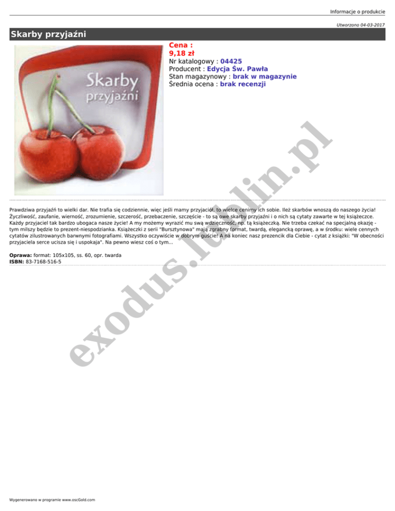 Informacje o produkcie Utworzono 04-03-2017 Skarby przyjaźni Cena : 9,18 zł bl in .p l Nr katalogowy : 04425 Producent : Edycja Św. Pawła Stan magazynowy : brak w magazynie Średnia ocena : brak recenzji ex od us Oprawa: format: 105x105, ss. 60, opr. twarda ISBN: 83-7168-516-5 .lu Prawdziwa przyjaźń to wielki dar. Nie trafia się codziennie, więc jeśli mamy przyjaciół, to wielce cenimy ich sobie. Ileż skarbów wnoszą do naszego życia! Życzliwość, zaufanie, wierność, zrozumienie, szczerość, przebaczenie, szczęście - to są owe skarby przyjaźni i o nich są cytaty zawarte w tej książeczce. Każdy przyjaciel tak bardzo ubogaca nasze życie! A my możemy wyrazić mu swą wdzięczność, np. tą książeczką. Nie trzeba czekać na specjalną okazję tym milszy będzie to prezent-niespodzianka. Książeczki z serii "Bursztynowa" mają zgrabny format, twardą, elegancką oprawę, a w środku: wiele cennych cytatów zilustrowanych barwnymi fotografiami. Wszystko oczywiście w dobrym guście! A na koniec nasz prezencik dla Ciebie - cytat z książki: "W obecności przyjaciela serce ucisza się i uspokaja". Na pewno wiesz coś o tym... Wygenerowano w programie www.oscGold.com