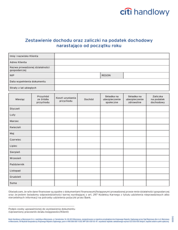 Zestawienie dochodu oraz zaliczki na podatek dochodowy narastająco od początku roku Imię i nazwisko Klienta Adres Klienta Nazwa prowadzonej działalności gospodarczej NIP REGON Data wypełnienia dokumentu Straty z lat ubiegłych Miesiąc Przychód ze źródła przychodu Koszt uzyskania przychodu Dochód Składka na ubezpieczenie społeczne Składka na ubezpieczenie zdrowotne Zaliczka na podatek dochodowy Styczeń Luty Marzec Kwiecień Maj Czerwiec Lipiec Sierpień Wrzesień Październik Listopad Grudzień Suma Oświadczam, że w/w dane finansowe są zgodne z dokumentami finansowymi/księgowymi prowadzonej przeze mnie działalności gospodarczej oraz że jestem świadomy odpowiedzialności karnej wynikającej z art. 297 Kodeksu Karnego z tytułu udzielenia nieprawdziwych albo nierzetelnych informacji na potrzeby udzielenia pożyczki przez Bank. _________________________________________________ Bank Handlowy w Warszawie S.A. z siedzibą w Warszawie, ul. Senatorska 16, 00-923 Warszawa, zarejestrowany w rejestrze przedsiębiorców Krajowego Rejestru Sądowego przez Sąd Rejonowy dla m.st. Warszawy w Warszawie, XII Wydział Gospodarczy Krajowego Rejestru Sądowego, pod nr. KRS 000 000 1538; NIP 526-030-02-91; wysokość kapitału zakładowego wynosi 522.638.400 złotych, kapitał został w pełni opłacony. 09/2012 Podpis osoby upoważnionej do wystawienia dokumentu (Uprawniony pracownik działu księgowości/Klient)