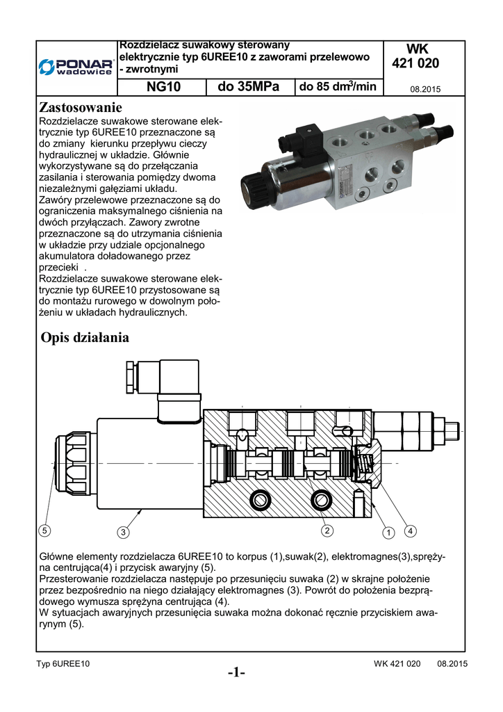 Rozdzielacz suwakowy sterowany elektrycznie typ 6UREE10 z zaworami przelewowo - zwrotnymi NG10 do 35MPa WK 421 020 do 85 dm3/min 08.2015 Zastosowanie Rozdzielacze suwakowe sterowane elektrycznie typ 6UREE10 przeznaczone są do zmiany kierunku przepływu cieczy hydraulicznej w układzie. Głównie wykorzystywane są do przełączania zasilania i sterowania pomiędzy dwoma niezależnymi gałęziami układu. Zawóry przelewowe przeznaczone są do ograniczenia maksymalnego ciśnienia na dwóch przyłączach. Zawory zwrotne przeznaczone są do utrzymania ciśnienia w układzie przy udziale opcjonalnego akumulatora doładowanego przez przecieki . Rozdzielacze suwakowe sterowane elektrycznie typ 6UREE10 przystosowane są do montażu rurowego w dowolnym położeniu w układach hydraulicznych. Opis działania 5 2 3 1 4 Główne elementy rozdzielacza 6UREE10 to korpus (1),suwak(2), elektromagnes(3),sprężyna centrująca(4) i przycisk awaryjny (5). Przesterowanie rozdzielacza następuje po przesunięciu suwaka (2) w skrajne położenie przez bezpośrednio na niego działający elektromagnes (3). Powrót do położenia bezprądowego wymusza sprężyna centrująca (4). W sytuacjach awaryjnych przesunięcia suwaka można dokonać ręcznie przyciskiem awarynym (5). Typ 6UREE10 -1- WK 421 020 08.2015 DANE TECHNICZNE Ciecz hydrauliczna olej mineralny Wymagana filtracja do 16 µm Zalecana filtracja do 10 µm Lepkość nominalna cieczy o 37 mm 2 /s w temperaturze 55 C Zakres temperatury otoczenia Max ciśnienie pracy Czas przesterowania o - 30o C do +50 C 21 MPa bez odprowadzenia przecieków 35 MPa z odprowadzeniem przecieków załączenie wyłączenie Max liczba przesterowań 15000 zał./h Masa max 7 kg Napięcie nominalne zasilania elektromagnesu Tolerancja napięcia zasilania DC DC ±10% Stopień ochrony Pobór mocy (prąd stały) IP 65 45 W do 60 ms do 40 ms 12V 24V max 150 o C Temperatura cewki elektromagnesu WYMAGANIA MONTAŻU I EKSPLOATACJI 1. Rozdzielacz sterowany elektrycznie należy użytkować tylko w pełni sprawny i prawidłowo przyłączony do instalacji elektrycznej. Przyłączanie lub odłączanie od instalacji elektrycznej musi być wykonywane przez wykwalifikowany personel. 2. Łączówka uziemiająca ( ) musi być połączona z przewodem ochronnym (PE ) w instalacji zasilającej zgodnie z odpowiednimi przepisami. 3. Zabrania się eksploatacji rozdzielacza jeżeli nie jest zapewniona szczelność i odpowiedni zacisk kabla zasilającego w dławnicy wtyczki. 4. Zabrania się użytkowania rozdzielacza, jeżeli wtyczka nie dolega dokładnie do gniazda elektromagnesu i nie jest zabezpieczona poprzez dokręcenie do oporu wkręta mocującego. 5. Ze względu na nagrzewanie się cewki elektromagnesu do wysokiej temperatury rozdzielacze powinny być umiejscowione tak,aby wyeliminować możliwość przypadkowego kontaktu z nim podczas eksploatacji lub należy przewidzieć odpowiednie osłony (zgodnie z wymaganiami norm europejskich: PN - EN ISO 13732-1 i PN - EN 982. SCHEMAT Odprowadzenie przecieków WK 421 020 08.2015 -2- Typ 6UREE10 37 WYMIARY GABARYTOWE I PRZYŁĄCZENIOWE typ 6UREE10.../R-P-Z... 13,5 G w 1/ 2 g IS O 7g 11 n 79 iaz -1 d 75 54 75 1 2 6,5 40,5 109,5 37 81 27 67,5 93 a gł. max 67 14 O 48 63 M8 n 8,7 116,7 Typ 6UREE10 -3- WK 421 020 08.2015 Wykres charakterystyki ∆ p(Q) dla rozdzielacza typ 6UREE10-02/R-P-Z... Charakterystyka oporów przepływu 16 P2 -> 4 >C 1>C P1 2 ->P C3 > 2 ->C P1 1 ->C P1 2 ->C P1 14 12 ∆p [bar] 10 8 6 4 2 0 10 20 30 40 50 60 70 80 Q [dm3/min] Sposób zamawiania 6UREE10-02/R -P-Z-G12NZ4 /.../.../ * Nr serii 02 = 02 (01-10) niezmienne wym. przył.i zabudowy Przyłącza gwint rurowy G1/2" = R Zabudowany zawór przelewowy P = na linii C1 i C2 Zabudowany zawór zwrotny Z = na linii C3 i C4 Napięcie zasilania elektromagnesu z przyciskiem awaryjnego przesterowania 12V DC = G12N 24V DC = G24N Wtyczka elektromagnesu wtyczka Z4 = Z4 wtyczka Z4L(z lampką) = Z4L Rodzaj uszczelnienia NBR(dla cieczy na bazie olejów mineralnych) =bez oznaczenia FPM(dla cieczy na bazie estrów fosforanowych) =V Nastawa zaworu nr 1 w barach jeżeli wymagane (zawory przelewowe zabezpieczane zaślepkami) Nastawa zaworu nr 2 w barach jeżeli wymagane (zawory przelewowe zabezpieczane zaślepkami) Ewentualne dodatkowe wymagania określone w sposób opisowy (do uzgodnienia z producentem) WK 421 020 Typ 6UREE10 08.2015 -4- Przykład zastosowania w układzie hydraulicznym PONAR Wadowice S.A. ul. Wojska Polskiego 29 34-100 Wadowice tel. +48 33 823 44 41 - 45 fax.+48 33 823 41 69 www.ponar-wadowice.pl WK 421 020 08.2015 Typ 6UREE10 -5-