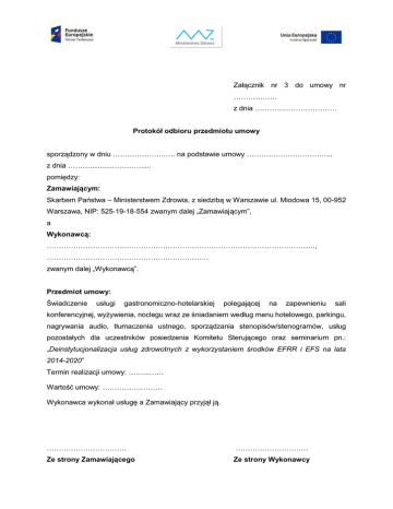 Załącznik nr 3 do umowy nr ……………… z dnia ………….………………… Protokół odbioru przedmiotu umowy sporządzony w dniu ………………….…. na podstawie umowy ……………………………... z dnia ………...........…………..... pomiędzy: Zamawiającym: Skarbem Państwa – Ministerstwem Zdrowia, z siedzibą w Warszawie ul. Miodowa 15, 00-952 Warszawa, NIP: 525-19-18-554 zwanym dalej „Zamawiającym”, a Wykonawcą: ……………………………………………………………………………………………......., …………………………………………………………. zwanym dalej „Wykonawcą”. Przedmiot umowy: Świadczenie usługi gastronomiczno-hotelarskiej polegającej na zapewnieniu sali konferencyjnej, wyżywienia, noclegu wraz ze śniadaniem według menu hotelowego, parkingu, nagrywania audio, tłumaczenia ustnego, sporządzania stenopisów/stenogramów, usług pozostałych dla uczestników posiedzenia Komitetu Sterującego oraz seminarium pn.: „Deinstytucjonalizacja usług zdrowotnych z wykorzystaniem środków EFRR i EFS na lata 2014-2020” Termin realizacji umowy: ……...…… Wartość umowy: …………….……… Wykonawca wykonał usługę a Zamawiający przyjął ją. …………………………… ………………………… Ze strony Zamawiającego Ze strony Wykonawcy Zamawiający zgłosił następujące zastrzeżenia i uwagi do wykonanej pracy. …………………………………………………………………………………………………………… …………………………………………………………………………………………………………… …………………………………………………………………………… Uwagi Wykonawcy. …………………………………………………………………………………………………………… …………………………………………………………………………………………………………… …………………………………………………………………………………………………………… …………………………………………………………………………………………………………… …………………………………………………………………………………………………………… …………………………………………………………………………………………………………… ………………………………… …………………………… ………………………… Ze strony Zamawiającego Ze strony Wykonawcy