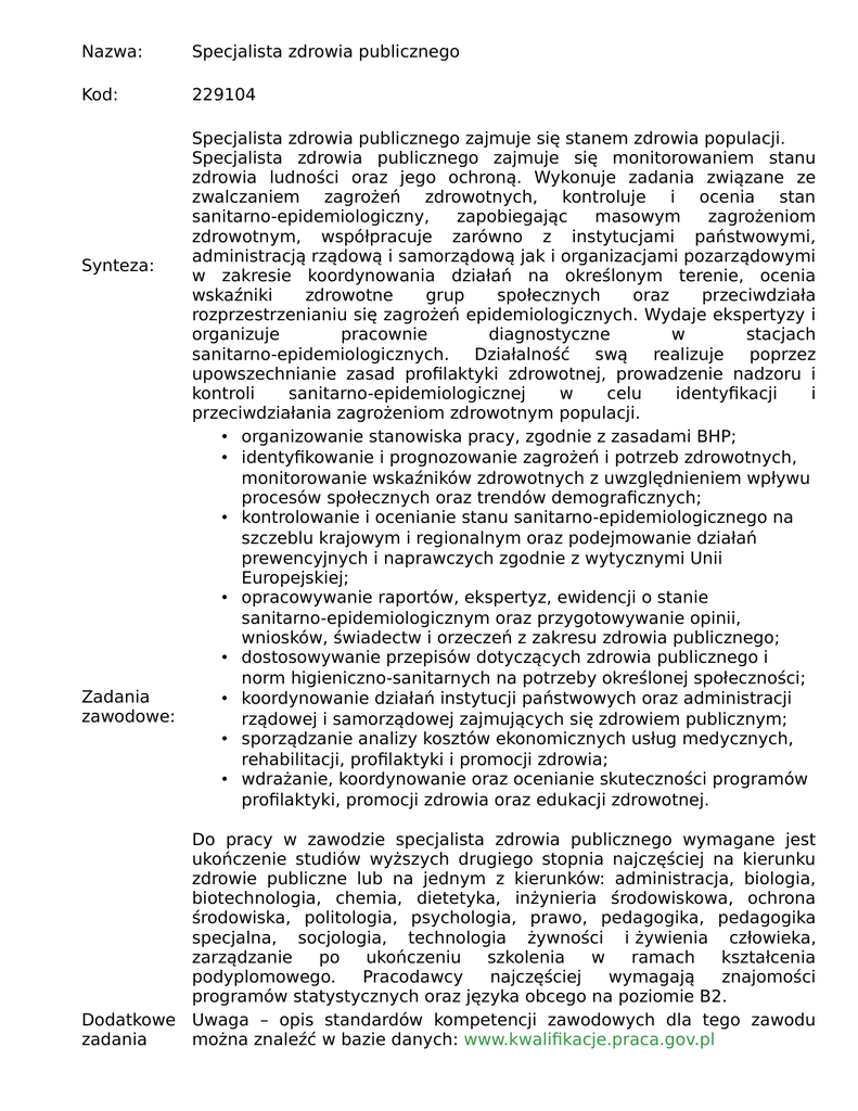 Nazwa: Specjalista zdrowia publicznego Kod: 229104 Specjalista zdrowia publicznego zajmuje się stanem zdrowia populacji. Specjalista zdrowia publicznego zajmuje się monitorowaniem stanu zdrowia ludności oraz jego ochroną. Wykonuje zadania związane ze zwalczaniem zagrożeń zdrowotnych, kontroluje i ocenia stan sanitarno-epidemiologiczny, zapobiegając masowym zagrożeniom zdrowotnym, współpracuje zarówno z instytucjami państwowymi, administracją rządową i samorządową jak i organizacjami pozarządowymi Synteza: w zakresie koordynowania działań na określonym terenie, ocenia wskaźniki zdrowotne grup społecznych oraz przeciwdziała rozprzestrzenianiu się zagrożeń epidemiologicznych. Wydaje ekspertyzy i organizuje pracownie diagnostyczne w stacjach sanitarno-epidemiologicznych. Działalność swą realizuje poprzez upowszechnianie zasad profilaktyki zdrowotnej, prowadzenie nadzoru i kontroli sanitarno-epidemiologicznej w celu identyfikacji i przeciwdziałania zagrożeniom zdrowotnym populacji. • organizowanie stanowiska pracy, zgodnie z zasadami BHP; • identyfikowanie i prognozowanie zagrożeń i potrzeb zdrowotnych, monitorowanie wskaźników zdrowotnych z uwzględnieniem wpływu procesów społecznych oraz trendów demograficznych; • kontrolowanie i ocenianie stanu sanitarno-epidemiologicznego na szczeblu krajowym i regionalnym oraz podejmowanie działań prewencyjnych i naprawczych zgodnie z wytycznymi Unii Europejskiej; • opracowywanie raportów, ekspertyz, ewidencji o stanie sanitarno-epidemiologicznym oraz przygotowywanie opinii, wniosków, świadectw i orzeczeń z zakresu zdrowia publicznego; • dostosowywanie przepisów dotyczących zdrowia publicznego i norm higieniczno-sanitarnych na potrzeby określonej społeczności; Zadania • koordynowanie działań instytucji państwowych oraz administracji zawodowe: rządowej i samorządowej zajmujących się zdrowiem publicznym; • sporządzanie analizy kosztów ekonomicznych usług medycznych, rehabilitacji, profilaktyki i promocji zdrowia; • wdrażanie, koordynowanie oraz ocenianie skuteczności programów profilaktyki, promocji zdrowia oraz edukacji zdrowotnej. Do pracy w zawodzie specjalista zdrowia publicznego wymagane jest ukończenie studiów wyższych drugiego stopnia najczęściej na kierunku zdrowie publiczne lub na jednym z kierunków: administracja, biologia, biotechnologia, chemia, dietetyka, inżynieria środowiskowa, ochrona środowiska, politologia, psychologia, prawo, pedagogika, pedagogika specjalna, socjologia, technologia żywności i żywienia człowieka, zarządzanie po ukończeniu szkolenia w ramach kształcenia podyplomowego. Pracodawcy najczęściej wymagają znajomości programów statystycznych oraz języka obcego na poziomie B2. Dodatkowe Uwaga – opis standardów kompetencji zawodowych dla tego zawodu zadania można znaleźć w bazie danych: www.kwalifikacje.praca.gov.pl zawodowe: