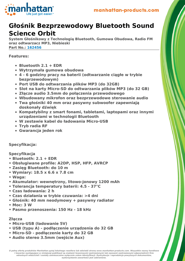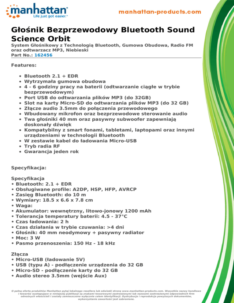 Głośnik Bezprzewodowy Bluetooth Sound Science Orbit System Głośnikowy z Technologią Bluetooth, Gumowa Obudowa, Radio FM oraz odtwarzacz MP3, Niebieski Part No.: 162456 Features: Bluetooth 2.1 + EDR Wytrzymała gumowa obudowa 4 - 6 godziny pracy na baterii (odtwarzanie ciągłe w trybie bezprzewodowym) Port USB do odtwarzania plików MP3 (do 32GB) Slot na karty Micro-SD do odtwarzania plików MP3 (do 32 GB) Złącze audio 3.5mm do połączenia przewodowego Wbudowany mikrofon oraz bezprzewodowe sterowanie audio Twa głośniki 40 mm oraz pasywny subwoofer zapewniają doskonały dźwięk Kompatybilny z smart fonami, tabletami, laptopami oraz innymi urządzeniami w technologii Bluetooth W zestawie kabel do ładowania Micro-USB Tryb radia RF Gwarancja jeden rok Specyfikacja: Specyfikacja • Bluetooth: 2.1 + EDR • Obsługiwane profile: A2DP, HSP, HFP, AVRCP • Zasięg Bluetooth: do 10 m • Wymiary: 18.5 x 6.6 x 7.8 cm • Waga: • Akumulator: wewnętrzny, litowo-jonowy 1200 mAh • Tolerancja temperatury baterii: 4.5 - 37°C • Czas ładowania: 2 h • Czas działania w trybie czuwania: >4 dni • Głośnik: 40 mm neodymowy + pasywny radiator • Moc: 3 W • Pasmo przenoszenia: 150 Hz - 18 kHz Złącza • Micro-USB (ładowanie 5V) • USB (typu A) - podłączenie urządzenia do 32 GB • Micro-SD - podłączenie karty do 32 GB • Audio stereo 3.5mm (wejście Aux) O pełną ofertę produktów Manhattan pytaj lokalnego resellera lub odwiedź stronę www.manhattan-products.com. Wszystkie nazwy handlowe i towarów występujące w niniejszej publikacji są znakami towarowymi zastrzeżonymi lub nazwami zastrzeżonymi odpowiednich firm odnośnych właścicieli i zostały zamieszczone wyłącznie celem identyfikacji. Dystrybucja i reprodukcja powyższych dokumentów, wykorzystanie zawartości jest zabronione. Certyfikaty • Bluetooth • FCC • CE • RoHS Zawartość opakowania • Głośnik Bezprzewodowy Bluetooth Sound Science Orbit • Kabel USB typu A na micro-USB do ładowania • Instrukcja użytkownika O pełną ofertę produktów Manhattan pytaj lokalnego resellera lub odwiedź stronę www.manhattan-products.com. Wszystkie nazwy handlowe i towarów występujące w niniejszej publikacji są znakami towarowymi zastrzeżonymi lub nazwami zastrzeżonymi odpowiednich firm odnośnych właścicieli i zostały zamieszczone wyłącznie celem identyfikacji. Dystrybucja i reprodukcja powyższych dokumentów, wykorzystanie zawartości jest zabronione. O pełną ofertę produktów Manhattan pytaj lokalnego resellera lub odwiedź stronę www.manhattan-products.com. Wszystkie nazwy handlowe i towarów występujące w niniejszej publikacji są znakami towarowymi zastrzeżonymi lub nazwami zastrzeżonymi odpowiednich firm odnośnych właścicieli i zostały zamieszczone wyłącznie celem identyfikacji. Dystrybucja i reprodukcja powyższych dokumentów, wykorzystanie zawartości jest zabronione.