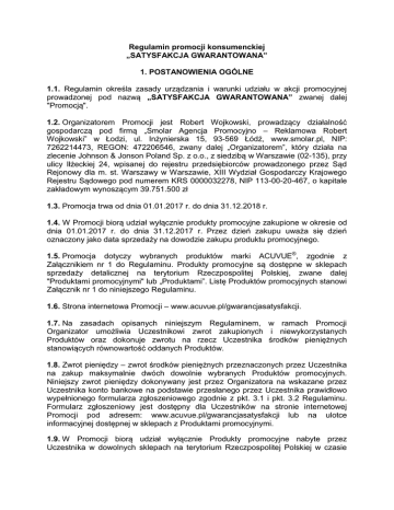 Regulamin promocji konsumenckiej „SATYSFAKCJA GWARANTOWANA” 1. POSTANOWIENIA OGÓLNE 1.1. Regulamin określa zasady urządzania i warunki udziału w akcji promocyjnej prowadzonej pod nazwą „SATYSFAKCJA GWARANTOWANA” zwanej dalej "Promocją". 1.2. Organizatorem Promocji jest Robert Wojkowski, prowadzący działalność gospodarczą pod firmą „Smolar Agencja Promocyjno – Reklamowa Robert Wojkowski” w Łodzi, ul. Inżynierska 15, 93-569 Łódź, www.smolar.pl, NIP: 7262214473, REGON: 472206546, zwany dalej „Organizatorem”, który działa na zlecenie Johnson & Jonson Poland Sp. z o.o., z siedzibą w Warszawie (02-135), przy ulicy Iłżeckiej 24, wpisanej do rejestru przedsiębiorców prowadzonego przez Sąd Rejonowy dla m. st. Warszawy w Warszawie, XIII Wydział Gospodarczy Krajowego Rejestru Sądowego pod numerem KRS 0000032278, NIP 113-00-20-467, o kapitale zakładowym wynoszącym 39.751.500 zł 1.3. Promocja trwa od dnia 01.01.2017 r. do dnia 31.12.2018 r. 1.4. W Promocji biorą udział wyłącznie produkty promocyjne zakupione w okresie od dnia 01.01.2017 r. do dnia 31.12.2017 r. Przez dzień zakupu uważa się dzień oznaczony jako data sprzedaży na dowodzie zakupu produktu promocyjnego. 1.5. Promocja dotyczy wybranych produktów marki ACUVUE®, zgodnie z Załącznikiem nr 1 do Regulaminu. Produkty promocyjne są dostępne w sklepach sprzedaży detalicznej na terytorium Rzeczpospolitej Polskiej, zwane dalej "Produktami promocyjnymi" lub „Produktami”. Listę Produktów promocyjnych stanowi Załącznik nr 1 do niniejszego Regulaminu. 1.6. Strona internetowa Promocji – www.acuvue.pl/gwarancjasatysfakcji. 1.7. Na zasadach opisanych niniejszym Regulaminem, w ramach Promocji Organizator umożliwia Uczestnikowi zwrot zakupionych i niewykorzystanych Produktów oraz dokonuje zwrotu na rzecz Uczestnika środków pieniężnych stanowiących równowartość oddanych Produktów. 1.8. Zwrot pieniędzy – zwrot środków pieniężnych przeznaczonych przez Uczestnika na zakup maksymalnie dwóch dowolnie wybranych Produktów promocyjnych. Niniejszy zwrot pieniędzy dokonywany jest przez Organizatora na wskazane przez Uczestnika konto bankowe na podstawie przesłanego przez Uczestnika prawidłowo wypełnionego formularza zgłoszeniowego zgodnie z pkt. 3.1 i pkt. 3.2 Regulaminu. Formularz zgłoszeniowy jest dostępny dla Uczestników na stronie internetowej Promocji pod adresem: www.acuvue.pl/gwarancjasatysfakcji lub na ulotce informacyjnej dostępnej w sklepach z Produktami promocyjnymi. 1.9. W Promocji biorą udział wyłącznie Produkty promocyjne nabyte przez Uczestnika w dowolnych sklepach na terytorium Rzeczpospolitej Polskiej w czasie trwania Promocji, zgodnie z pkt. 1.4 Regulaminu. W Promocji nie będą brały udziału produkty, których wprowadzenie do obrotu narusza prawo. 1.10. Promocją nie są objęte zwroty produktów dokonywane w ramach reklamacji medycznej lub reklamacji jakościowej. Zasady i warunki zwrotu produktów w ramach reklamacji medycznej lub niepożądanych reklamacji jakościowej są dostępne u Johnson & Johnson Poland Sp. z o.o. z siedzibą w Warszawie. 2. WARUNKI UCZESTNICTWA 2.1. Z zastrzeżeniem pkt. 2.3, w Promocji może wziąć udział każda osoba fizyczna, która ma ukończone 18 lat, posiada pełną zdolność do czynności prawnych, konsument w rozumieniu art. 22 [1] Kodeksu cywilnego, zamieszkała na terytorium Rzeczpospolitej Polskiej, zwana dalej Uczestnikiem. 2.2. Osoba zgłaszająca udział w Promocji może uczestniczyć w Promocji wyłącznie w imieniu własnym i na własną rzecz oraz musi dokonać zakupu Produktu promocyjnego i posiadać oryginał dowodu zakupu. 2.3. Z Promocji wyłączone są podmioty gospodarcze oraz osoby fizyczne prowadzące działalność gospodarczą nabywające Produkt promocyjny w ramach prowadzonej działalności. 2.4. Uczestnik biorący udział w promocji potwierdza, że wyraża zgodę na zasady promocji opisane w niniejszym regulaminie. 3. SZCZEGÓŁOWE ZASADY PROMOCJI 3.1. W celu wzięcia udziału w Promocji Uczestnik musi spełnić łącznie następujące warunki: kupić w czasie trwania Promocji dowolnie wybrany Produkt promocyjny, w dowolnym sklepie prowadzącym sprzedaż Produktów promocyjnych, zgodnie z pkt. 1.5 Regulaminu, dokonać zapłaty za Produkt promocyjny, koniecznie zachować oryginał dowodu zakupu Produktu promocyjnego (w przypadku gdy dowód zakupu potwierdza dokonanie zakupu wielu Produktów promocyjnych, Uczestnik jest uprawniony do dokonania zgłoszenia maksymalnie dwóch dowolnie wybranych Produktów promocyjnych), dokonać prawidłowego zgłoszenia do Promocji, w terminie od 01.01.2017 r. do 31.12.2018 (decyduje data wpływu zgłoszenia do Organizatora) zgodnie z warunkami wskazanymi w pkt. 3.2 i pkt. 3.4 Regulaminu. 3.2. Zgłoszenie, pod rygorem odmowy zwrotu pieniędzy, powinno zawierać łącznie następujące elementy i informacje: a) w celu uzyskania zwrotu pieniędzy za zakup następujących niewykorzystanych Produktów promocyjnych: 1-DAY ACUVUE® TruEye® (30szt.), 1-DAY ACUVUE® MOIST (30szt.), 1-DAY ACUVUE® MOIST for ASTIGMATISM (30szt.), 1-DAY ACUVUE® MOIST MULTIFOCAL (30szt.), 1-DAY ACUVUE® DEFINE® (30szt.), ACUVUE OASYS® with HYDRACLEAR® PLUS (6szt.), ACUVUE OASYS® for ASTIGMATISM (6szt.), ACUVUE OASYS® 1-Day with HydraLuxeTM (30szt.), każdy Uczestnik powinien przesłać na adres biura Organizatora (Smolar Agencja Promocyjno – Reklamowa., ul. Inżynierska 15, 93-569 Łódź): prawidłowo wypełniony formularz dostępny na stronie internetowej www.acuvue.pl/gwarancjasatysfakcji bądź znajdujący się na ulotce informacyjnej dostępnej w sklepach z Produktami promocyjnymi, dowód zakupu potwierdzający zakup zwracanych Produktów (paragon, rachunek lub faktura VAT wystawiona na osobę fizyczną nieprowadzącą działalności gospodarczej) zawierający: datę zakupu, cenę, nazwę sklepu oraz nazwę Produktu promocyjnego, opakowania wraz z niewykorzystanymi P