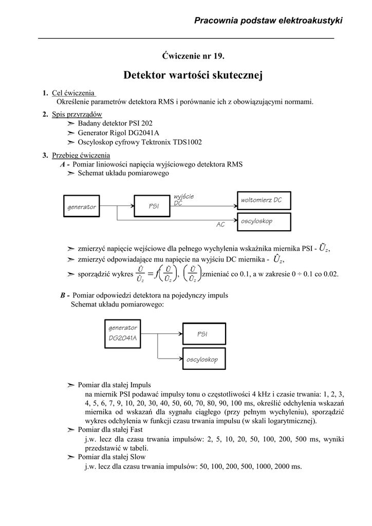 Pracownia podstaw elektroakustyki Ćwiczenie nr 19. Detektor wartości skutecznej 1. Cel ćwiczenia Określenie parametrów detektora RMS i porównanie ich z obowiązującymi normami. 2. Spis przyrządów ˆ Badany detektor PSI 202 ˆ Generator Rigol DG2041A ˆ Oscyloskop cyfrowy Tektronix TDS1002 3. Przebieg ćwiczenia A - Pomiar liniowości napięcia wyjściowego detektora RMS ˆ Schemat układu pomiarowego PSI generator wyjœcie DC woltomierz DC AC oscyloskop ˆ zmierzyć napięcie wejściowe dla pełnego wychylenia wskaźnika miernika PSI - Ũ z , ˆ zmierzyć odpowiadające mu napięcie na wyjściu DC miernika - Ûz , ˆ sporządzić wykres Û Û z =f Ũ , Ũ z Ũ zmieniać co 0.1, a w zakresie 0 ÷ 0.1 co 0.02. Ũ z B - Pomiar odpowiedzi detektora na pojedynczy impuls Schemat układu pomiarowego: generator DG2041A PSI oscyloskop ˆ Pomiar dla stałej Impuls na miernik PSI podawać impulsy tonu o częstotliwości 4 kHz i czasie trwania: 1, 2, 3, 4, 5, 6, 7, 9, 10, 20, 30, 40, 50, 60, 70, 80, 90, 100 ms, określić odchylenia wskazań miernika od wskazań dla sygnału ciągłego (przy pełnym wychyleniu), sporządzić wykres odchylenia w funkcji czasu trwania impulsu (w skali logarytmicznej). ˆ Pomiar dla stałej Fast j.w. lecz dla czasu trwania impulsów: 2, 5, 10, 20, 50, 100, 200, 500 ms, wyniki przedstawić w tabeli. ˆ Pomiar dla stałej Slow j.w. lecz dla czasu trwania impulsów: 50, 100, 200, 500, 1000, 2000 ms. Pracownia podstaw elektroakustyki C - Pomiar odpowiedzi detektora na powtarzające się impulsy f = 4 kHz t = 5 ms T = 7.5, 10, 15, 20, 30, 40, 50 100, 200, 500 ms t T ˆ Wykonać pomiary dla stałej czasowej Impuls oraz Fast, sporządzić wykres odchyleń wskazań w stosunku do sygnału ciągłego w funkcji okresu powtarzania impulsów (oś czasu logarytmiczna). D - Pomiar dokładności detektora RMS dla róŜnych współczynników szczytu ˆ podać sygnał ciągły 4 kHz na wejście PSI i regulując poziom sygnału ustalić wskazanie PSI na 3 dB poniŜej pełnego zakresu (stała czasu Fast), z oscyloskopu odczytać wartość RMS podawanego sygnału - U0, ˆ na badany miernik podawać impulsy zmieniając ich czas trwania t oraz amplitudę zgodnie z tabelą (wartość RMS przebiegu odczytać z oscyloskopu): Czas t [ms] 0.25 0.5 0.75 1 1.25 2 3 5 10 25 Wartość RMS 10·U0 7.07·U0 5.77·U0 5·U0 4.47·U0 3.54·U0 2.89·U0 2.36·U0 1.58·U0 U0 f = 4 kHz T = 25 ms t T ˆ Odczytać uchyb wskazań miernika od wskazania dla sygnału ciągłego. ˆ Sporządzić wykres uchybu wskazań miernika w funkcji współczynnika szczytu: Fc = Û Ũ = 2T t .
