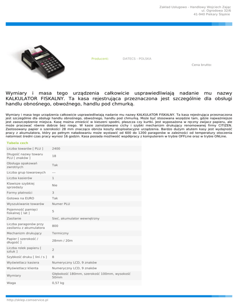Zakład Usługowo - Handlowy Wojciech Zając ul. Ogrodowa 32/6 41-940 Piekary Śląskie Producent: DATECS - POLSKA Cena brutto: Wymiary i masa tego urządzenia całkowicie usprawiedliwiają nadanie mu nazwy KALKULATOR FISKALNY. Ta kasa rejestrująca przeznaczona jest szczególnie dla obsługi handlu obnośnego, obwoźnego, handlu pod chmurką. Wymiary i masa tego urządzenia całkowicie usprawiedliwiają nadanie mu nazwy KALKULATOR FISKALNY. Ta kasa rejestrująca przeznaczona jest szczególnie dla obsługi handlu obnośnego, obwoźnego, handlu pod chmurką. Może być stosowana wszędzie tam, gdzie najważniejsze jest zaoszczędzenie miejsca. Kasę można zmieścić w kieszeni spodni, płaszcza czy kurtki. Jest wyposażona w ręczny zwijacz papieru, ale może pracować równie dobrze bez niego. W kasie zainstalowano cichy i szybki mechanizm drukujący renomowanej firmy CITIZEN. Zastosowany papier o szerokości 28 mm znacząco obniża koszty eksploatacyjne urządzenia. Bardzo dużym atutem kasy jest wydajność pracy z akumulatora, który po pełnym naładowaniu może wystawić od 600 do 1200 paragonów w zależności od temperatury otoczenia natomiast średni czas pracy wynosi 16 godzin. Kasa posiada możliwość współpracy z komputerem w trybie OFFLine oraz w trybie ONLine. Tabela cech Liczba towarów [ PLU ] 2400 Długość nazwy towaru PLU [ znaków ] 18 Obsługa opakowań zwrotnych Tak Liczba grup towarowych --- Liczba kasierów 1 Klawisze szybkiej sprzedaży Nie Formy płatności 3 Gotowa na EURO Tak Wyszukiwanie towarów Numer PLU Pojemność pamięci fiskalnej [ lat ] 5 Zasilanie Sieć, akumulator wewnętrzny Liczba paragonów przy zasilaniu z akumulatora 800 Mechanizm drukujący Termiczny Papier [ szerokość / długość ] 28mm / 20m Liczba rolek papieru [ sztuk ] 2 Szybkość druku [ lini / s ] 8 Wyświetlacz kasiera Numeryczny LCD, 9 znaków Wyświetlacz klienta Numeryczny LCD, 9 znaków Wymiary Głębokość 180mm, szerokość 100mm, wysokość 50mm Waga 0,57 kg http://sklep.comservice.pl Zakład Usługowo - Handlowy Wojciech Zając ul. Ogrodowa 32/6 41-940 Piekary Śląskie Temperatura pracy od -10 do +40 Współpraca Komputer Gwarancja [ miesiące ] 12 Gwarancja na pamięć fiskalną [ miesiące ] 60 http://sklep.comservice.pl