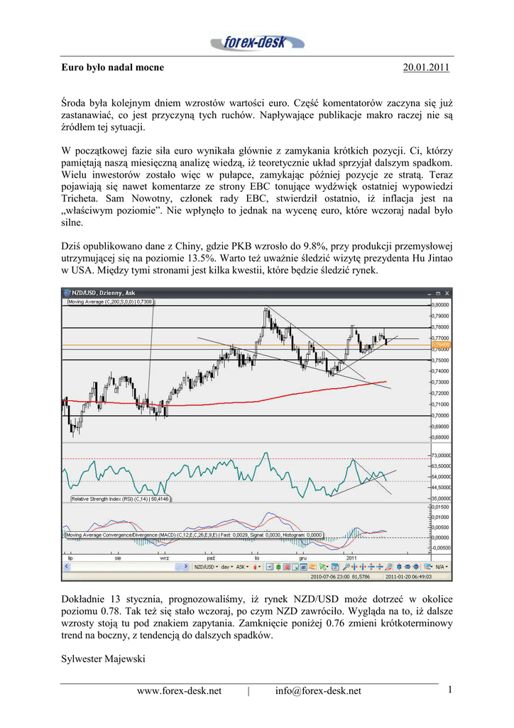 Euro było nadal mocne 20.01.2011 Środa była kolejnym dniem wzrostów wartości euro. Część komentatorów zaczyna się juŜ zastanawiać, co jest przyczyną tych ruchów. Napływające publikacje makro raczej nie są źródłem tej sytuacji. W początkowej fazie siła euro wynikała głównie z zamykania krótkich pozycji. Ci, którzy pamiętają naszą miesięczną analizę wiedzą, iŜ teoretycznie układ sprzyjał dalszym spadkom. Wielu inwestorów zostało więc w pułapce, zamykając później pozycje ze stratą. Teraz pojawiają się nawet komentarze ze strony EBC tonujące wydźwięk ostatniej wypowiedzi Tricheta. Sam Nowotny, członek rady EBC, stwierdził ostatnio, iŜ inflacja jest na „właściwym poziomie”. Nie wpłynęło to jednak na wycenę euro, które wczoraj nadal było silne. Dziś opublikowano dane z Chiny, gdzie PKB wzrosło do 9.8%, przy produkcji przemysłowej utrzymującej się na poziomie 13.5%. Warto teŜ uwaŜnie śledzić wizytę prezydenta Hu Jintao w USA. Między tymi stronami jest kilka kwestii, które będzie śledzić rynek. Dokładnie 13 stycznia, prognozowaliśmy, iŜ rynek NZD/USD moŜe dotrzeć w okolice poziomu 0.78. Tak teŜ się stało wczoraj, po czym NZD zawróciło. Wygląda na to, iŜ dalsze wzrosty stoją tu pod znakiem zapytania. Zamknięcie poniŜej 0.76 zmieni krótkoterminowy trend na boczny, z tendencją do dalszych spadków. Sylwester Majewski www.forex-desk.net | [email protected] 1