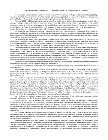 IX Gminna Sesja Ekologiczna „Ekosystemy Polski” w Zespole Szkół w Żółwinie 6 czerwca br. w Zespole Szkół w Żółwinie miała miejsce IX Gminna Sesja Ekologiczna. Patronat nad sesją objął p. Arkadiusz Kosiński, Burmistrz Gminy Brwinów. Wśród zaproszonych gości była p. kierownik Edyta Osmańska-Jakubik i p. Anna Mydlarz z Referatu Ochrony Środowiska Gminy Brwinów oraz dyrektorzy szkół. W godz. 10.00-14.30 uczniowie z czterech gminnych gimnazjów oraz Liceum Ogólnokształcącego zmagali się w różnego rodzaju konkursach, którym motywem przewodnim były Ekosystemy Polski - taki bowiem tytuł nosiła tegoroczna sesja. W czasie przygotowywania do sesji każda ze szkół wylosowała jeden z 5 głównych ekosystemów występujących w Polsce i w nawiązaniu do nich przygotowywała konkursowe prace: LO - góry, Gimnazjum nr 1 morze, Gimnazjum nr 2 - jeziora, Gimnazjum w Otrębusach – łąki, Gimnazjum w Żółwinie - lasy. Po otwarciu sesji wręczono dyplomy i nagrody we wcześniej rozstrzygniętych konkursach sesji: konkursie plastycznym oraz konkursach na hasła sesji i konkursu plastycznego. Nagrody wręczały: z ramienia Gminy Brwinów - p. Edyta Osmańska-Jakubik, kierownik Referatu Ochrony Środowiska oraz gospodarz tegorocznej sesji - dyrektor Zespołu Szkół w Żółwinie, p. Marta Szwemin. W konkursie na hasło sesji wyróżnienie zdobyło hasło autorstwa Sylwii Janiszewskiej z Gimnazjum w Otrębusach: „Ekosystem – naturalna fabryka”. Hasła konkursu plastycznego jury wybrało dwa: „Łąki, lasy, morza, góry – to najpiękniejszy cud natury” (autorstwa Piotra Kieliszka, ucznia Szkoły Podstawowej w Otrębusach) oraz „Plastyka – przyrodnika” (autorstwa Kamili Korneluk, uczennicy Szkoły Podstawowej nr 1 w Brwinowie). W ramach konkursu plastycznego uczniowie przygotowali szereg pięknych prac o ekosystemach wylosowanych przez szkoły, choć technika wykonania (wydzieranka) nie była wcale łatwa! Jury zdecydowało się nagrodzić po jednej najładniejszej pracy z każdej ze szkół (trudno było bowiem porównywać prace o różnych ekosystemach). I tak: ze Szkoły Podstawowej nr 1 w Brwinowie za pracę o ekosystemie morza nagrodę otrzymała Iwona Koc, ze Szkoły Podstawowej nr 2 w Brwinowie za pracę o ekosystemie łąki nagrodę dostał Kamil Przyżycki, ze Szkoły Podstawowej w Otrębusach najładniejszą pracą o ekosystemie łąki była praca Marty Stefaniak, a wśród prac o ekosystemie lasu ze Szkoły Podstawowej w Żółwinie za najlepszą uznano pracę Martyny Przygody. Szkoły miały również za zadanie przygotować plakaty o swoich ekosystemach. Zdaniem jury najładniejszy plakat przygotowali uczniowie Liceum Ogólnokształcącego w Brwinowie. Po rozdaniu dyplomów rozpoczęła się najbardziej emocjonująca część sesji - drużynowy konkurs wiedzy o ekosystemach. Odpowiedzi oceniała komisja, w skład której wchodzili nauczyciele biologii ze wszystkich szkół: p. Maria Paczkowska (Gimnazjum w Żółwinie), p. Małgorzata Korpal (Gimnazjum nr 1 w Brwinowie), p. Hanna Sadowska (Gimnazjum nr 2 w Brwinowie), p. Teresa Lach (Gimnazjum w Otrębusach) oraz p. Jolanta Marzec (Liceum Ogólnokształcące). Po uważnym obejrzeniu i wysłuchaniu prezentacji o ekosystemach, drużyny, według wylosowanej wcześniej kolejności, wybierały 3 pytania. Poziom zawodników był bardzo wyrównany. Po udzieleniu odpowiedzi na wszystkie pytania okazało się, że niezbędna jest dogrywka między 3 szkołami. W trzymającym napięciu pojedynku udało się ostatecznie wyłonić zwycięzców i kolejność nagrodzonych. I tak: I miejsce zdobyła drużyna z Liceum Ogólnokształcącego w składzie: Anna Rostkowska, Małgorzata Goraj i Ludwik Rudnicki, II miejsce – uczniowie z Gimnazjum nr 1 w Brwinowie (Karol Polkowski, Dominika Kulczycka, Alicja Stefańska), III miejsce – Gimnazjum w Otrębusach (Aleksandra Jankowska, Natalia Pośpiech, Monika Buza), IV miejsce – drużyna z Gimnazjum w Żółwinie (Aleksandra Kamińska, Aleksandra Dąbrowska i Przemysław Tafil), V miejsce – uczniowie z Gimnazjum nr 2 w Brwinowie (Maria Chojnacka, Kamila Wnorowska i Aleksandra Wierzchołowska). Jury wybrało też najlepiej przygotowaną i przedstawioną prezentację. W tej konkurencji nagrodzeni zostali uczniowie z Gimnazjum nr 2 w Brwinowie: Kacper Słowikowski i Bartosz Boulange. Przed przerwą – już w bardziej rozrywkowym nastoju - odbył się konkurs na piosenkę o ekosystemie wylosowanym przez szkołę. W wykonaniu zespołów usłyszeliśmy następujące piosenki: „Mazury”, „Morskie opowieści”, „Na łące”, „Pluszowe niedźwiadki” oraz „Hej! W góry”. Trudno było wybrać tę najlepiej zaprezentowaną. Po burzliwej naradzie jury zdecydowało się wyróżnić zespół z Gimnazjum nr 1 w Brwinowie za piosenkę „Morskie opowieści” (Gabrielę Gajewską, Konrada Górala, Bartosza Jędrzejczaka, Zuzannę Kapuściak, Kamila Woźniaka i Łukasza Mielczarka). Po przerwie na poczęstunek obejrzeliśmy prezentację „Ekosystem Spitsbergenu”, przedstawioną przez gościa specjalnego sesji, p. dr. Janusza Radziejowskiego, wykładowcę, specjalistę w dziedzinie ochrony środowiska, który w swojej prezentacji poza przyrodą Spitsbergenu przybliżył wszystkim również jego geografię i historię oraz codzienne życie w stacjach badawczych. Ostatnim punktem sesji był konkurs na przedstawienie teatralne. Grupy teatralne ze wszystkich szkół zaprezentowały przezabawne i wspaniale przygotowane przedstawienia o ekosystemach wylosowanych przez szkoły: „Taczka z napędem na dwie rączki” w wykonaniu grupy z Gimnazjum nr 1 w Brwinowie, „Królowa jeziora i rybak” Gimnazjum nr 2 w Brwinowie, „Pszczółka Maja i nieznajomy przybysz” - Gimnazjum w Otrębusach, „Czerwony Kapturek” - Gimnazjum w Żółwinie oraz „Jak to z Janosikiem było” - LO w Brwinowie. Wszystkie przedstawienia zostały nagrodzone przez publiczność 