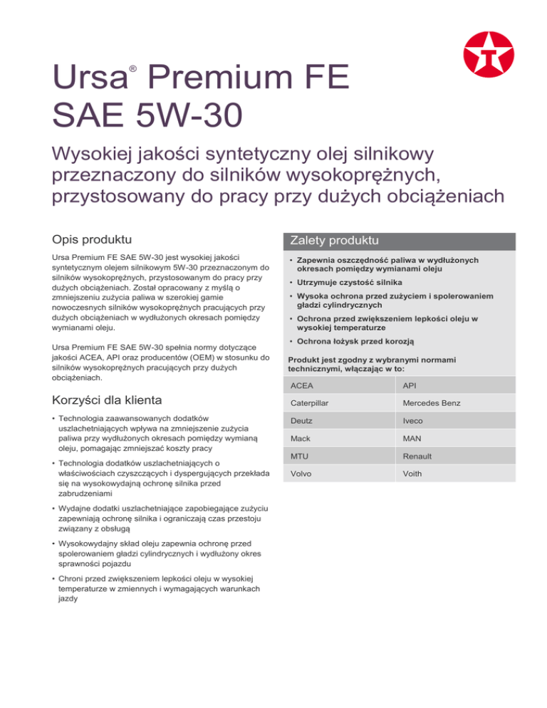 Ursa Premium FE SAE 5W-30 ® Wysokiej jakości syntetyczny olej silnikowy przeznaczony do silników wysokoprężnych, przystosowany do pracy przy dużych obciążeniach Opis produktu Zalety produktu Ursa Premium FE SAE 5W-30 jest wysokiej jakości syntetycznym olejem silnikowym 5W-30 przeznaczonym do silników wysokoprężnych, przystosowanym do pracy przy dużych obciążeniach. Został opracowany z myślą o zmniejszeniu zużycia paliwa w szerokiej gamie nowoczesnych silników wysokoprężnych pracujących przy dużych obciążeniach w wydłużonych okresach pomiędzy wymianami oleju. • Zapewnia oszczędność paliwa w wydłużonych okresach pomiędzy wymianami oleju Ursa Premium FE SAE 5W-30 spełnia normy dotyczące jakości ACEA, API oraz producentów (OEM) w stosunku do silników wysokoprężnych pracujących przy dużych obciążeniach. Korzyści dla klienta • Technologia zaawansowanych dodatków uszlachetniających wpływa na zmniejszenie zużycia paliwa przy wydłużonych okresach pomiędzy wymianą oleju, pomagając zmniejszać koszty pracy • Technologia dodatków uszlachetniających o właściwościach czyszczących i dyspergujących przekłada się na wysokowydajną ochronę silnika przed zabrudzeniami • Wydajne dodatki uszlachetniające zapobiegające zużyciu zapewniają ochronę silnika i ograniczają czas przestoju związany z obsługą • Wysokowydajny skład oleju zapewnia ochronę przed spolerowaniem gładzi cylindrycznych i wydłużony okres sprawności pojazdu • Chroni przed zwiększeniem lepkości oleju w wysokiej temperaturze w zmiennych i wymagających warunkach jazdy • Utrzymuje czystość silnika • Wysoka ochrona przed zużyciem i spolerowaniem gładzi cylindrycznych • Ochrona przed zwiększeniem lepkości oleju w wysokiej temperaturze • Ochrona łożysk przed korozją Produkt jest zgodny z wybranymi normami technicznymi, włączając w to: ACEA API Caterpillar Mercedes Benz Deutz Iveco Mack MAN MTU Renault Volvo Voith Ursa® Premium FE SAE 5W-30 ─ ciąg dalszy • Opracowany w celu zapewnienia niezawodnej ochrony przed korozją łożysk, zwiększa okres eksploatacji silnika Normy, zatwierdzenia i zalecenia • Dobre właściwości przeciwpienne zapewniają niezawodną wydajność smarowania i ochronę podzespołów • Mercedes Benz Aprobata MB 228.5 Zatwierdzenia • Deutz DQC IV-10 • Mack EO-N Zastosowania • MAN M3277, M3377 • Ursa Premium FE SAE 5W-30 jest zalecany do użytku w pojazdach ciężarowych i autobusach ,przystosowany do pracy przy dużych obciążeniach, szczególnie w zastosowaniach wymagających wydłużonych okresów pomiędzy wymianami oleju. Olej jest kompatybilny ze starszymi typami silników. Należy odnieść się do odpowiedniej instrukcji obsługi silnika lub zasięgnąć porady producenta w celu ustalenia prawidłowego okresu wymiany oleju • MTU Typ 3 • Ursa Premium FE SAE 5W-30 jest zalecany do użytku w innych użytkowych i terenowych silnikach wysokoprężnych, w przypadku których producenci nie określili zatwierdzonych typów oleju, jednak podają wymagania dotyczące wydajności do zastosowań usługowych, tak jak np. Iveco i Caterpillar • ACEA E4, E7 • Renault RLD-2 • Volvo VDS-3 • Voith Retarder B płynięcia Zgodność ze standardami • API CI-4 • Caterpillar ECF-2 Zalecenia Odpowiedni do użycia w zastosowaniach wymagających: • Iveco 18-1804 • Mercedes Benz MB 235.28 • Renault RD, RD-2 i RLD • Volvo VDS-2 © 2013-2014 Chevron Products UK Limited. All rights reserved. All trademarks are property owned by Chevron Intellectual Property LLC. EU v11 18 March 2014 Ursa® Premium FE SAE 5W-30 Ursa® Premium FE SAE 5W-30 ─ ciąg dalszy Dane Typowe Metody badań Test Klasa lepkości Wartość SAE 5W-30 Dopuszczalny okres magazynowania: 60 miesięcy od daty napełnienia, podanej na etykiecie produktu. Gęstość w temperaturze 15°C, kg/l ASTM D4052 0,855 ASTM D445 71,7 Lepkość kinematyczna w temperaturze 100°C, mm /s ASTM D445 12,1 Wskaźnik lepkości ASTM D2270 166 Temperatura krzepnięcia, °C ASTM D97 -51 Temperatura zapłonu COC, °C ASTM D92 230 Ogólna liczba zasadowa, mg KOH/g ASTM D2896 12 Popiół siarczanowy, %wt ASTM D874 1,3 2 Lepkość kinematyczna w temperaturze 40°C, mm /s 2 Podane informacje są danymi typowymi dla bieżącej produkcji, nie stanowią wymagań technicznych produktu i mogą podlegać zmianom w ramach dopuszczalnych tolerancji produkcyjnych. Zastrzega się prawo do dokonywania zmian w specyfikacji produktu. Powyższa Karta Produktu zastępuje wszelkie poprzednie wersje Karty Produktu i zawarte w nich informacje. Chevron nie bierze odpowiedzialności: za jakiekolwiek straty oraz szkody powstałe wskutek używania tego produktu niezgodnie z przeznaczeniem opisanym w Karcie Produktu. Zdrowie, bezpieczeństwo, przechowywanie i ochrona środowiska: zgodnie z aktualnie dostępnymi informacjami nie przypuszcza się, żeby produkt mógł powodować negatywne skutki oddziaływania na zdrowie, w przypadku kiedy jest używany zgodnie z przeznaczeniem oraz zgodnie z informacjami zawartymi w Karcie Charakterystyki Preparatu Niebezpiecznego. Karty Charakterystyki dostępne są na życzenie w lokalnym biurze handlowym lub poprzez stronę internetową. Produkt ten nie powinien być używany niezgodnie z przeznaczeniem. W postępowaniu ze zużytym produktem zadbać o ochronę środowiska naturalnego i zastosować się do lokalnych przepisów. © 2013-2014 Chevron Products UK Limited. All rights reserved. All trademarks are property owned by Chevron Intellectual Property LLC. EU v11 18 March 2014 Ursa® Premium FE SAE 5W-30