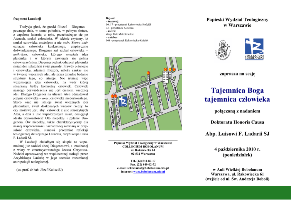 fragment Laudacji Tradycja głosi, że grecki filozof – Diogenes – pewnego dnia, w samo południe, w pełnym słońcu, z zapaloną latarnią w ręku, przechadzając się po Atenach, szukał człowieka. W tekście czytamy, iż szukał człowieka anthrôpos a nie anèr. Słowo anèr oznacza człowieka konkretnego, empirycznie doświadczanego. Diogenes zaś szukał człowieka – anthrôpos, człowieka, którego wyrażała idea platońska i w którym zawierała się pełnia człowieczeństwa. Diogenes jednak odrzucał platoński świat idei i platoński świat prawdy. Prawdy o świecie i człowieku, zdaniem filozofa, należy szukać nie w świecie wiecznych idei, ale przez żmudne badanie struktury tego, co istnieje. Nie istnieje więc wcześniejsza idea człowieka, na wzór której stwarzany byłby konkretny człowiek. Człowiek naszego doświadczenia nie jest cieniem wiecznej idei. Dlatego Diogenes na ulicach Aten odnajdywał jedynie człowieka – anèr, człowieka niedoskonałego. Skoro więc nie istnieje świat wiecznych idei platońskich, świat doskonałych wzorów rzeczy, to czy możliwe jest, aby człowiek z ulic starożytnych Aten, a dziś z ulic współczesnych miast, dosięgnął ideału doskonałości? Oto niepokój i pytanie Diogenesa. Ów niepokój, także charakterystyczny dla naszej współczesności naznaczonej niewiarą w przyszłość człowieka, stanowi przedmiot refleksji teologicznej dzisiejszego Laureata, arcybiskupa Luisa F. Ladarii SJ. W Laudacji chciałbym się skupić na wspomnianej już nadziei obcej Diogenesowi, a zrodzonej z wiary w zmartwychwstałego Jezusa Chrystusa. Nadziei opracowanej we współczesnej teologii przez Arcybiskupa Ladarię w jego szeroko rozumianej antropologii teologicznej. (ks. prof. dr hab. Józef Kulisz SJ) Dojazd: – tramwaj: 16, 17 - przystanek Rakowiecka-Kościół 33 - przystanek Kielecka – metro: stacja Pole Mokotowskie – autobus: 168 - przystanek Rakowiecka-Kościół Papieski Wydział Teologiczny w Warszawie zaprasza na sesję Tajemnica Boga tajemnica człowieka połączoną z nadaniem Doktoratu Honoris Causa Abp. Luisowi F. Ladarii SJ ________________________________________ Papieski Wydział Teologiczny w Warszawie COLLEGIUM BOBOLANUM ul. Rakowiecka 61 02-532 Warszawa Tel. (22) 542-87-17 Fax. (22) 849-02-72 e-mail: [email protected] internet: www.bobolanum.edu.pl 4 października 2010 r. (poniedziałek) w Auli Wielkiej Bobolanum Warszawa, ul. Rakowiecka 61 (wejście od ul. Św. Andrzeja Boboli)