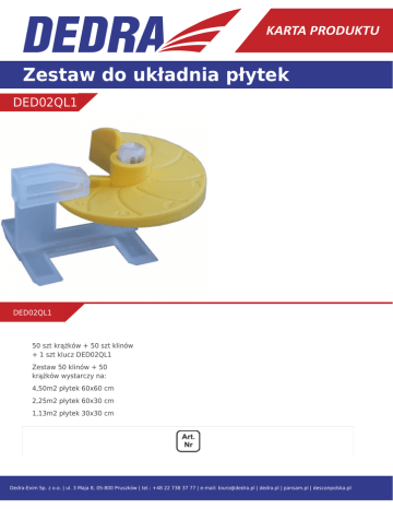 Zestaw do układnia płytek DED02QL1 DED02QL1 50 szt krążków + 50 szt klinów + 1 szt klucz DED02QL1 Zestaw 50 klinów + 50 krążków wystarczy na: 4,50m2 płytek 60x60 cm 2,25m2 płytek 60x30 cm 1,13m2 płytek 30x30 cm Dedra-Exim Sp. z o.o. | ul. 3 Maja 8, 05-800 Pruszków | tel.: +48 22 738 37 77 | e-mail: [email protected] | dedra.pl | pansam.pl | desconpolska.pl DED02QL1 Dedra-Exim Sp. z o.o. | ul. 3 Maja 8, 05-800 Pruszków | tel.: +48 22 738 37 77 | e-mail: [email protected] | dedra.pl | pansam.pl | desconpolska.pl