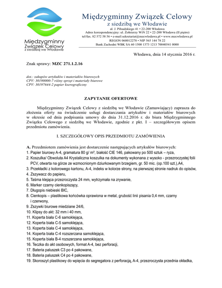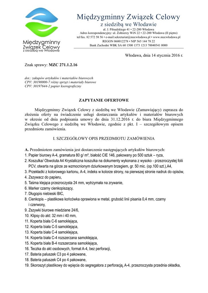 Międzygminny Związek Celowy z siedzibą we Włodawie al. J. Piłsudskiego 41 • 22-200 Włodawa Adres korespondencyjny: ul. Żołnierzy WiN 22 • 22-200 Włodawa (II piętro) tel/fax. 82 572 58 56 • e-mail:[email protected] • www.mzcwlodawa.pl REGON 060012278 • NIP 565 144 78 22 Bank Zachodni WBK SA 60 1500 1373 1213 70040541 0000 Włodawa, dnia 14 stycznia 2016 r. Znak sprawy: MZC 271.1.2.16 dot.: zakupów artykułów i materiałów biurowych CPV: 30190000-7 różny sprzęt i materiały biurowe CPV: 30197644-2 papier kserograficzny ZAPYTANIE OFERTOWE Międzygminny Związek Celowy z siedzibą we Włodawie (Zamawiający) zaprasza do złożenia oferty na świadczenie usługi dostarczania artykułów i materiałów biurowych w okresie od dnia podpisania umowy do dnia 31.12.2016 r. do biura Międzygminnego Związku Celowego z siedzibą we Włodawie, zgodnie z pkt. I – szczegółowym opisem przedmiotu zamówienia. I. SZCZEGÓŁOWY OPIS PRZEDMIOTU ZAMÓWIENIA A. Przedmiotem zamówienia jest dostarczenie następujących artykułów biurowych: 1. Papier biurowy A-4, gramatura 80 g/ m², białość CIE 146, pakowany po 500 sztuk – ryza, 2. Koszulka/ Obwoluta A4 Krystaliczna koszulka na dokumenty wykonana z wysoko - przezroczystej folii PCV, otwarta na górze ze wzmocnionym dziurkowanym brzegiem, gr. 50 mic. (op.100 szt.),A4, 3. Przekładki z kolorowego kartonu, A-4, indeks w kolorze strony, na pierwszej stronie nadruk do opisów, 4. Zszywacz do papieru, 5. Taśma klejąca przezroczysta 24 mm, wytrzymała na zrywanie, 6. Marker czarny cienkopiszący, 7. Długopis niebieski BIC, 8. Cienkopis – plastikowa końcówka oprawiona w metal, grubość linii pisania 0,4 mm, czarny i czerwony, 9. Zszywki biurowe miedziane 24/6, 10. Klipsy do akt: 32 mm i 40 mm, 11. Koperta biała C-6 samoklejąca, 12. Koperta biała C-5 samoklejąca, 13. Koperta biała C-4 samoklejąca, 14. Koperta biała C-4 rozszerzana samoklejąca, 15. Koperta biała B-4 rozszerzana samoklejąca, 16. Teczka do akt osobowych, format A-4, bez perforacji, 17. Bateria paluszek C3 po 4 pakowane, 18. Bateria paluszek C4 po 4 pakowane, 19. Skoroszyt plastikowy do wpięcia do segregatora z perforacją, A-4, przezroczysta przednia okładka, kolorowa tylna, pojemność 2 cm, 20. Wąsy do skoroszytu, 21. Tusz do stempli, poj. 25 ml., kolory: czerwony, niebieski i czarny, 22. Teczka z gumką, wykonana z mocnego kartonu ok. 350 g/m², format A4, 23. Segregator 50 mm grzbiet, A-4, oklejony folią PP, dolne krawędzie wzmocnione okuciem, 24. Segregator 70 mm grzbiet, A-4 oklejony folią PP, dolne krawędzie wzmocnione okuciem, 25. Spinacze biurowe o dł. 28 mm 26. Klej w sztyfcie do klejenia papieru, kartonu, usuwalny za pomocą wody, bezwonny, niebrudzący – 15 g, 27. Dziurkacz do papieru, 28. Rozszywacz do wszystkich rodzajów zszywek, posiada system blokady, 29. Ołówek w drewnianej obudowie, HB, wysoka jakość, 30. Organizer na biurko z przegródkami (na długopisy i inne materiały biurowe) 31. Toner do BROTHER HL – 4570CDW – czarny – zamiennik, 32. Toner do BROTHER HL – 4570CDW – czerwony – zamiennik, 33. Toner do BROTHER HL – 4570CDW – niebieski – zamiennik, 34. Toner do BROTHER HL – 4570CDW – żółty – zamiennik, 35. Toner do Konica Minolta Bizhub C224 – czarny – zamiennik, 36. Toner do Konica Minolta Bizhub C224 – czerwony – zamiennik, 37. Toner do Konica Minolta Bizhub C224 – niebieski – zamiennik, 38. Toner do Konica Minolta Bizhub C224 – żółty – zamiennik. B. Szacunkowa ilość artykułów będących przedmiotem zamówienia zostały określone w załączniku nr 1 w kolumnie 5 do niniejszego zapytania. C. Zamawiający wymaga, aby dostawy określonych partii artykułów biurowych następowały sukcesywnie, co najmniej raz w miesiącu na podstawie złożonych zamówień, które będą składane według bieżących potrzeb. D. Wykonawca na własny koszt dostarczy przedmiot danego zamówienia do siedziby Zamawiającego w terminie do 3 dni od dnia złożenia zamówienia. E. Zamawiający nie przewiduje wzrostu jednostkowych cen brutto poszczególnych artykułów w trakcie trwania zamówienia. F. Termin realizacji zamówienia od dnia podpisania umowy do dnia 31.12.2016 r. II. WYMAGANIA, CO DO PRZYGOTOWANIA OFERTY A. Oferta powinna być sporządzona na wzorze stanowiącym załącznik nr 1 do niniejszego zapytania. Powinna być opatrzona pieczątką firmową i podpisana. B. Oferta powinna zawierać: - Datę sporządzenia, - Nazwę oferenta, - Adresata oferty, - Przedmiot oferty, - Termin ważności oferty, - Cenę brutto. III. KRYTERIA WYBORU Spośród otrzymanych ofert zostanie wybrana ta oferta, która spełni kryterium wyboru tj. najniższa cena brutto – 100% IV. DODATKOWE INFORMACJE Ofertę należy złożyć w siedzibie Zamawiającego: Międzygminny Związek Celowy z siedzibą we Włodawie, ul. Żołnierzy WiN 22, 22-200 Włodawa (II piętro, pokój nr 11) lub przesłać drogą elektroniczną na adres e-mail [email protected] do dnia 25.01.2016 r. do godziny 13:00 – decyduje data wpływu do Zamawiającego. Z dopiskiem: „OFERTA CENOWA NA DOSTAWĘ ARTYKUŁÓW I MATERIAŁÓW BIUROWYCH” Zamawiający w sytuacji otrzymania najkorzystniejszej oferty przekraczającej wartością kwotę wynikającą z przeznaczonego na ten cel budżetu dopuszcza negocjacje oferty, której celem będzie doprecyzowanie jej szczegółów, w tym ustalenie ostatecznej ceny usługi. O terminie i miejscu przeprowadzenia negocjacji wybrany oferent zostanie powiadomiony telefonicznie. Zamawiający udzieli wybranemu wykonawcy zamówienia na podstawie pisemnej umowy określającej warunki realizacji zamówienia. Zamawiający dopuszcza unieważnienie postępowania bez podania przyczyny. Osobą upoważnioną do kontaktu z oferentami jest: Anna Topolska Telefon 82 572-58-56 e-mail: [email protected] Z poważaniem z up. Przewodniczącego Zarządu Międzygminnego Związku Celowego z/s we Włodawie Józef Steć Specjal