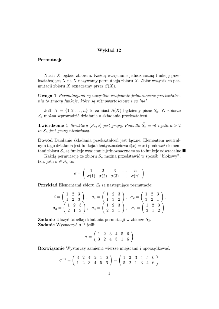 Uwaga 1 Permutacjami są wszystkie wzajemnie jednoznaczne przekształcenia to znaczy funkcje, które są różnowartościowe i są ’na’.