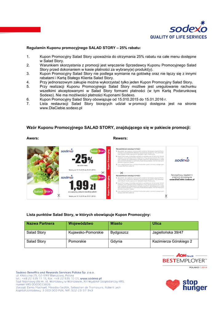 Regulamin Kuponu promocyjnego SALAD STORY – 25% rabatu: 1. 2. 3. 4. 5. 6. 7. Kupon Promocyjny Salad Story upoważnia do otrzymania 25% rabatu na całe menu dostępne w Salad Story. Warunkiem skorzystania z promocji jest wręczenie Sprzedawcy Kuponu Promocyjnego Salad Story przed dokonaniem w kasie płatności za wybrany(e) produkt(y). Kupon Promocyjny Salad Story nie podlega wymianie na gotówkę oraz nie łączy się z innymi rabatami i Kartą Stałego Klienta Salad Story. Przy jednorazowym zakupie można wykorzystać tylko jeden Kupon Promocyjny Salad Story. Przy realizacji Kuponu Promocyjnego Salad Story możliwe jest uregulowanie rachunku wszelkimi akceptowanymi w Salad Story formami płatności (w tym Kartą Podarunkową Sodexo). Nie ma możliwości płatności Kuponami Sodexo. Kupon Promocyjny Salad Story obowiązuje od 15.010.2015 do 15.01.2016 r. Lista restauracji Salad Story biorących udział w promocji dostępna jest na stronie www.DlaCiebie.sodexo.pl Wzór Kuponu Promocyjnego SALAD STORY, znajdującego się w pakiecie promocji: Awers: Rewers: Lista punktów Salad Story, w których obowiązuje Kupon Promocyjny: Nazwa Partnera Województwo Miasto Ulica Salad Story Kujawsko-Pomorskie Bydgoszcz Jagiellońska 39/47 Salad Story Pomorskie Gdynia Kazimierza Górskiego 2 Salad Story Śląskie Katowice 3-Go Maja 30 Salad Story Śląskie Katowice Chorzowska 120 Salad Story Małopolskie Kraków Podgórska 32 Salad Story Lubelskie Lublin Lipowa 13 Salad Story Lubelskie Lublin Wincentego Witosa 32 Salad Story Wielkopolskie Poznań Drużbickiego 2 Salad Story Wielkopolskie Poznań Stanisława Matyi 2 Salad Story Wielkopolskie Poznań Stanisława Matyi 2 Salad Story Wielkopolskie Poznań Półwiejska 42 Salad Story Mazowieckie Radom Bolesława Chrobrego 1 Salad Story Mazowieckie Warszawa Nowy Świat 18/20 Salad Story Mazowieckie Warszawa Wołoska 12 Salad Story Mazowieckie Warszawa Krucza 41/43 Salad Story Mazowieckie Warszawa Piękna 11 Salad Story Mazowieckie Warszawa Puławska 2 Salad Story Mazowieckie Warszawa Polna 46 Salad Story Mazowieckie Warszawa Prosta 32 Salad Story Mazowieckie Warszawa Jerozolimskie 148 Salad Story Mazowieckie Warszawa Powsińska 31 Salad Story Mazowieckie Warszawa Ul Złota 59 Salad Story Dolnośląskie Wrocław Plac Grunwaldzki 22 Salad Story Dolnośląskie Wrocław Świdnicka 40