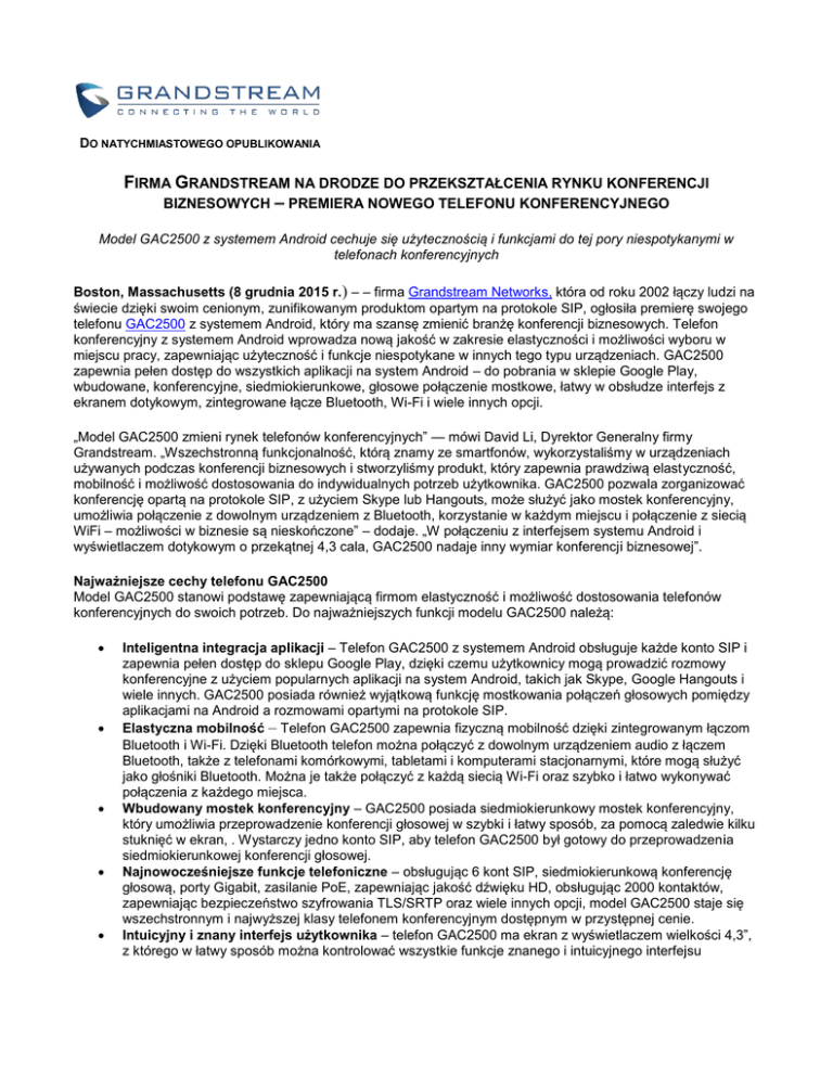 DO NATYCHMIASTOWEGO OPUBLIKOWANIA FIRMA GRANDSTREAM NA DRODZE DO PRZEKSZTAŁCENIA RYNKU KONFERENCJI BIZNESOWYCH – PREMIERA NOWEGO TELEFONU KONFERENCYJNEGO Model GAC2500 z systemem Android cechuje się użytecznością i funkcjami do tej pory niespotykanymi w telefonach konferencyjnych Boston, Massachusetts (8 grudnia 2015 r. ) – – firma Grandstream Networks, która od roku 2002 łączy ludzi na świecie dzięki swoim cenionym, zunifikowanym produktom opartym na protokole SIP, ogłosiła premierę swojego telefonu GAC2500 z systemem Android, który ma szansę zmienić branżę konferencji biznesowych. Telefon konferencyjny z systemem Android wprowadza nową jakość w zakresie elastyczności i możliwości wyboru w miejscu pracy, zapewniając użyteczność i funkcje niespotykane w innych tego typu urządzeniach. GAC2500 zapewnia pełen dostęp do wszystkich aplikacji na system Android – do pobrania w sklepie Google Play, wbudowane, konferencyjne, siedmiokierunkowe, głosowe połączenie mostkowe, łatwy w obsłudze interfejs z ekranem dotykowym, zintegrowane łącze Bluetooth, Wi-Fi i wiele innych opcji. „Model GAC2500 zmieni rynek telefonów konferencyjnych” — mówi David Li, Dyrektor Generalny firmy Grandstream. „Wszechstronną funkcjonalność, którą znamy ze smartfonów, wykorzystaliśmy w urządzeniach używanych podczas konferencji biznesowych i stworzyliśmy produkt, który zapewnia prawdziwą elastyczność, mobilność i możliwość dostosowania do indywidualnych potrzeb użytkownika. GAC2500 pozwala zorganizować konferencję opartą na protokole SIP, z użyciem Skype lub Hangouts, może służyć jako mostek konferencyjny, umożliwia połączenie z dowolnym urządzeniem z Bluetooth, korzystanie w każdym miejscu i połączenie z siecią WiFi – możliwości w biznesie są nieskończone” – dodaje. „W połączeniu z interfejsem systemu Android i wyświetlaczem dotykowym o przekątnej 4,3 cala, GAC2500 nadaje inny wymiar konferencji biznesowej”. Najważniejsze cechy telefonu GAC2500 Model GAC2500 stanowi podstawę zapewniającą firmom elastyczność i możliwość dostosowania telefonów konferencyjnych do swoich potrzeb. Do najważniejszych funkcji modelu GAC2500 należą: Inteligentna integracja aplikacji – Telefon GAC2500 z systemem Android obsługuje każde konto SIP i zapewnia pełen dostęp do sklepu Google Play, dzięki czemu użytkownicy mogą prowadzić rozmowy konferencyjne z użyciem popularnych aplikacji na system Android, takich jak Skype, Google Hangouts i wiele innych. GAC2500 posiada również wyjątkową funkcję mostkowania połączeń głosowych pomiędzy aplikacjami na Android a rozmowami opartymi na protokole SIP. Elastyczna mobilność – Telefon GAC2500 zapewnia fizyczną mobilność dzięki zintegrowanym łączom Bluetooth i Wi-Fi. Dzięki Bluetooth telefon można połączyć z dowolnym urządzeniem audio z łączem Bluetooth, także z telefonami komórkowymi, tabletami i komputerami stacjonarnymi, które mogą służyć jako głośniki Bluetooth. Można je także połączyć z każdą siecią Wi-Fi oraz szybko i łatwo wykonywać połączenia z każdego miejsca. Wbudowany mostek konferencyjny – GAC2500 posiada siedmiokierunkowy mostek konferencyjny, który umożliwia przeprowadzenie konferencji głosowej w szybki i łatwy sposób, za pomocą zaledwie kilku stuknięć w ekran, . Wystarczy jedno konto SIP, aby telefon GAC2500 był gotowy do przeprowadzenia siedmiokierunkowej konferencji głosowej. Najnowocześniejsze funkcje telefoniczne – obsługując 6 kont SIP, siedmiokierunkową konferencję głosową, porty Gigabit, zasilanie PoE, zapewniając jakość dźwięku HD, obsługując 2000 kontaktów, zapewniając bezpieczeństwo szyfrowania TLS/SRTP oraz wiele innych opcji, model GAC2500 staje się wszechstronnym i najwyższej klasy telefonem konferencyjnym dostępnym w przystępnej cenie. Intuicyjny i znany interfejs użytkownika – telefon GAC2500 ma ekran z wyświetlaczem wielkości 4,3”, z którego w łatwy sposób można kontrolować wszystkie funkcje znanego i intuicyjnego interfejsu użytkownika systemu Android. GAC2500 posiada również interfejs webowy umożliwiający sterowanie i zarządzanie urządzeniem. Obsługa połączeń łańcuchowych – Dwa telefony GAC2500 można zestawić w połączenie łańcuchowe, aby zapewnić wygodne rozmieszczenie uczestników konferencji w sali dowolnego rozmiaru. Cena i dostępność Kliknij tutaj, aby wyświetlić szczegółowe informacje dotyczące urządzenia GAC2500 oraz materiały marketingowe i informacje techniczne. Cena i dostępność Telefon GAC2500 jest już ogólnie dostępny w sprzedaży za pośrednictwem globalnych kanałów dystrybucji firmy Grandstream. INFORMACJE O FIRMIE GRANDSTREAM NETWORKS Grandstream Networks, Inc. działa na rynku komunikacji od 2002 roku, dostarczając produkty zunifikowanej komunikacji opartej na protokole SIP oraz rozwiązania umożliwiające firmom osiągnięcie wyższej produktywności. Nasze wielokrotnie nagradzane rozwiązania przeznaczone są dla małych, średnich oraz dużych przedsiębiorstw i są rozpoznawane na świecie z uwagi na jakość, niezawodność i innowacyjność. Rozwiązania firmy Grandstream obniżają koszty komunikacji, zwiększają ochronę zabezpieczeń i zwiększają produktywność. Produkty wykorzystujące otwarty standard SIP charakteryzują się szeroką zgodnością z rozwiązaniami branżowymi, wyjątkowymi funkcjami i niezrównaną elastycznością. Więcej informacji można znaleźć na stronie www.grandstream.com lub na naszych profilach w serwisach społecznościowych Facebook, Linkedin i Twitter. ### DANE KONTAKTOWE GRANDSTREAM Phil Bowers 1-617-566-9300 [email protected]