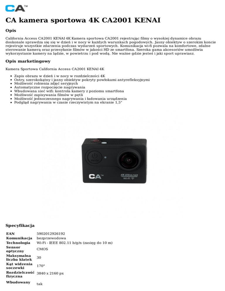 CAkamerasportowa4KCA2001KENAI Opis CaliforniaAccessCA2001KENAI4KKamerasportowaCA2001rejestrującfilmyowysokiejdynamiceobrazu doskonalesprawdzasięsięwdzieńiwnocywkażdychwarunkachpogodowych.Jasnyobiektywoszerokimkoncie rejestrujewszystkiezdarzeniapodczaswydarzeńsportowych.Komunikacjawi-fipozwalanakomfortowe,zdalne sterowaniekamerąorazprzesyłaniefilmówwjakościHDzesmartfona.Szerokagamaakcesoriówumożliwia wykorzystaniekamerynalądzie,wpowietrzuipodwodą.Nieważnegdziejesteśijakisportuprawiasz. Opismarketingowy KameraSportowaCaliforniaAccessCA2001KENAI4K Zapisobrazuwdzieńiwnocywrozdzielczości4K Ostry,szerokokątnyijasnyobiektywpokrytypowłokamiantyrefleksyjnymi Możliwośćrobieniazdjęćseryjnych Automatycznerozpoczęcienagrywania Wbudowanasiećwifi:kontrolakameryzpoziomusmartfona Możliwośćzapisywaniafilmówwpętli Możliwośćjednoczesnegonagrywaniaiładowaniaurządzenia Podglądnagrywaniawczasierzeczywistymnaekranie1,5" Specyfikacja EAN Komunikacja Technologia Sensor optyczny Maksymalna liczbaklatek Kątwidzenia soczewki Rozdzielczość fizyczna Wbudowany 5902012926192 bezprzewodowa Wi-Fi-IEEE802.11b/g/n(zasięgdo10m) CMOS 30 170° 3840x2160px tak mikrofon Długość przewodu Waga Wymiary Kolor czarny Gwarancja 2lata Dodatkowe obudowawodoszczelnado30m,uchwytnakierownicyrowerowej,7uchwytymocujących,tylny akcesoria pancerzobudowy,ładowarkasieciowa,zaciski:mocowaniekasku;przepaski Matryca 2.0/5.0MPx Formatzapisu MOV Formatzdjęć JPG Wbudowana 1024MBDDR3 pamięć Format microSD nośnika Złącza miniUSB,microSD,microHDMI Wyświetlacz tak LCD Przekątna 2cale ekranuLCD Bateria 900mAh Obudowa tak wodoszczelna e-mail:[email protected] ©2015-2017CaliforniaAccessWszystkieprawazastrzeżone