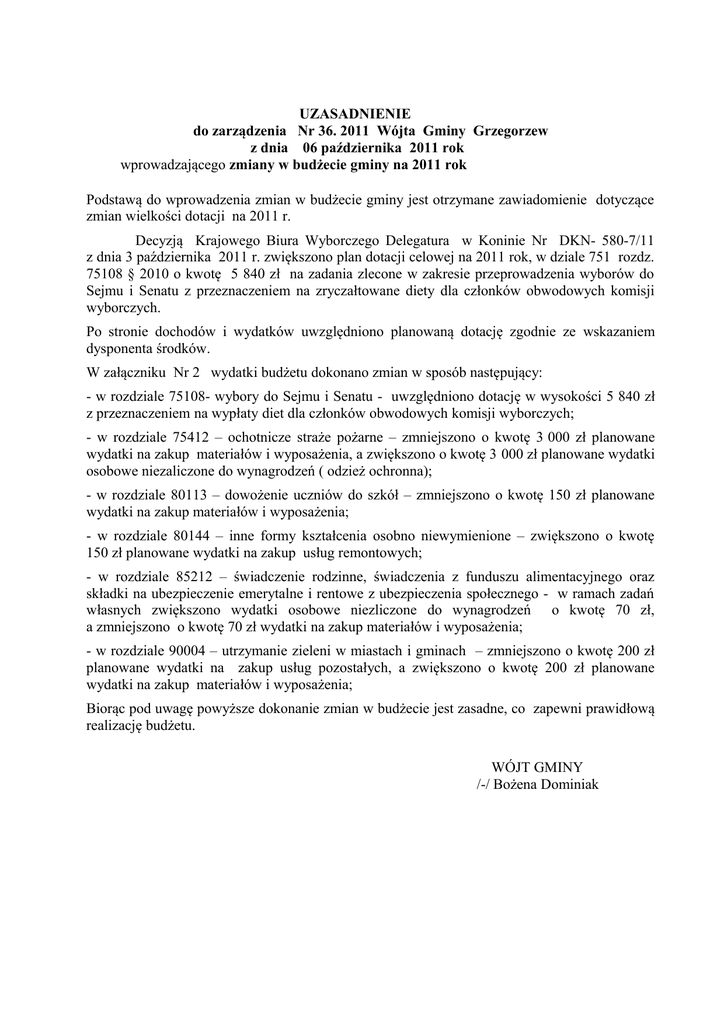 UZASADNIENIE do zarządzenia Nr 36. 2011 Wójta Gminy Grzegorzew z dnia 06 października 2011 rok wprowadzającego zmiany w budżecie gminy na 2011 rok Podstawą do wprowadzenia zmian w budżecie gminy jest otrzymane zawiadomienie dotyczące zmian wielkości dotacji na 2011 r. Decyzją Krajowego Biura Wyborczego Delegatura w Koninie Nr DKN- 580-7/11 z dnia 3 października 2011 r. zwiększono plan dotacji celowej na 2011 rok, w dziale 751 rozdz. 75108 § 2010 o kwotę 5 840 zł na zadania zlecone w zakresie przeprowadzenia wyborów do Sejmu i Senatu z przeznaczeniem na zryczałtowane diety dla członków obwodowych komisji wyborczych. Po stronie dochodów i wydatków uwzględniono planowaną dotację zgodnie ze wskazaniem dysponenta środków. W załączniku Nr 2 wydatki budżetu dokonano zmian w sposób następujący: - w rozdziale 75108- wybory do Sejmu i Senatu - uwzględniono dotację w wysokości 5 840 zł z przeznaczeniem na wypłaty diet dla członków obwodowych komisji wyborczych; - w rozdziale 75412 – ochotnicze straże pożarne – zmniejszono o kwotę 3 000 zł planowane wydatki na zakup materiałów i wyposażenia, a zwiększono o kwotę 3 000 zł planowane wydatki osobowe niezaliczone do wynagrodzeń ( odzież ochronna); - w rozdziale 80113 – dowożenie uczniów do szkół – zmniejszono o kwotę 150 zł planowane wydatki na zakup materiałów i wyposażenia; - w rozdziale 80144 – inne formy kształcenia osobno niewymienione – zwiększono o kwotę 150 zł planowane wydatki na zakup usług remontowych; - w rozdziale 85212 – świadczenie rodzinne, świadczenia z funduszu alimentacyjnego oraz składki na ubezpieczenie emerytalne i rentowe z ubezpieczenia społecznego - w ramach zadań własnych zwiększono wydatki osobowe niezliczone do wynagrodzeń o kwotę 70 zł, a zmniejszono o kwotę 70 zł wydatki na zakup materiałów i wyposażenia; - w rozdziale 90004 – utrzymanie zieleni w miastach i gminach – zmniejszono o kwotę 200 zł planowane wydatki na zakup usług pozostałych, a zwiększono o kwotę 200 zł planowane wydatki na zakup materiałów i wyposażenia; Biorąc pod uwagę powyższe dokonanie zmian w budżecie jest zasadne, co zapewni prawidłową realizację budżetu. WÓJT GMINY /-/ Bożena Dominiak