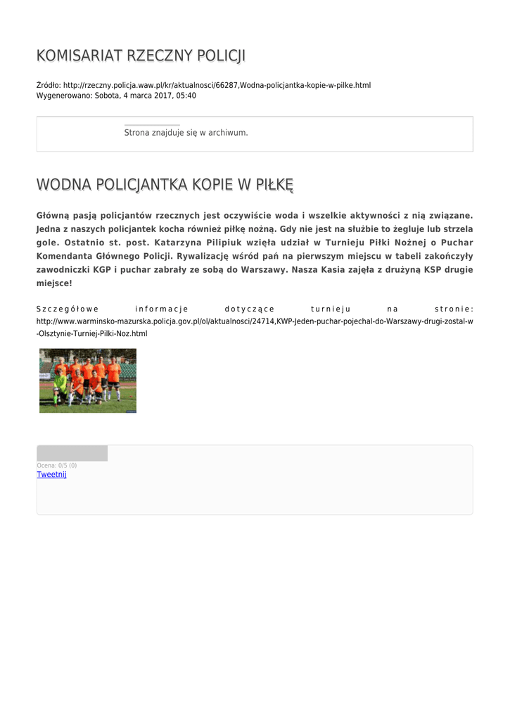 KOMISARIAT RZECZNY POLICJI Źródło: http://rzeczny.policja.waw.pl/kr/aktualnosci/66287,Wodna-policjantka-kopie-w-pilke.html Wygenerowano: Sobota, 4 marca 2017, 05:40 Strona znajduje się w archiwum. WODNA POLICJANTKA KOPIE W PIŁKĘ Główną pasją policjantów rzecznych jest oczywiście woda i wszelkie aktywności z nią związane. Jedna z naszych policjantek kocha również piłkę nożną. Gdy nie jest na służbie to żegluje lub strzela gole. Ostatnio st. post. Katarzyna Pilipiuk wzięła udział w Turnieju Piłki Nożnej o Puchar Komendanta Głównego Policji. Rywalizację wśród pań na pierwszym miejscu w tabeli zakończyły zawodniczki KGP i puchar zabrały ze sobą do Warszawy. Nasza Kasia zajęła z drużyną KSP drugie miejsce! Szczegółowe informacje dotyczące turnieju na stronie: http://www.warminsko-mazurska.policja.gov.pl/ol/aktualnosci/24714,KWP-Jeden-puchar-pojechal-do-Warszawy-drugi-zostal-w -Olsztynie-Turniej-Pilki-Noz.html Ocena: 0/5 (0) Tweetnij