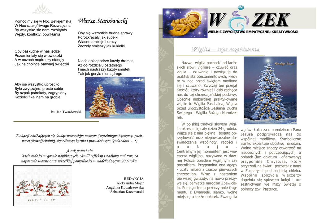 Pomódlmy się w Noc Betlejemską W Noc szczęśliwego Rozwiązania By wszystko się nam rozplątało Węzły, konflikty, powikłania Oby paskudne w nas jędze Pozamieniały się w owieczki A w oczach mądre łzy stanęły Jak na choince barwnej świeczki Wiersz Staroświecki Oby się wszystkie trudne sprawy Porozkręcały jak supełki Własne ambicje i urazy Zaczęły śmieszy jak kukiełki Niech anioł podrze każdy dramat, Aż do rozdziału ostatniego I niech nastraszy każdy smutek Tak jak goryla niemądrego Aby się wszystko uprościło Było zwyczajne, proste sobie By szpak pstrokaty, zagrypiony Koziołki fikał nam na grobie ks. Jan Twardowski Z okazji zbliżających się Świąt wszystkim naszym Czytelnikom życzymy: pachnącej (żywej) choinki, życzliwego karpia i prawdziwego Gwiazdora… :) A tak poważnie: Wiele radości w gronie najbliższych, chwili refleksji i zadumy nad tym, co naprawdę ważne oraz wszelkiej pomyślności w nadchodzącym 2007roku. REDAKCJA Aleksandra Majer Angelika Kowalczewska Sebastian Kaczmarski W ZEK WIELKIE ZWYCIĘSTWO EMPATYCZNEJ KREATYWNOŚCI Nazwa wigilia pochodzi od łacińskich słów: vigiliare – czuwać oraz vigilia – czuwanie i nawiązuje do praktyk starotestamentowych, kiedy to w noc przed świętem modlono się i czuwano. Zwyczaj ten przejął Kościół, który również i dziś zachęca nas do tej chrześcijańskiej postawy. Obecnie najbardziej praktykowane wigilie to Wigilia Paschalna, Wigilia przed uroczystością Zesłania Ducha Świętego i Wigilia Bożego Narodzenia. W polskiej tradycji słowem Wigilia określa się cały dzień 24 grudnia. Wiąże się z nim piękna i bogata obrzędowość oraz niepowtarzalne doświadczenie wspólnoty, radości i p o k o j u . Centralnym jej momentem jest wieczerza wigilijna, nazywana w dawnej Polsce obiadem wigilijnym czy postnikiem. Przypomina ona agapy - uczty miłości z czasów pierwszych chrześcijan. Wraz z nastaniem pierwszej gwiazdy, na nowo przeżywa się pamiątkę narodzin Zbawiciela. Pomaga temu przeczytanie fragmentu z Ewangelii, sianko, wolne miejsce, a także opłatek. Ewangelia wg św. Łukasza o narodzinach Pana Jezusa podprowadza nas do wspólnej modlitwy. Symboliczne sianko akcentuje ubóstwo narodzin. Wolne miejsce znaczy otwartość na nieobecnych i potrzebujących, a opłatek (łac. oblatum - ofiarowany) przypomina Chrystusa, który przyszedł na świat i pozostał z nami w Eucharystii pod postacią chleba. Wspólne spożycie wieczerzy dopełnia się śpiewem kolęd i uczestnictwem we Mszy Świętej o północy tzw. Pasterce. Str. 2 BOŻE NARODZENIE Boże Narodzenie zajmuje wśród świąt chrześcijańskich pozycję niezwykłą. Stanowi misterium radości, w którym krzyżują się dwie przestrzenie: ludzka — przyrodzona i boska — nadprzyrodzona. Doskonale tajemnicę wcielenia, która dokonała się ponad 2000 lat temu oddaje św. Jan (1, 14): „A Słowo stało się ciałem i zamieszkało wśród nas. I oglądaliśmy Jego chwałę, chwałę, jaką Jednorodzony otrzymuje od Ojca, pełen łaski i prawdy”. Szczególnym wyrazem radości towarzyszącej Nativitas Domini jest bogata i różnorodna twórczość literacka, teatralna, malarska i muzyczna. Święto inspiruje od wieków artystów różnych wyznań chrześcijańskich, czego dowodem są komponowane na tą uroczystość hymny, motety, kantaty, msze, nieszpory, pastorelle oraz najliczniejsza grupa — kolędy i pastorałki. „Tak jak pasterze i mędrcy ze Wschodu, my też poszukujemy. Poszukujemy prezentów, pierwszej gwiazdy, Boga. Oby Twoje poszukiwania świąteczne kończyły się sukcesem.” „Przygotuj miejsce dla gościa, Niech radość i pokój wypełnią Twój dom, A świat niech dzieli się chlebem.” Str. 3 Święty rozdający prezenty Biskup Miry w Azji Mniejszej, Mikołaj (zmarł około 352 roku), jest jednym z najbardziej znanych świętych. Był jedynym synem zamożnych rodziców i bardzo wcześnie zaczął prowadzić niezwykle ascetyczny tryb życia. Został kapłanem i zasłynął jako hojny dobroczyńca. Gdy zaraza spowodowała śmierć jego rodziców, odziedziczony majątek rozdał ubogim. Jego działalność charytatywna miała bardzo dyskretny charakter. Zasłynął też cudami: gdy burza morska groziła rozbiciem statku, którym podróżował, modlitwą wybłagał ustanie nawałnicy. Stąd też marynarze czczą św. Mikołaja jako swego patrona. Wierni w miejscowości Mira wybrali go na swego biskupa. Wszystkie dochody przeznaczał na wspieranie ubogich, nie posiadał niczego poza ubraniem. Nawet sprzęty domowe pożyczał od znajomych. Współczesny portret św. Mikołaja Aż do połowy XX w. święty Mikołaj w Polsce wyobrażany był zawsze jako biskup - nosił ornat, na głowie miał infułę, a w ręku pastorał. Jeszcze dziś spotkać można takiego właśnie świętego Mikołaja, i to nie tylko na uroczystościach organizowanych w kościołach. Bardzo często jednak współczesny święty wygląda inaczej: ma długą, siwą brodę, na głowie czerwoną czapkę z białym pomponem, czerwone ubranie przewiązane szerokim pasem, a w ręce trzyma starczą laskę. Tak jest zresztą wyobrażany na całym świecie.