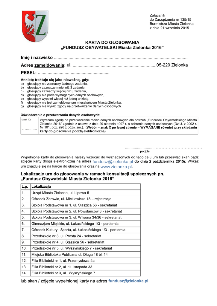 Załącznik do Zarządzenia nr 135/15 Burmistrza Miasta Zielonka z dnia 21 września 2015 KARTA DO GŁOSOWANIA „FUNDUSZ OBYWATELSKI Miasta Zielonka 2016” Imię i nazwisko .............................................................................................................. Adres zameldowania: ul. ....................................................................,05-220 Zielonka PESEL: ........................................................... Ankietę traktuje się jako nieważną, gdy: a) b) c) d) e) f) g) głosujący nie zaznaczy żadnego zadania, głosujący zaznaczy mniej niż 3 zadania; głosujący zaznaczy więcej niż 3 zadania, głosujący nie poda wymaganych danych osobowych, głosujący wypełni więcej niż jedną ankietę, głosujący nie jest zameldowanym mieszkańcem Miasta Zielonka, głosujący nie wyrazi zgody na przetwarzanie danych osobowych. Oświadczenie o przetwarzaniu danych osobowych: (znak X) ….......... Wyrażam zgodę na przetwarzanie moich danych osobowych dla potrzeb „Funduszu Obywatelskiego Miasta Zielonka 2016” zgodnie z ustawą z dnia 29 sierpnia 1997 r. o ochronie danych osobowych (Dz.U. z 2002 r. Nr 101, poz. 926 z późn. zm.). (Wybór – znak X po lewej stronie – WYMAGANE również przy składaniu karty do głosowania pocztą elektroniczną) ............................…………………………… podpis Wypełnione karty do głosowania należy wrzucać do wyznaczonych do tego celu urn lub przesyłać skan bądź zdjęcie karty drogą elektroniczną na adres [email protected] do dnia 2 października 2015r. Wykaz urn znajduje się na karcie do głosowania oraz na www.zielonka.pl. Lokalizacje urn do głosowania w ramach konsultacji społecznych pn. „Fundusz Obywatelski Miasta Zielonka 2016” L.p. Lokalizacja 1. Urząd Miasta Zielonka, ul. Lipowa 5 2. Ośrodek Zdrowia, ul. Mickiewicza 18 – rejestracja 3. Szkoła Podstawowa nr 1, ul. Staszica 56 - sekretariat 4. Szkoła Podstawowa nr 2, ul. Powstańców 3 - sekretariat 5. Szkoła Podstawowa nr 3, ul. Wilsona 34/36 - sekretariat 6. Gimnazjum Miejskie, ul. Łukasińskiego 1/3 - portiernia 7. Ośrodek Kultury i Sportu, ul. Łukasińskiego 1/3 - portiernia 8. Przedszkole nr 3, ul. Prosta 24 - sekretariat 9. Przedszkole nr 4, ul. Staszica 56 - sekretariat 10. Przedszkole nr 5, ul. Wyszyńskiego 7 - sekretariat 11. Miejska Biblioteka Publiczna ul. Długa 18 bl. 14 12. Filia Biblioteki nr 1, ul. Przemysłowa 4a 13. Filia Biblioteki nr 2, ul. 11 listopada 33 14. Filia Biblioteki nr 3, ul. Wyszyńskiego 7 lub skan / zdjęcie wypełnionej karty na adres [email protected] Proszę wybrać 3 projekty wskazując dany projekt znakiem X: L.p . Tytuł projektu Krótki opis projektu 1. Kamera monitoringu miejskiego skrzyżowanie ul. Armii Krajowej i Paderewskiego Montaż i przyłączenie kamery do monitoringu miejskiego na skrzyżowaniu ulic Armii Krajowej i Paderewskiego 2. Kamera monitoringu miejskiego skrzyżowanie ul. 11 Listopada i Waryńskiego Montaż i przyłączenie kamery do monitoringu miejskiego na skrzyżowaniu ulic 11 Listopada i Waryńskiego 3. Tor pumptrack dla rowerzystów na Wykonanie toru pumptrack dla rowerzystów na terenie "po koszarowcu" terenie "po koszarowcu", przy ul. Wojska Polskiego 4. Program publicznego dostępu do defibrylacji Montaż 4 automatycznych ogólnodostępnych defibrylatorów na terenie miasta 5. Akcja społeczna "Przywróćmy chodniki pieszym" Kampania społeczna (ulotki, plakaty), mająca na celu zwrócenie uwagi kierowców na prawidłowe parkowanie 6. Nowe książki dla dzieci w Zakup nowych książek dla dzieci i młodzieży w filii bibliotece przy ul. Wyszyńskiego 7 Miejskiej Biblioteki Publicznej przy ul. Wyszyńskiego 7 (Osiedle Poligon) 7. Nowe książki w bibliotece przy ul. Przemysłowej 4a Zakup nowych książek dla dzieci i młodzieży w filii Miejskiej Biblioteki Publicznej przy ul. Przemysłowej 4a 8. Street Workout Park - park do ćwiczeń fizycznych w Dębinkach Park do ćwiczeń z użyciem ciężaru własnego ciała, m.in. drążki, drabinki, poręcze równoległe, lina, koła gimnastyczne - Park Dębinki 9. Zakup nowego pieca do wypalania Zakup nowego pieca do wypalania prac z ceramiki, prac z ceramiki wykorzystywanego na zajęciach sekcji ceramiki w Ośrodku Kultury i Sportu w Zielonce 10. Utworzenie działu językowego w Miejskiej Bibliotece Publicznej w Zielonce Zakup podręczników, słowników i audiobooków do nauki języków obcych w Miejskiej Bibliotece Publicznej 11. Wyznaczenie i zagospodarowanie Wyposażenie przestrzeni "po koszarowcu" przy przestrzeni piknikowej na terenie ul. Wojska Polskiego" w wiaty piknikowe, ławki, "po koszarowcu" miejsce na ognisko, stół, kosze na śmieci 12. Zagospodarowanie dziedzińca Szkoły Podstawowej nr 1 na cele edukacyjno-rekreacyjne Wyposażenie dziedzińca szkoły m.in. w ławki, alejki, nasadzenia, oświetlenie, utworzenie kącika botanicznego, remont nawierzchni 13. Rewitalizacja boiska piłkarskiego - Wykonanie nawierzchni trawiastej na boisku Osiedle Poligon pomiędzy blokami 1 i 8 na osiedlu "Poligon", zakup bramek i ławek 14. Przyjazny przystanek Organizacja konkursu na koncepcję przystanku autobusowego przy Muzeum Zielonki, wykonanie przystanku 15. Spowolnienie ruchu na ul. Ossowskiej w części z płyt betonowych Wykonanie projektu organizacji ruchu i montaż znaków drogowych, ograniczających prędkość na ul. Ossowskiej Wybór (znak X)