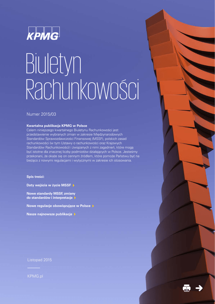 Biuletyn Rachunkowości Numer 2015/03 Kwartalna publikacja KPMG w Polsce Celem niniejszego kwartalnego Biuletynu Rachunkowości jest przedstawienie wybranych zmian w zakresie Międzynarodowych Standardów Sprawozdawczości Finansowej (MSSF), polskich zasad rachunkowości (w tym Ustawy o rachunkowości oraz Krajowych Standardów Rachunkowości) i związanych z nimi zagadnień, które mogą być istotne dla znacznej liczby podmiotów działających w Polsce. Jesteśmy przekonani, że okaże się on cennym źródłem, które pomoże Państwu być na bieżąco z nowymi regulacjami i wytycznymi w zakresie ich stosowania. Spis treści: Daty wejścia w życie MSSF Nowe standardy MSSF, zmiany do standardów i interpretacje Nowe regulacje obowiązujące w Polsce Nasze najnowsze publikacje Listopad 2015 KPMG.pl BIULETYN RACHUNKOWOŚCI | Numer 2015/03 Spis treści Daty wejścia w życie MSSF Daty wejścia w życie – w skrócie..................................................................................................... 3 Status zatwierdzenia MSSF przez Unię Europejską (UE).................................................................. 3 Nowe standardy MSSF, zmiany do standardów i interpretacje Propozycja odroczenia daty zastosowania zmian do MSSF 10 i MSR 28......................................... 4 Nowe regulacje obowiązujące w Polsce Nowelizacja Ustawy o rachunkowości.............................................................................................. 5 Nasze najnowsze publikacje Wytyczne do przygotowania sprawozdań finansowych – Przykładowe ujawnienia i Lista sprawdzająca (wrzesień 2015 r.)................................................... 7 Insights into IFRS – Aktualne przemyślenia i wskazówki ekspertów KPMG w zakresie zagadnień regulowanych przez MSSF.............................................................................................. 7 Wytyczne do przygotowania skróconego śródrocznego sprawozdania finansowego – Przykładowe ujawnienia (czerwiec 2015 r.).................................................................................... 7 MSSF: nowe standardy – czy jesteś gotowy? (sierpień 2015 r.)....................................................... 8 Zmieniające się regulacje bankowe: część trzecia............................................................................ 8 Biuletyny MSSF................................................................................................................................ 9 Daty wejścia w życie MSSF Nowe standardy MSSF, zmiany do standardów i interpretacje Nowe regulacje obowiązujące w Polsce Nasze najnowsze publikacje © 2015 KPMG Sp. z o.o. jest polską spółką z ograniczoną odpowiedzialnością i członkiem sieci KPMG składającej się z niezależnych spółek członkowskich stowarzyszonych z KPMG International Cooperative (“KPMG International”), podmiotem prawa szwajcarskiego. Wszelkie prawa zastrzeżone. Wyjaśnienia do MSSF 15 (Proponowane zmiany do MSSF 15)........................................................ 4 2 BIULETYN RACHUNKOWOŚCI | Numer 2015/03 Daty wejścia w życie MSSF Daty wejścia w życie – w skrócie Poniżej przedstawiamy listę ostatnio opublikowanych standardów oraz zmian i interpretacji standardów, których zastosowanie należy rozważyć, wraz ze statusem ich zatwierdzenia przez Unię Europejską na 30 września 2015 r.: 1 stycznia 2014 r. 1 lipca 2014 r. 1 stycznia 2016 r. 1 stycznia 2018 r. a Zatwierdzone przez UE? Standard KIMSF 21 Obciążenia publiczne Tak a Programy określonych świadczeń: Składki pracownicze (Zmiany do MSR 19) Tak c Doroczne ulepszenia MSSF 2010–2012 – różne standardy Tak c Doroczne ulepszenia MSSF 2011–2013 – różne standardy Tak b MSSF 14 Regulacyjne rozliczenia międzyokresowe Nie Ujmowanie nabycia udziałów we wspólnych działaniach (Zmiany do MSSF 11) Nie Wyjaśnienia w zakresie akceptowalnych metod ujmowania umorzenia i amortyzacji (Zmiany do MSR 16 i MSR 38) Nie Rolnictwo: Rośliny produkcyjne (Zmiany do MSR 16 i MSR 41) Nie Metoda praw własności w jednostkowym sprawozdaniu finansowym (Zmiany do MSR 27) Nie Sprzedaż lub przekazanie aktywów pomiędzy inwestorem a spółką stowarzyszoną lub wspólnym przedsięwzięciem (Zmiany do MSSF 10 i MSR 28) Nie Doroczne ulepszenia MSSF 2012–2014 – różne standardy Nie Jednostki inwestycyjne: Zastosowanie wyjątku od konsolidacji (Zmiany do MSSF 10, MSSF 12 i MSR 28) Nie Inicjatywa dotycząca ujawnień (Zmiany do MSR 1) Nie MSSF 15 Przychody z umów z klientami oraz Zmiany do MSSF 15: Data zastosowania MSSF 15 Nie MSSF 9 Instrumenty finansowe (2014 r.) Nie Jednostki stosujące MSSF, które zostały zatwierdzone przez Unię Europejską (MSSF UE) powinny zastosować KIMSF 21 dla okresów rocznych rozpoczynających się 17 czerwca 2014 r. lub później. b J ednostki stosujące MSSF UE powinny zastosować zmiany wynikające z Dorocznych ulepszeń MSSF 2011-2013 dla okresów rocznych rozpoczynających się 1 stycznia 2015 r. lub później. c Jednostki stosujące MSSF UE powinny zastosować zmiany wynikające z Dorocznych ulepszeń MSSF 2010-2012 oraz Zmian do MSR 19 (Programy określonych świadczeń: Składki pracownicze) dla okresów rocznych rozpoczynających się 1 lutego 2015 r. lub później. Status zatwierdzenia MSSF przez Unię Europejską (UE) W okresie od 1 lipca 2015 r. do 30 września 2015 r. status zatwierdzenia MSSF przez UE nie uległ zmianie. Przejdź do: Raport EFRAG dotyczący statusu zatwierdzenia standardów (ang.) Daty wejścia w życie MSSF Nowe standardy MSSF, zmiany do standardów i interpretacje Nowe regulacje obowiązujące w Polsce Nasze najnowsze publikacje © 2015 KPMG Sp. z o.o. jest polską spółką z ograniczoną odpowiedzialnością i członkiem sieci KPMG składającej się z niezależnych spółek członkowskich stowarzyszonych z KPMG International Cooperative (“KPMG International”), podmiotem prawa szwajcar