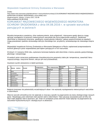Wojewódzki Inspektorat Ochrony Środowiska w Warszawie Źródło: http://www.wios.warszawa.pl/pl/aktualnosci-i-komunika/komunikaty/1219,KOMUNIKAT-MAZOWIECKIEGO-WOJEWODZKIEGO-I NSPEKTORA-OCHRONY-SRODOWISKA-z-dnia-04082.html Wygenerowano: Sobota, 4 marca 2017, 05:49 Data publikacji 04.08.2016 KOMUNIKAT MAZOWIECKIEGO WOJEWÓDZKIEGO INSPEKTORA OCHRONY ŚRODOWISKA z dnia 04.08.2016 r. w sprawie warunków panujących w jeziorach Wysokie temperatury powietrza, silne nasłonecznienie, duża wilgotność, intensywne opady deszczu mogą sprzyjać wystąpieniu w jeziorach niekorzystnych warunków dla życia organizmów wodnych. Zasobność zbiorników w substancje mineralne, gwałtowny rozwój glonów (zakwity), spływy powierzchniowe po opadach mogą powodować zjawisko okresowego deficytu tlenowego tzw. przyduchy, prowadzącego do masowego śnięcia ryb. Wojewódzki Inspektorat Ochrony Środowiska w Warszawie Delegatura w Płocku zaplanował przeprowadzenie kontroli głównych jezior województwa pod kątem panujących w nich warunków. W dniach 2-3 sierpnia 2016 roku, wykonano terenowe badania wód zbiorników z terenu powiatu gostynińskiego, płockiego i sierpeckiego. W wodach jezior oznaczono podstawowe charakterystyczne parametry takie jak: temperaturę, zawartość tlenu rozpuszczonego, nasycenie tlenem, odczyn pH oraz przewodność. Uzyskane wyniki zestawiono w tabeli poniższej. Temperatura Tlen rozpuszczony Nasycenie tlenem (oC) (mg O2/l) (%) 23,4 10,16 121 8,47 329 23,6 13,01 153 8,98 394 Ciechomickie 24,2 9,49 113,0 8,74 381 4. Górskie 23,6 9,47 111,7 8,42 415 5. Łąckie Duże 23,4 9,98 118,2 9,01 525 6. Zdworskie 23,4 9,20 107,8 8,42 444 7. Bledzewskie 24,9 9,48 114,9 8,32 261 8. Szczutowskie 25,0 7,78 94,3 7,97 438 9. Urszulewskie 25,3 10,15 123,3 8,54 323 Lp. Nazwa jeziora 1. Białe 2. Lucieńskie 3. Powiat gostyniński płocki sierpecki Odczyn pH Przewodność (µS/cm) Badania terenowe nie potwierdziły wcześniejszych obaw i nie wykazały występowania niekorzystnych warunków w zbiornikach. Obecne warunki atmosferyczne nie wpłynęły w znaczący sposób na pogorszenie się stanu ekologicznego naszych jezior. Niepokojący jest natomiast niski poziom wód w zbiornikach. Taka sytuacja zauważalna jest od kilku lat. Zbyt mała objętość wód w jeziorach, jak i brak ich przepływu przez zbiorniki może wpłynąć na pogorszenie się warunków fizykochemicznych i ekologicznych w akwenach. Jezioro Górskie Jezioro Urszulewskie Jezioro Zdworskie Suchy przepływ łączący jeziora Górskie i Ciechomnickie Data publikacji 04.08.2016 Rejestr zmian Liczba wizyt: 279 Autor: Opublikowane przez Ewa Pacholska